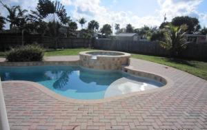 Captivating two-story home made for entertaining and comfort. Easy-access to I-95. Impress all your friend and family starting with the outside of your home with an in-ground pool with attached spa, large partial covered brick patio, outdoor kitchen, and extra grass yard space. Feel no restrictions to your activity outside with tall, wooden fence surround the sides and back of your home. The interior is also a delight with an open floor plan for the first floor with vaulted ceilings in kitchen and living area. Stone embellished fireplace in living area. Built-in shelves in dining area in kitchen. All bedrooms are located upstairs along with both full bathroom for added privacy. Half bath on first floor, Master bedroom is a cheerful cherry red color with a modern bathroom and large shower.