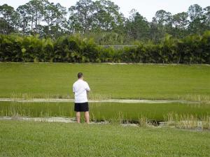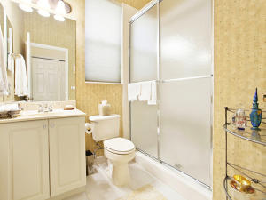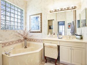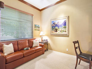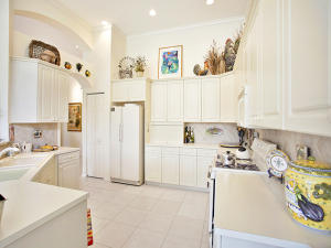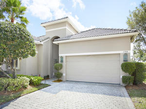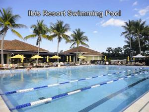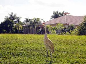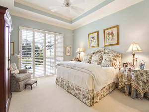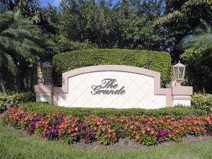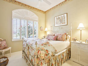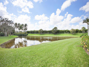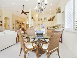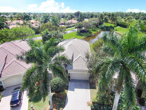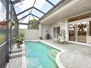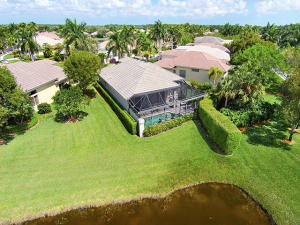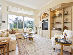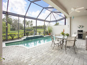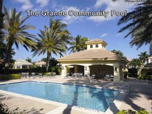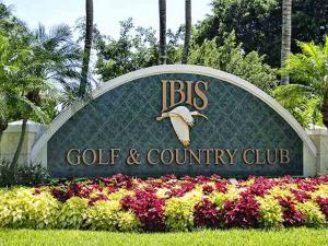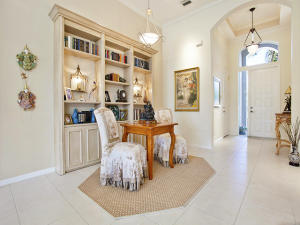 This unique, stunning home at 10788 Grande Boulevard in The Grande at Ibis Golf & Country Club sits on a pie-shaped lot with ample space between neighboring homes. When you enter the home, your eyes are drawn to the view beyond the great room to the beautiful, screened pool with the mermaid statue and the enticing water view behind it. The extended patio surrounding the pool is comfortable for sunning and dining. Outside the screened area is a garden designed with bougainvillaea and cactus plants. Back inside the house, the volume ceilings with crown molding throughout are just one of the fine features of this home. As you approach the great room, there is a game table area with stunning built-in bookcases. Opposite this area is a decorative mural in a recessed nook. Beyond this is