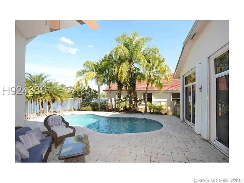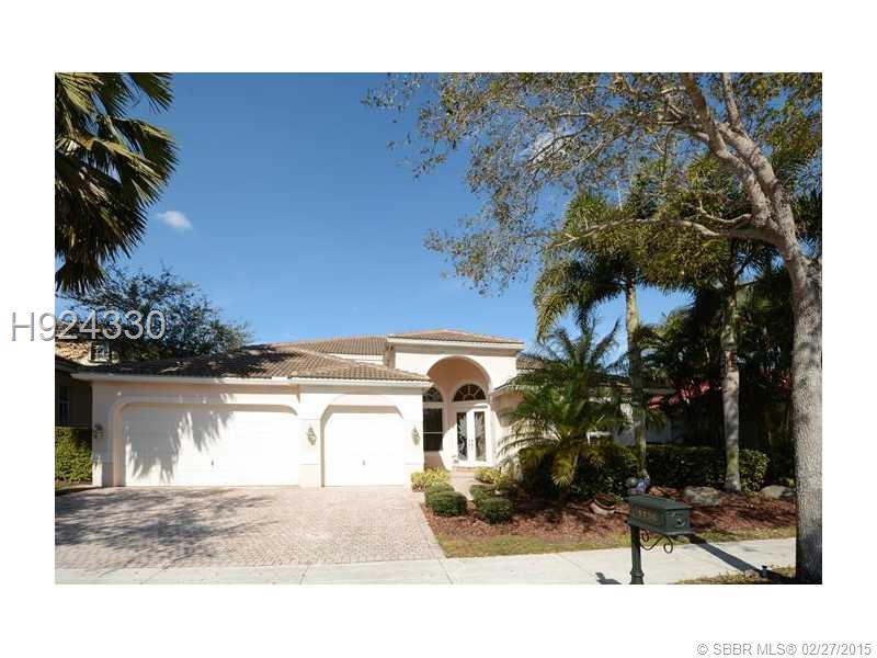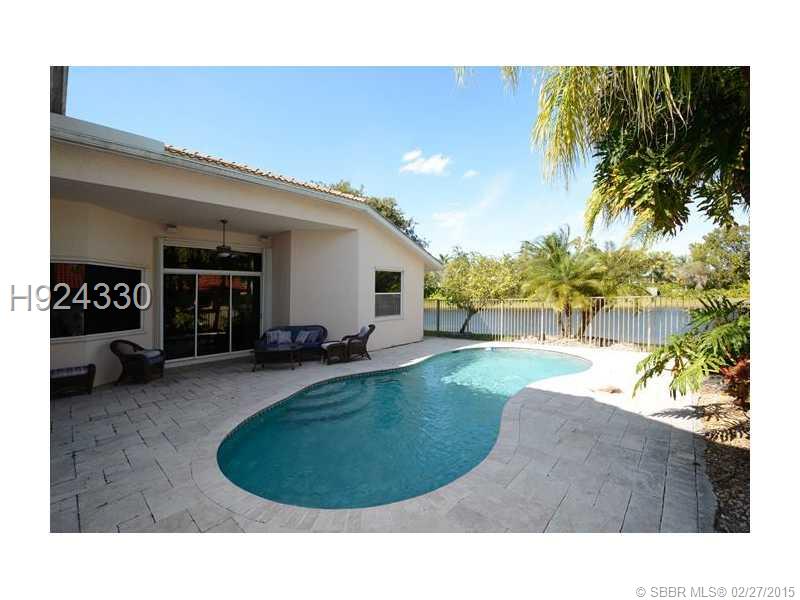 Without a doubt, this waterfront, pool home is nestled within one of Weston's most elegant communities. This spacious, one story 4 bedrooms PLUS a DEN, 3 bath home has gorgeous travertine floors throughout the common areas and laminate floors in all bedro oms. Expansive living, dining, kitchen and family room. Remodeled kitchen with 42" cabinets, granite and stainless steel appliances. Beautiful patio area overlooking pool and water. 3 car garage, pavered driveway and walkway. This home won't last.