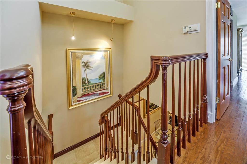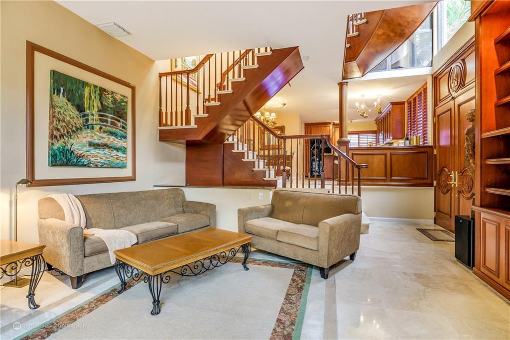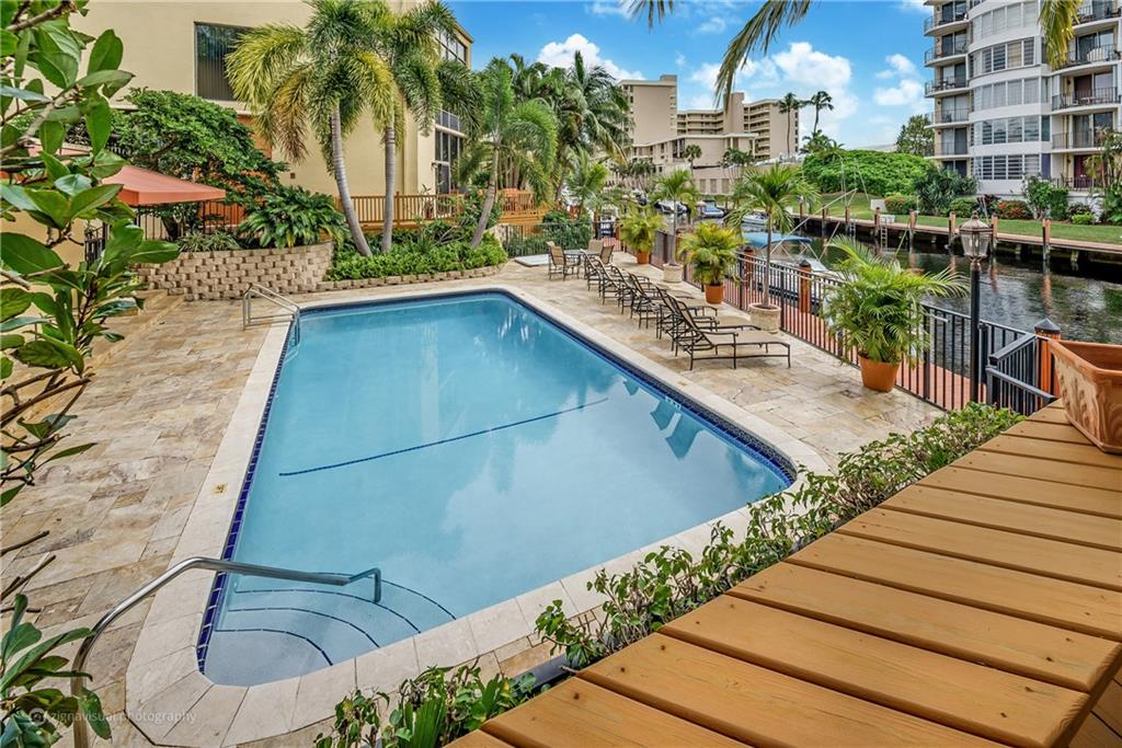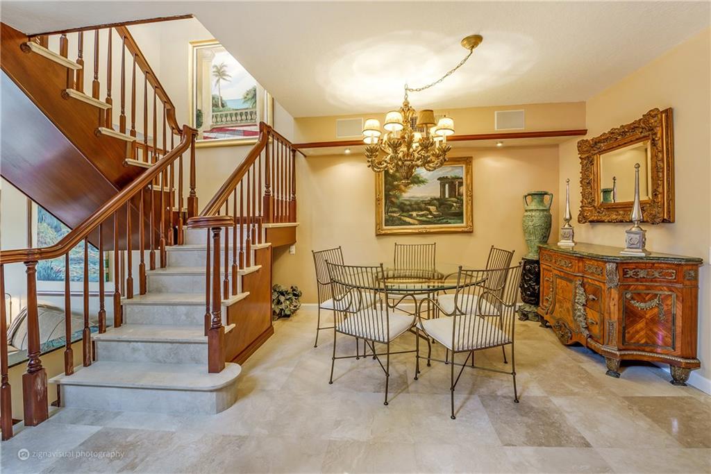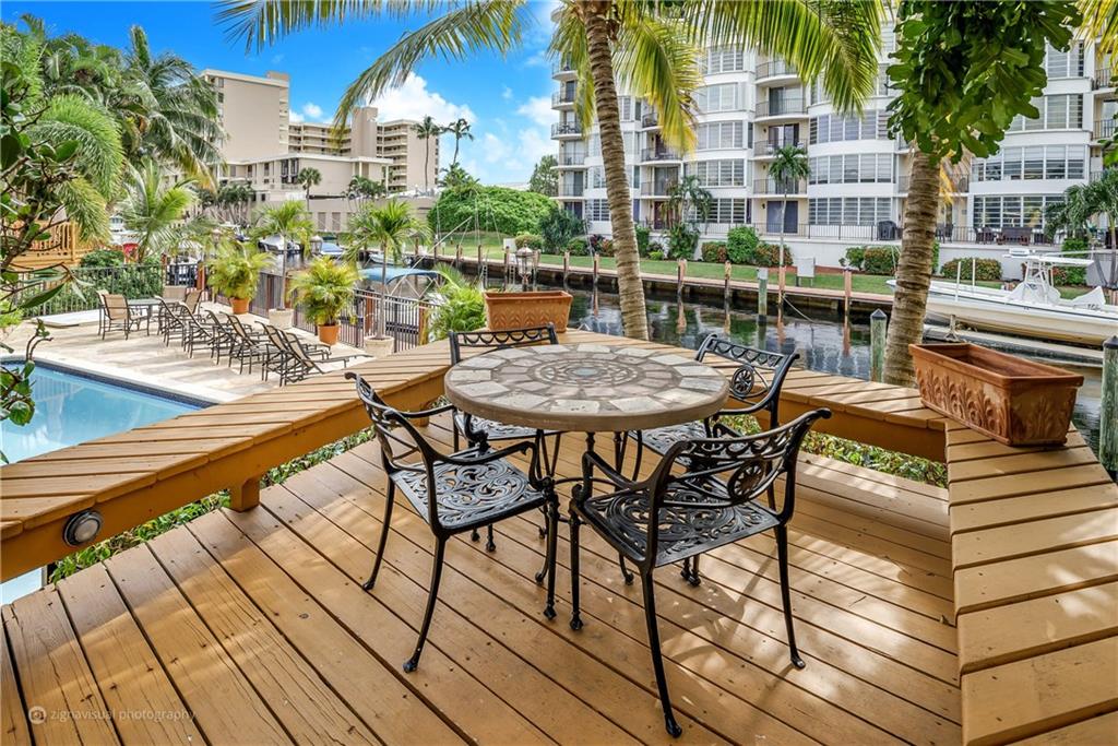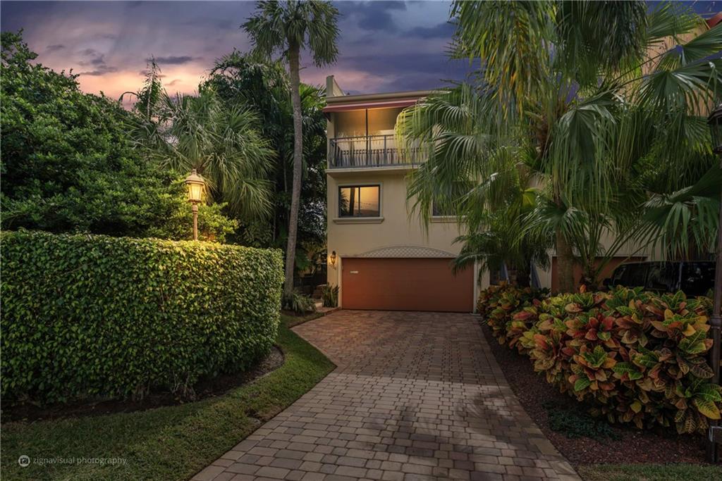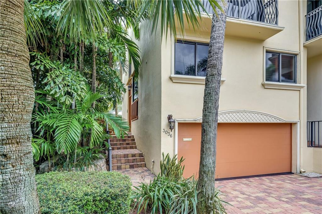 Stunning double doors w/carved seashell transom open to nestled, end-unit coach townhome. Waterfront, no fixed bridges, 32' dock facing pool, private deck, polished Italian marble & hardwood floors; marble/mahogany custom staircase meanders to loft/3rd bedrm; mahogany entertainment center. Kitchen w/granite & custom mahogany cabinets, black appliances; remodeled bathrooms w/Jacuzzi tub; tiled 2-car garage w/storage. Walk to Kaluz for martinis or over ICW to the beach! Has look & feel of private residence