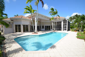 Beautiful one-story home in prime location with expansive lake and golf views. Situated on a quiet cul-de-sac street, this home features a Contemporary interior with clean lines, marble floors, lots of natural light, and an excellent floor plan that highlights the incredible views. Living room with wet bar; custom library/office with etched glass doors, master suite with exercise area, his & her baths, and generous closets. Kitchen opens to family room & breakfast area. All guest bedrooms are en-suite. Outdoors, a circular driveway, accordion hurricane shutters, a large screened-in lanai with Summer kitchen, sunny patios, large pool, and gorgeous lake and golf views.