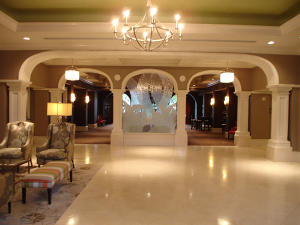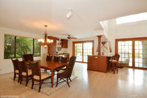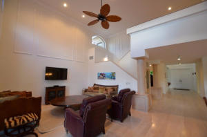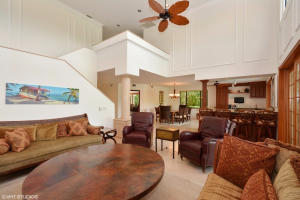 Beautifully renovated and bright home with both golf and lake views. Amazing value! Stone and wood flooring throughout living area. Newer roof. Spacious gourmet kitchen with center island and granite counters is open to a cozy family room. The two story living room has detailed wall and crown moldings. Formal dining area plus an additional entertaining area featuring custom wood built-in cabinets, a wet-bar and refrigerator. Large first floor bedroom and cabana bath could serve as a master bedroom or guest quarters. Front windows are hurricane resistant.