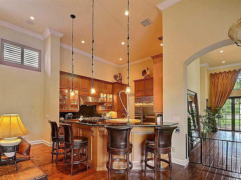Sited on a fully fenced corner waterfront lot, this stunning courtyard home in prestigious Hawks Landing begins with a dramatic entry into luxury living. With hand-carved hickory wood and marble floors throughout. the stunning interior boasts a wide open Great Room with formal dining and oversized gourmet kitchen w/6-burner gas cooktop, double stacked custom cabinets, granite tops, island w/wine cooler, all SS appliances Viking & SubZero. Staircase with iron railing, built-In bbq, Just painted ext.,more.