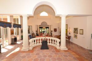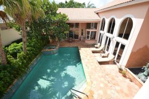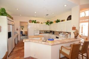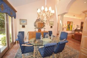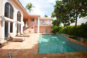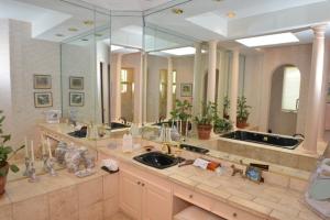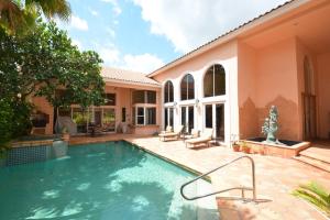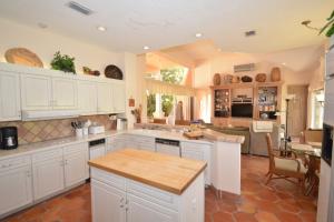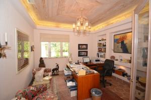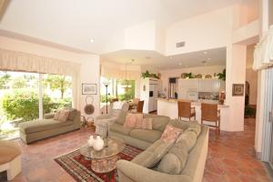 Beautiful custom-built Mediterranean-villa-inspired courtyard home with guest house plus golf course views. New theater/media room in stunning high-gloss cherry wood with coffered ceilings, automated lighting & sound system. Incredible wine room: temperature-controlled and air-conditioned with dramatic leaded glass double doors. Spacious floor plan with 3 bedrooms in the main house and one bedroom plus sitting room, kitchenette, and full bath in the second floor guest house which features a terrace overlooking the large pool and patio area. Guest bedrooms are en-suite. large master suite features a fireplace and sitting area. The light and bright kitchen is open to a large family room. Huge windows, architectural details, French doors, quarry tile, plantation shutters, and more.