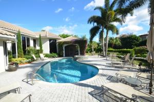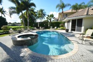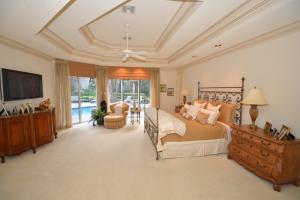 This fabulous 5-bedroom + office home is situated on a beautiful oversized lot. The interior features an open floor plan, marble floors, crown moldings, neutral colors, and lots of natural light. The master suite, along with 2 guest bedrooms, are on the ground floor, and 2 en-suite bedrooms are upstairs. The large, bright, updated kitchen has granite countertops and opens to the breakfast area and family room. Extra-large windows extend along the kitchen and breakfast area, providing verdant views. A large screened-in patio adjoins the family room and complements the lushly landscaped pool, patio, and lawn areas that offer a Southern exposure, privacy, and beautiful expansive water and golf views.
