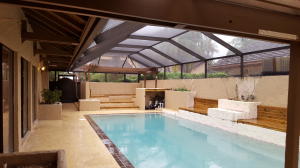 Beautifully updated and recently painted 3BR/2BA unique one story Mediterranean home with secluded pool with a tremendous entertainment oriented patio area with party seating that surrounds the pool Terra cotta tile floors & new carpeting in Bedrooms. Wood beamed ceilings and a Built-in wet bar, new kitchen cabinets/counters. Upgrades abound. Master walk-in cedar closet. Decorative wood burning fireplace in family/living area. New 2 car Hurricane rated garage doors with automatic door opener. Large screened enclosed pool patio with new wood deck & new pool equipment. Newer dual zoned central HVAC system. Patios Del Mar II is a non-gated community. Dues cover common grounds & basic cable.