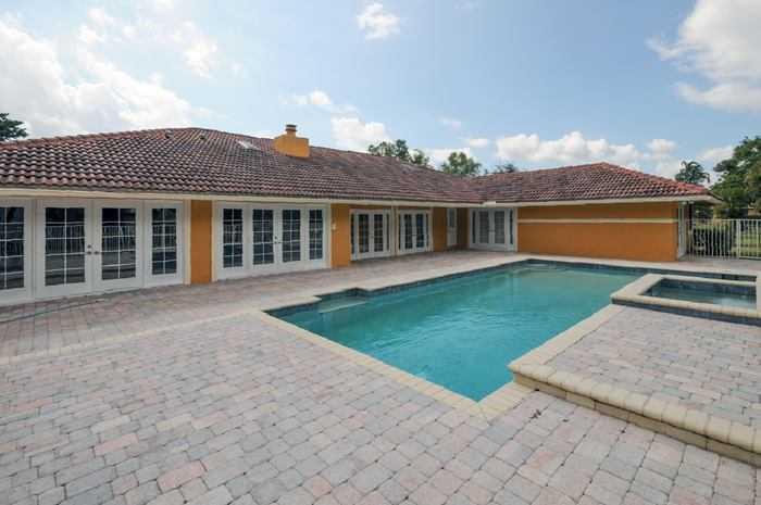 Great family home with 6 bedrooms, 3 full baths, 2-car garage located on an acre+ cul de sac location- open heated pool and spa; updated bathrooms and wood kitchen cabinets with granite counter tops and stainless steel appliance. Hurricane shutters on a ll windows and doors, French doors thru out, newer roof in 2002; all new ac units, wood burning stone fireplace in formal living room, split bedroom plan and much more.