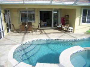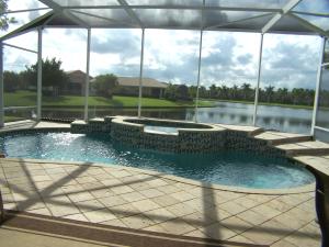 Enjoy the sunsets from your screened patio or your own heated saltwater pool with waterfall & hot tub! Beautifully updated 3/2 waterfront home. Open floor plan. Active resort style 55+ community. Accordion shutters, screened entry & recently enlarged bird cage surrounding pool & covered patio. Tile on diagonal, crown molding, chair rails, custom mirror in dining area. Eat in kitchen with granite counters & back splash, 42'' cabinets, cook island, pantry & recently replaced stainless steel appliances including a Bosch dishwasher opens to family room. Large tiled master with lake view & walk in closet. Master bath hosts dual sinks, soaking tub & separate shower. Guest bath also has walk in shower. Intercom system. Baywinds is pet friendly & close to shopping, dining & entertainment.