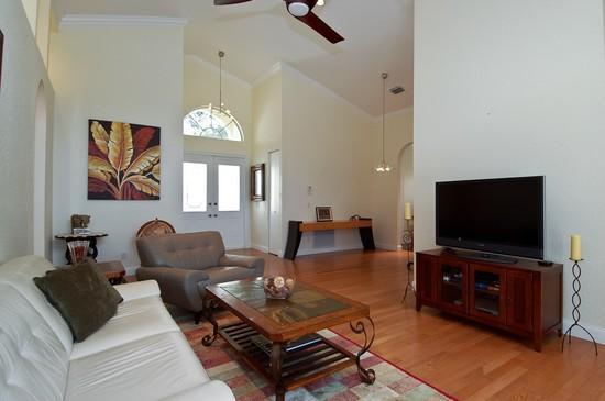 Totally remodeled thru-out. Real wood floors, custom kitchen & baths. Contemporary cabinets, Brazilian granite countertops, pendant lighting, & stainless steel appliances & hood, all top of line! Vaulted ceilings, French doors, contemporary window treatme nts & plantation shutters. Custom closets with beautiful wood built-ins. Specially treated windows for quiet & cool interior. Pool with paver patio on water, very private. Fabulous 24 hr. guard gated community with pool, tennis, playground & more!!