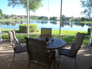 Enjoy a striking lake view in this beautifully maintained home! The roof & outside of the home have recently been power washed! The outside of the home hosts accordion hurricane shutters, screened entry & screened patio, gutters all around & tropical landscaping! Screened & covered patio faces north so you always have shade while enjoying the lake view! Inside, you have upgraded tile throughout. Master bedroom has recently replaced carpet, tray ceiling, large walk in closet, Hunter Douglas window treatments & a great lake view! Master bath hosts dual sinks, Jacuzzi tub & separate shower. Eat in kitchen has a pass through with a view & all appliances are covered by a service contract. Great room has custom window treatments, dry bar, extra high hats & triple sliding doors! Move in ready!