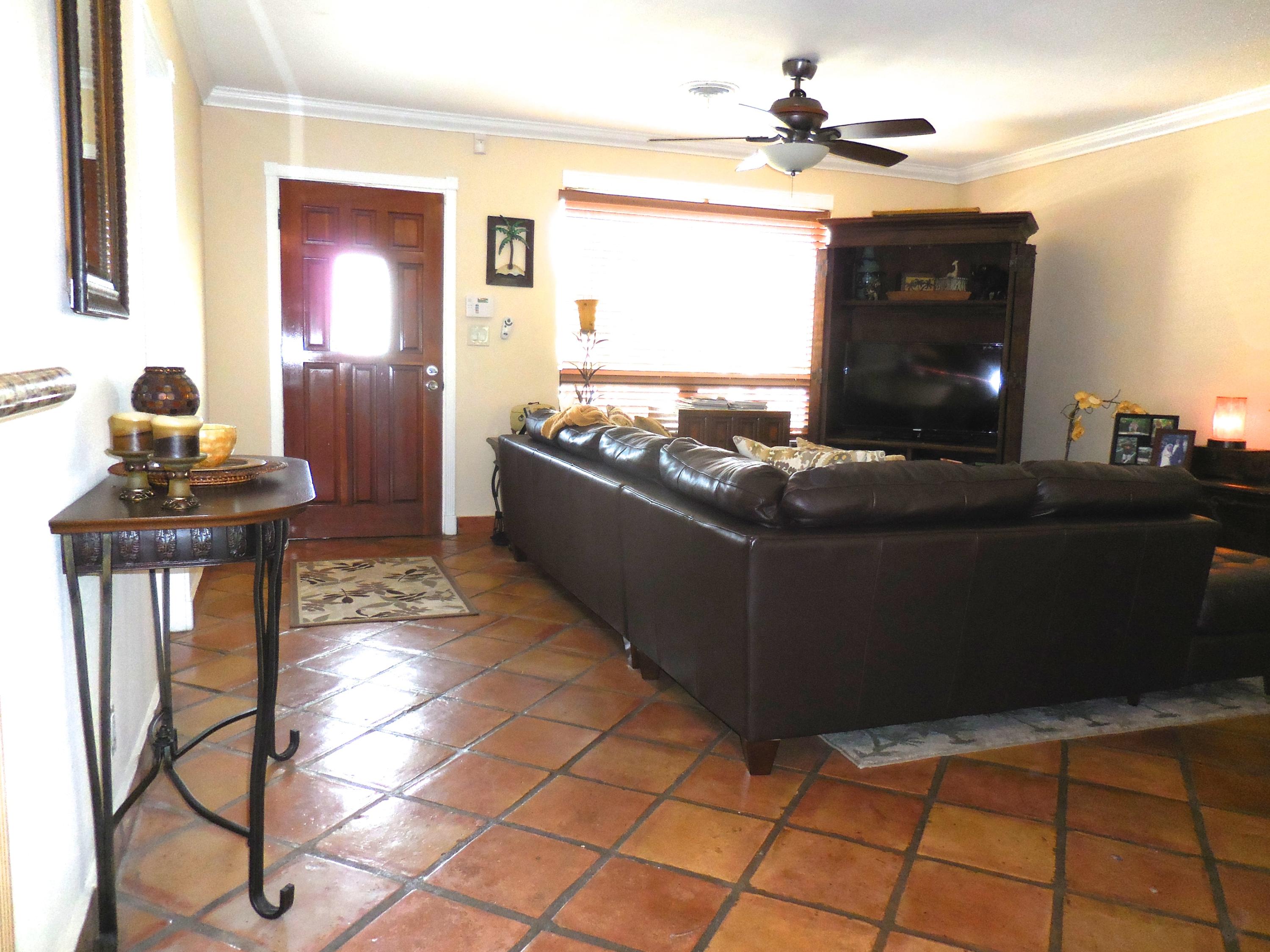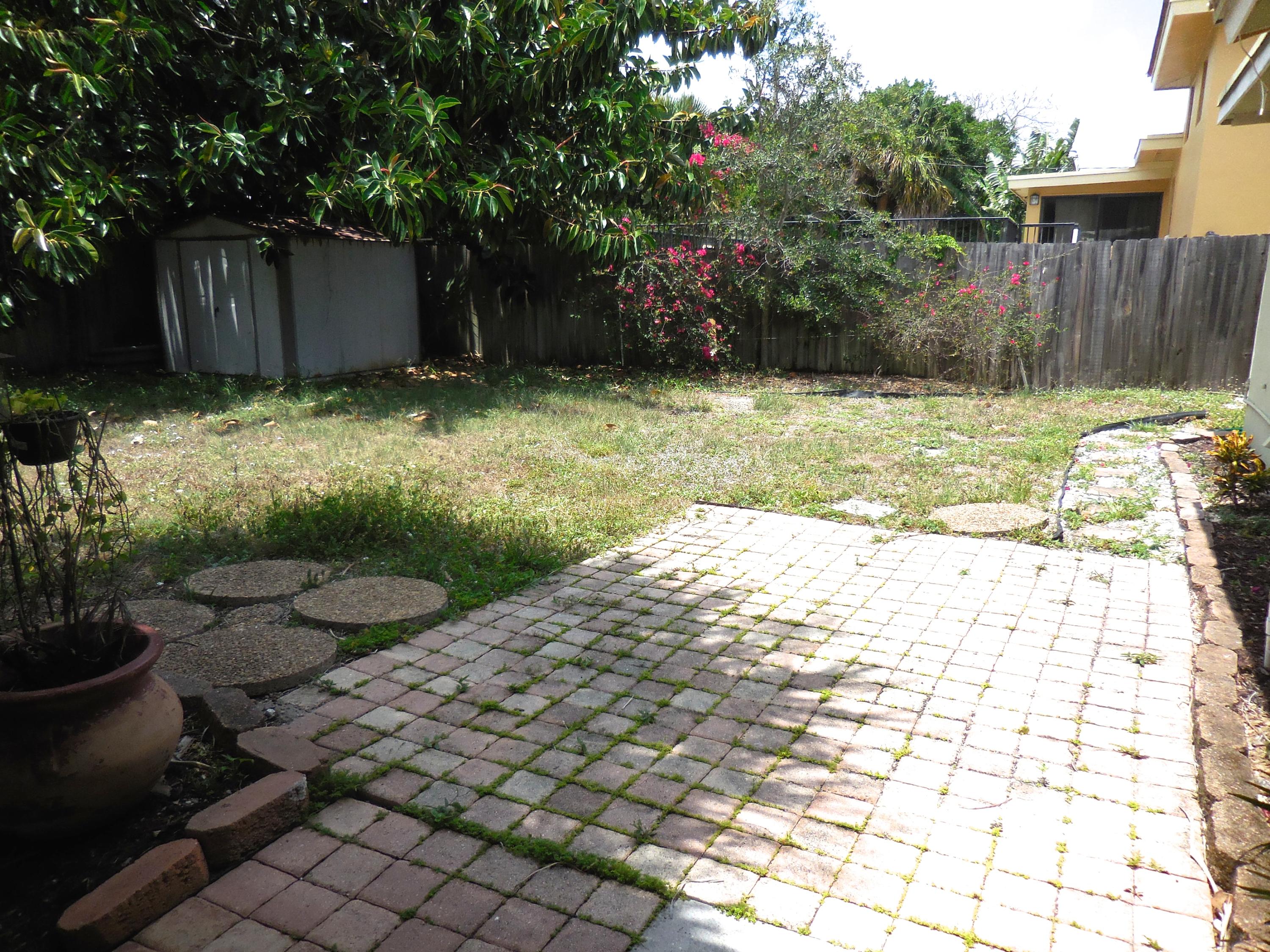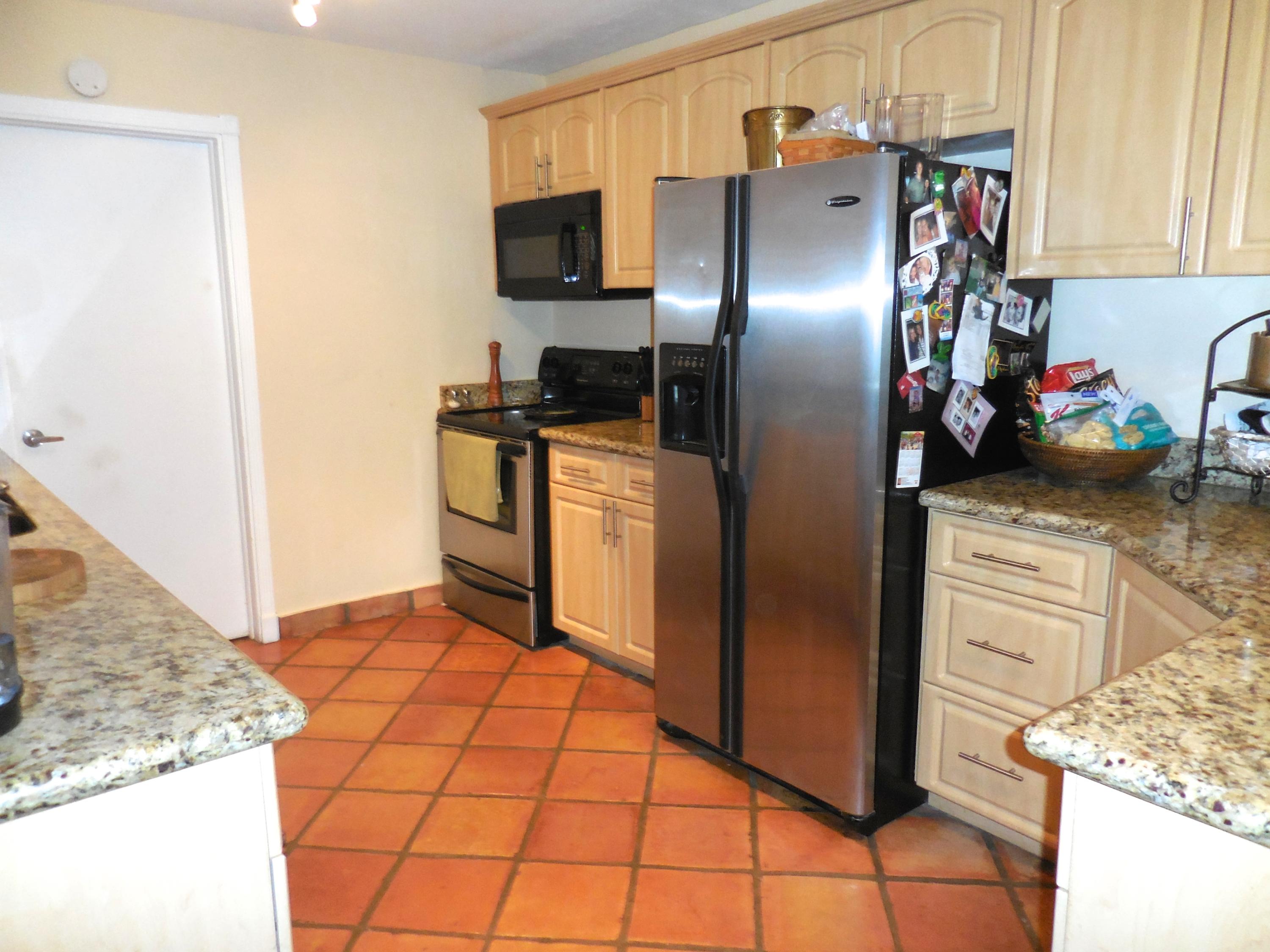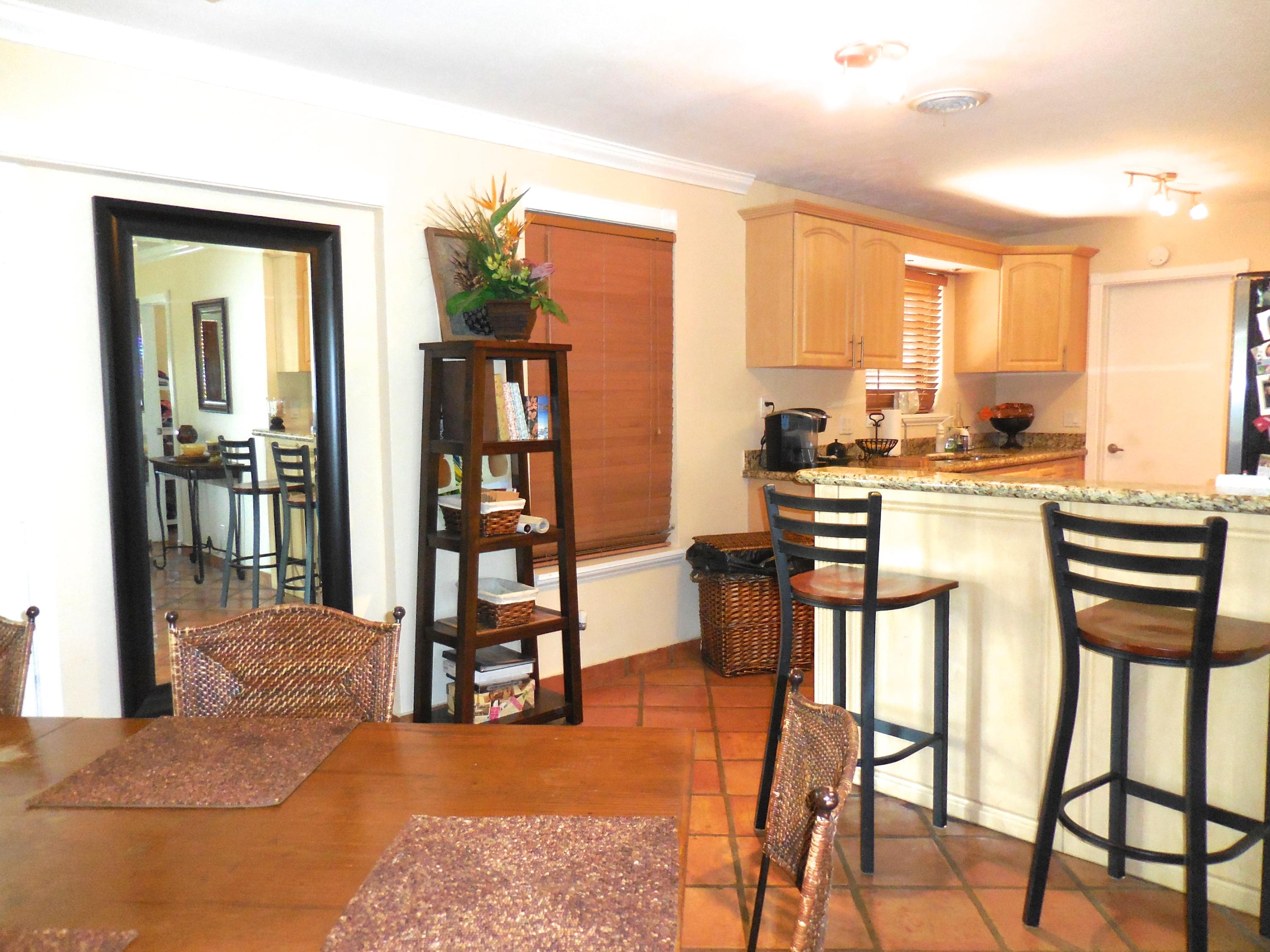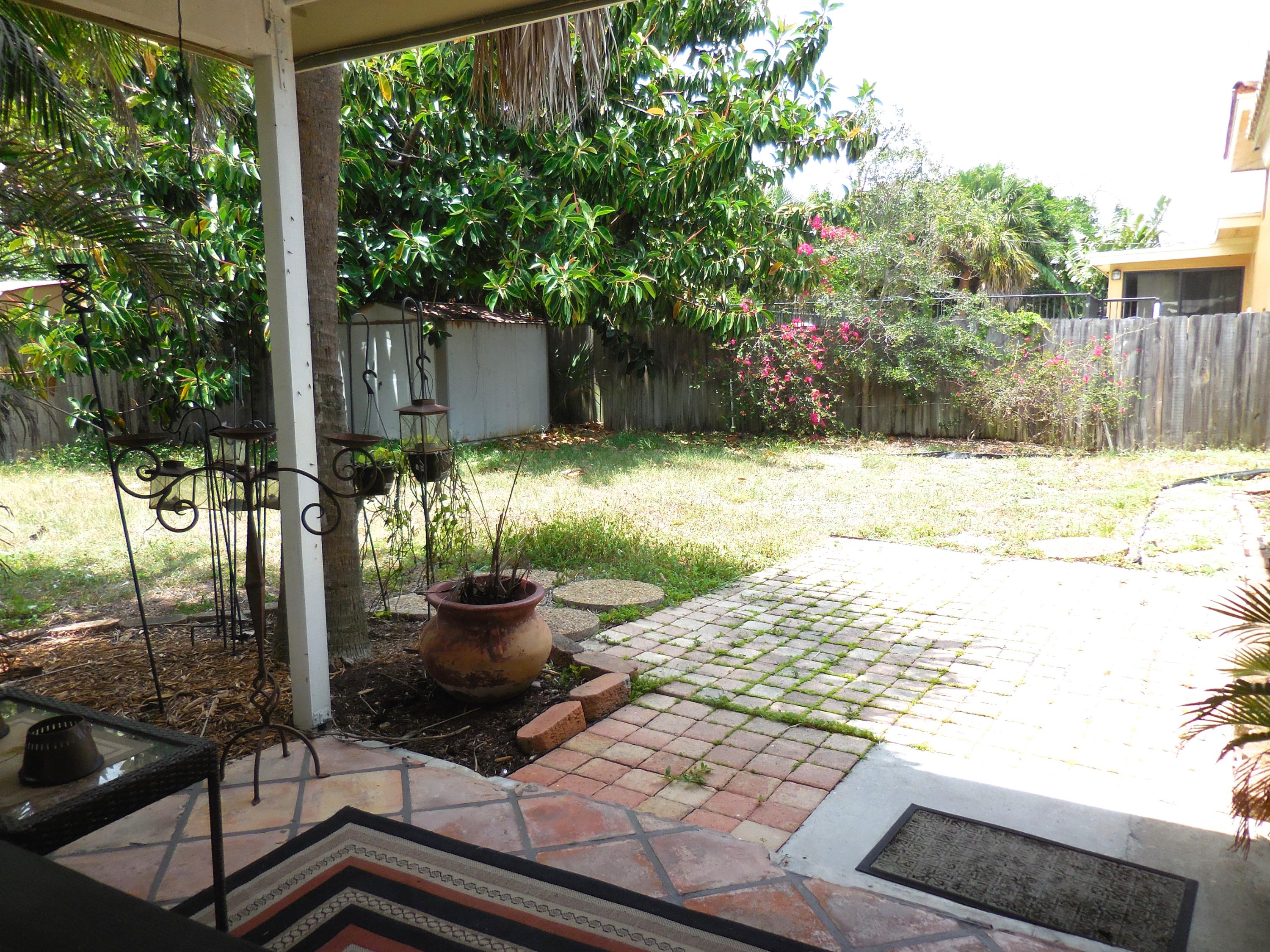 CBS single story home in east Boca, with no association fees! 3 bedrooms, 2 baths and carport in this updated home. Mexican tile floors thruout the entire interior, and french doors to backyard patio. Granite kitchen, wood cabinets opened up to living room/dining area. NEW ELECTRIC PANEL . STORM SHUTTERS. 2014 HWH. Updated baths with granite counters, new vanities, tiled walls. TERMITE BOND. Approx 8x10 covered patio, shed, plus huge fenced yard. Split bedroom plan for privacy. Interior washer/dryer and storage area.