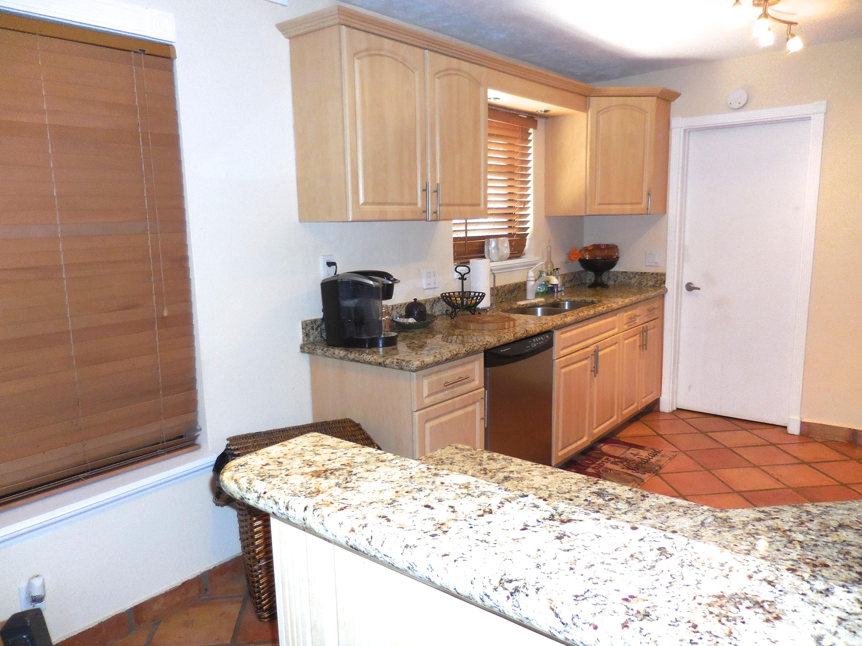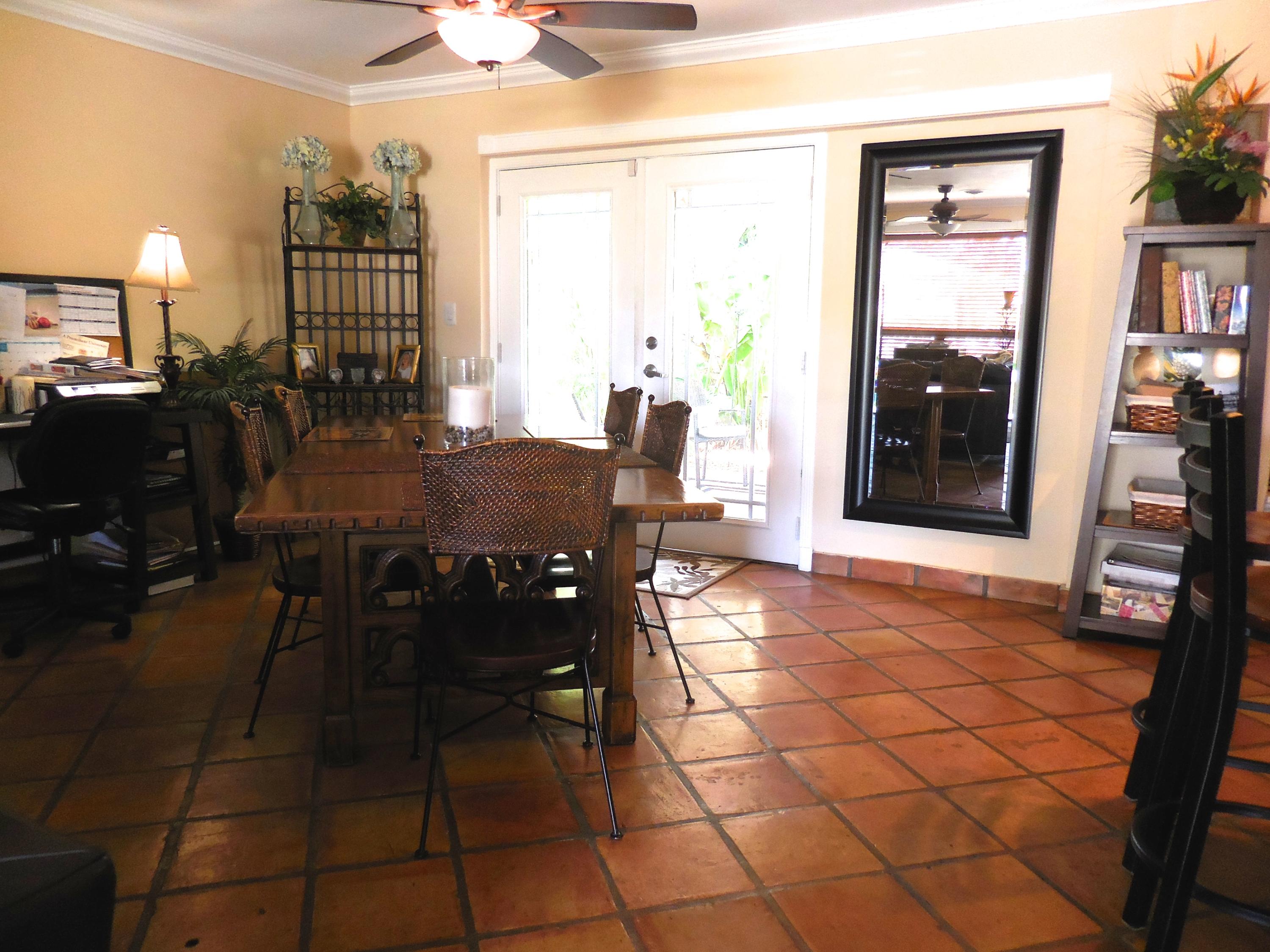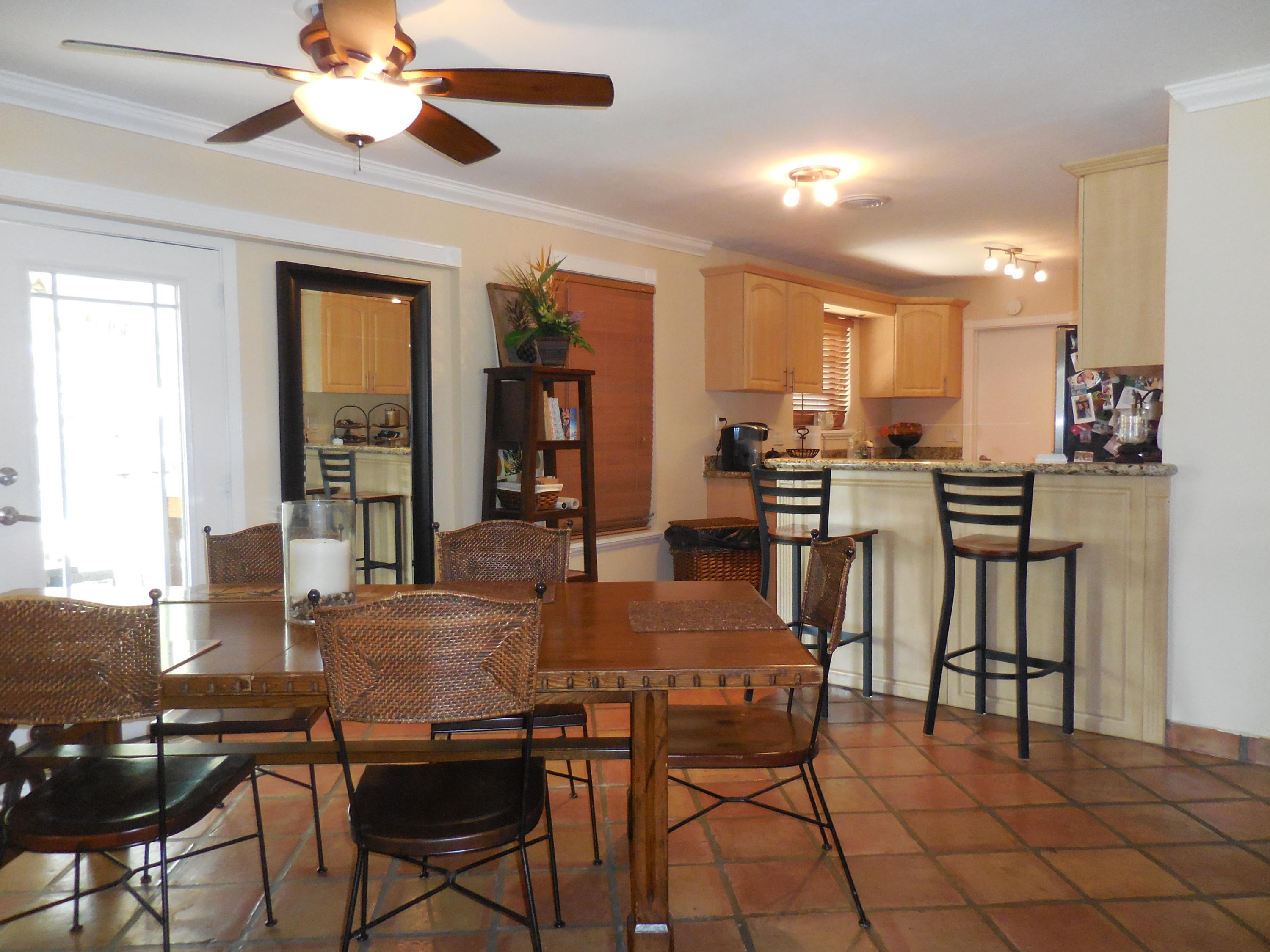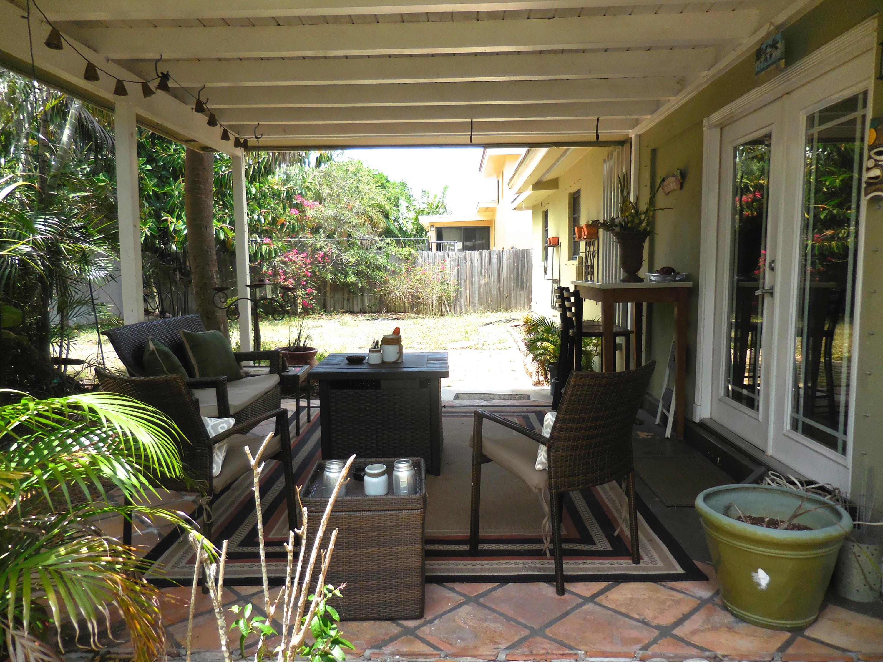 CBS single story home in east Boca, with no association fees! 3 bedrooms, 2 baths and carport in this updated home. Mexican tile floors thruout the entire interior, and french doors to backyard patio. Granite kitchen, wood cabinets opened up to living room/dining area. NEW ELECTRIC PANEL . STORM SHUTTERS. 2014 HWH. Updated baths with granite counters, new vanities, tiled walls. TERMITE BOND. Approx 8x10 covered patio, shed, plus huge fenced yard. Split bedroom plan for privacy. Interior washer/dryer and storage area.