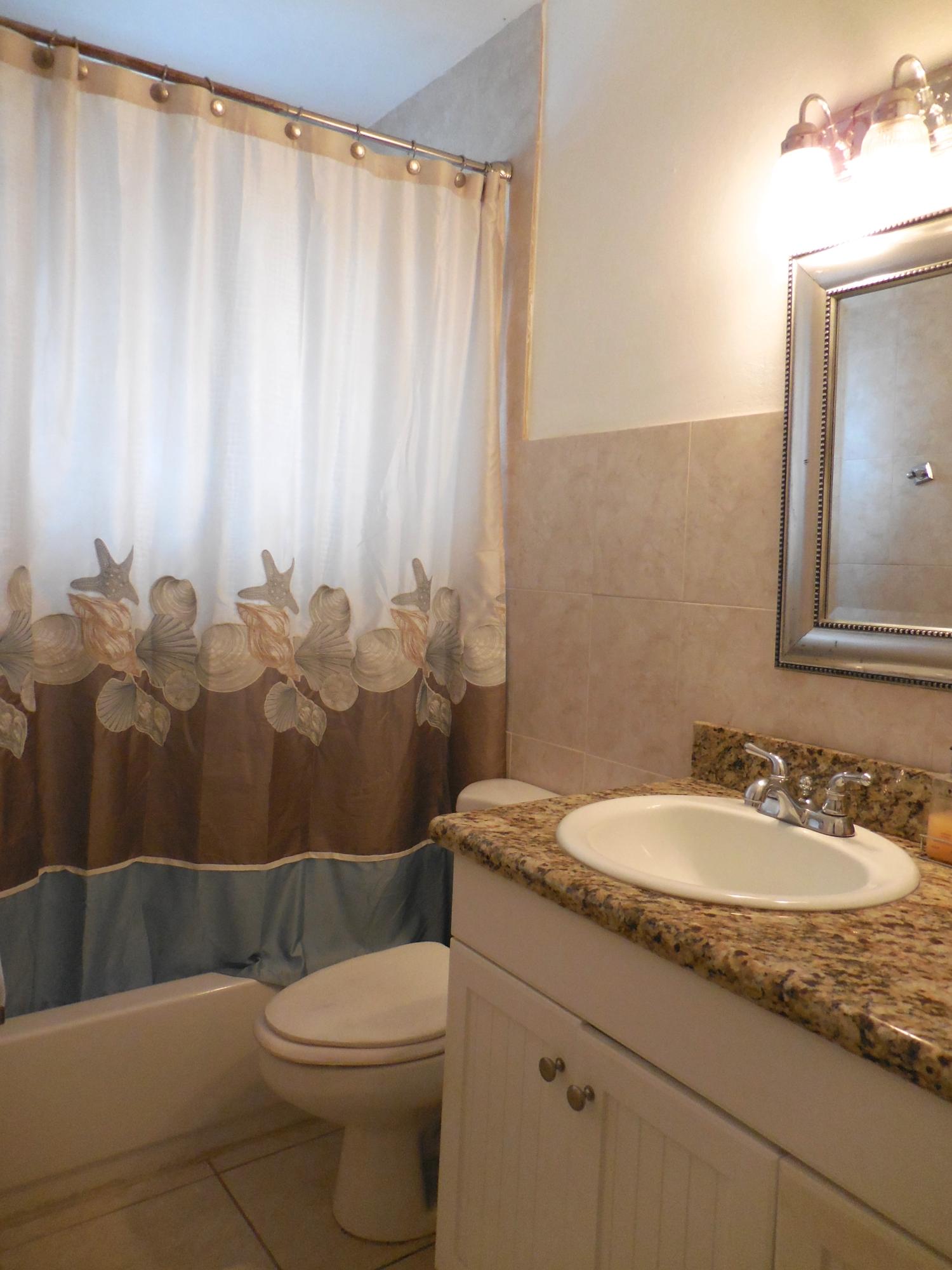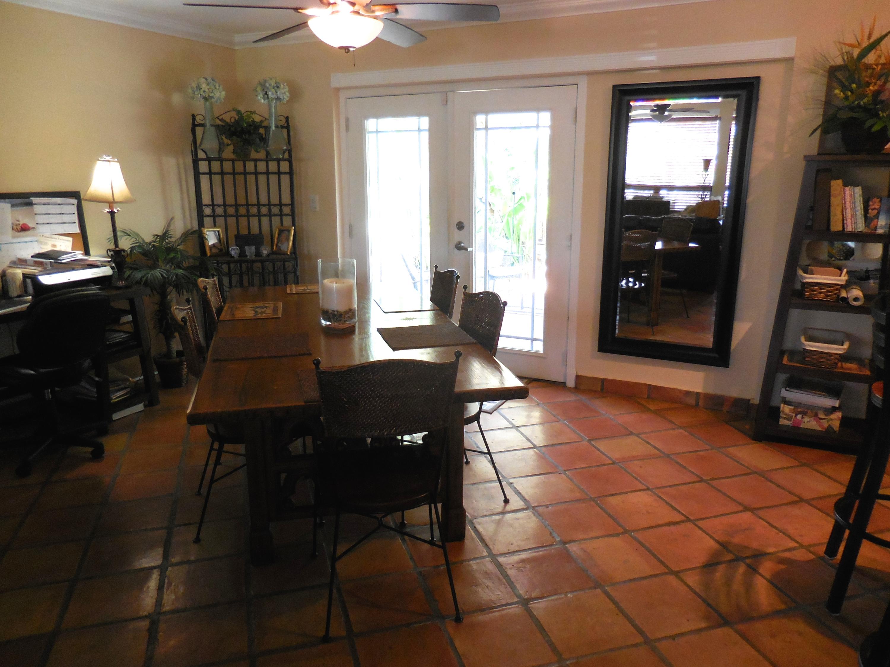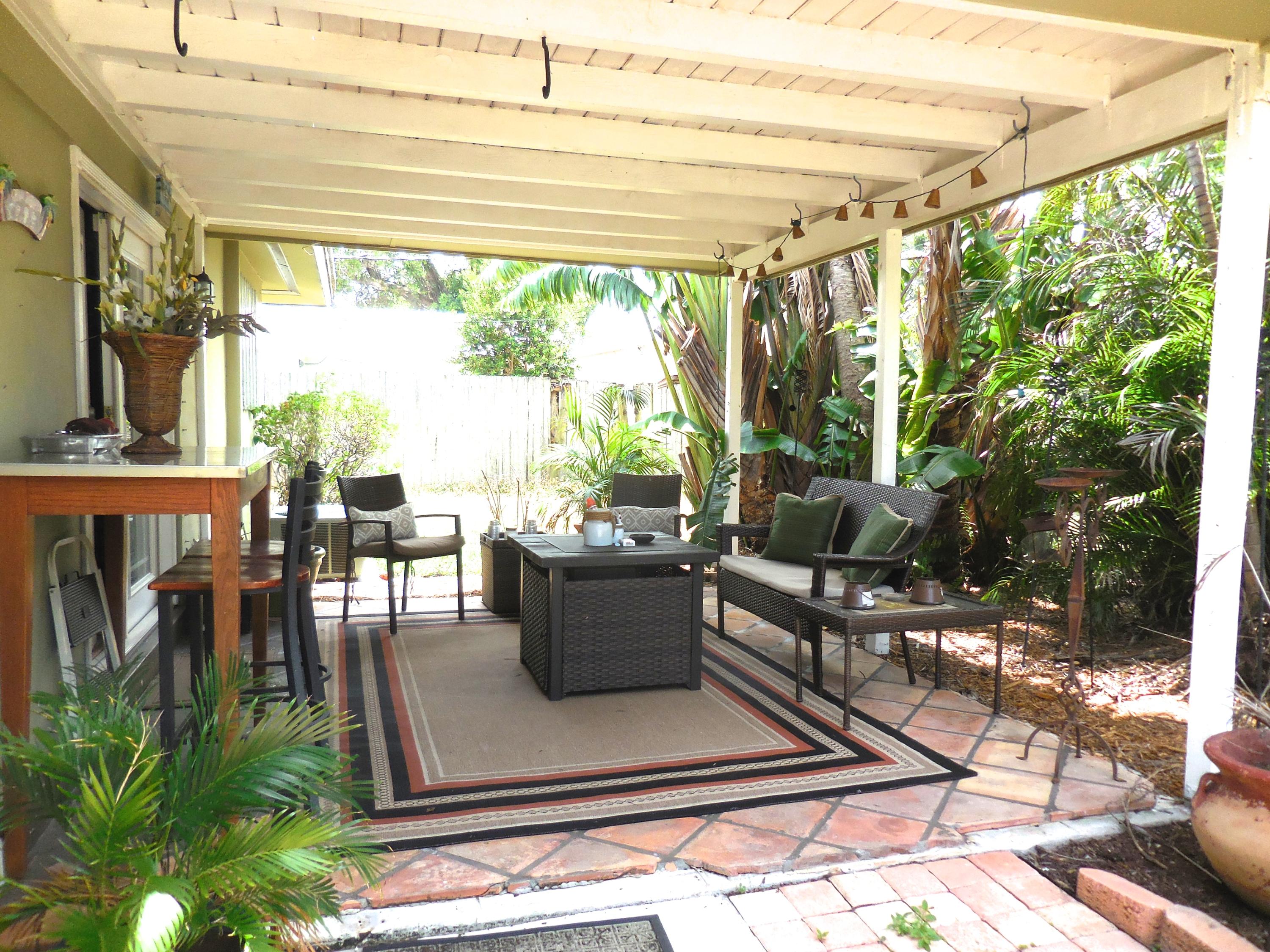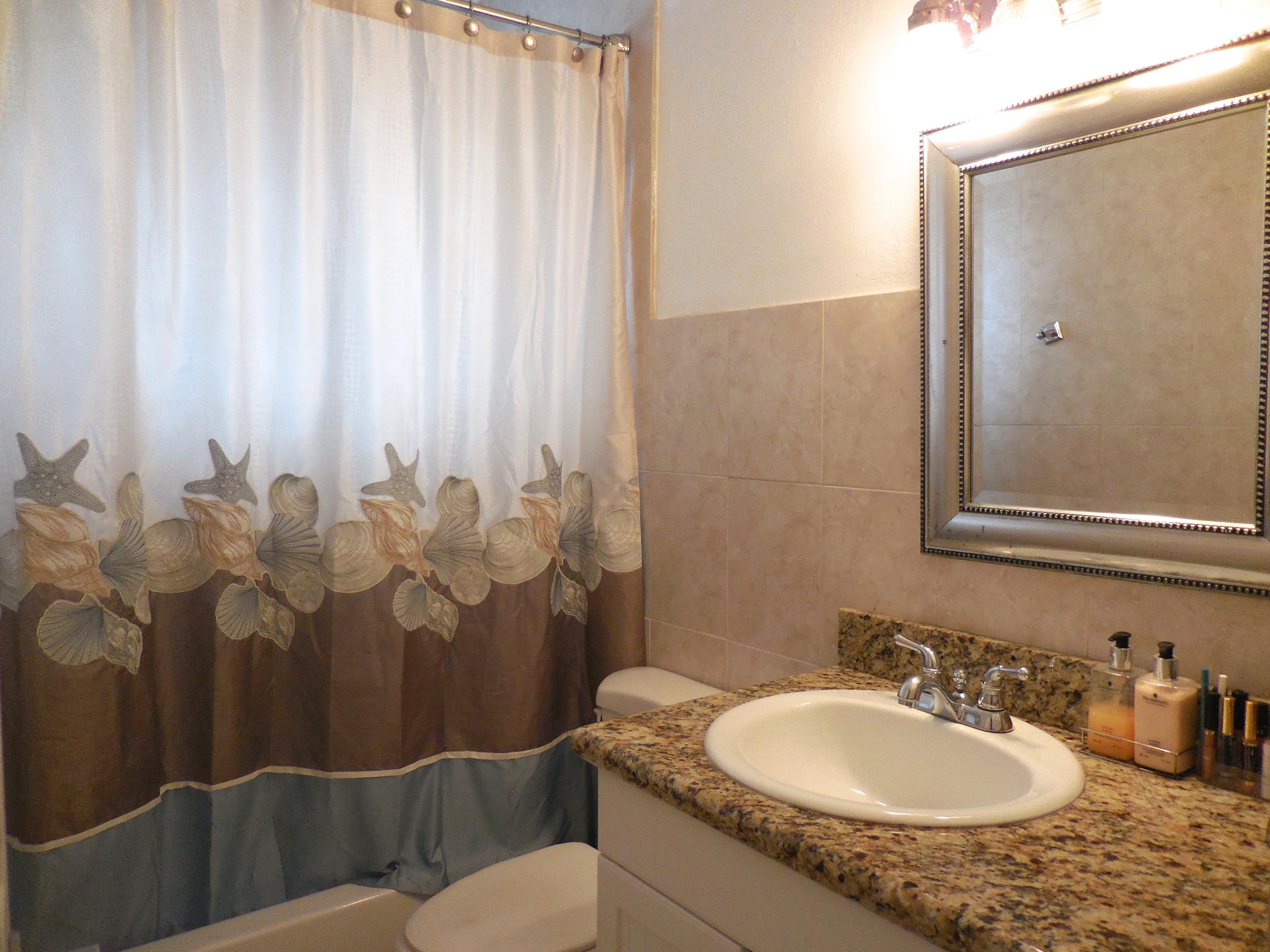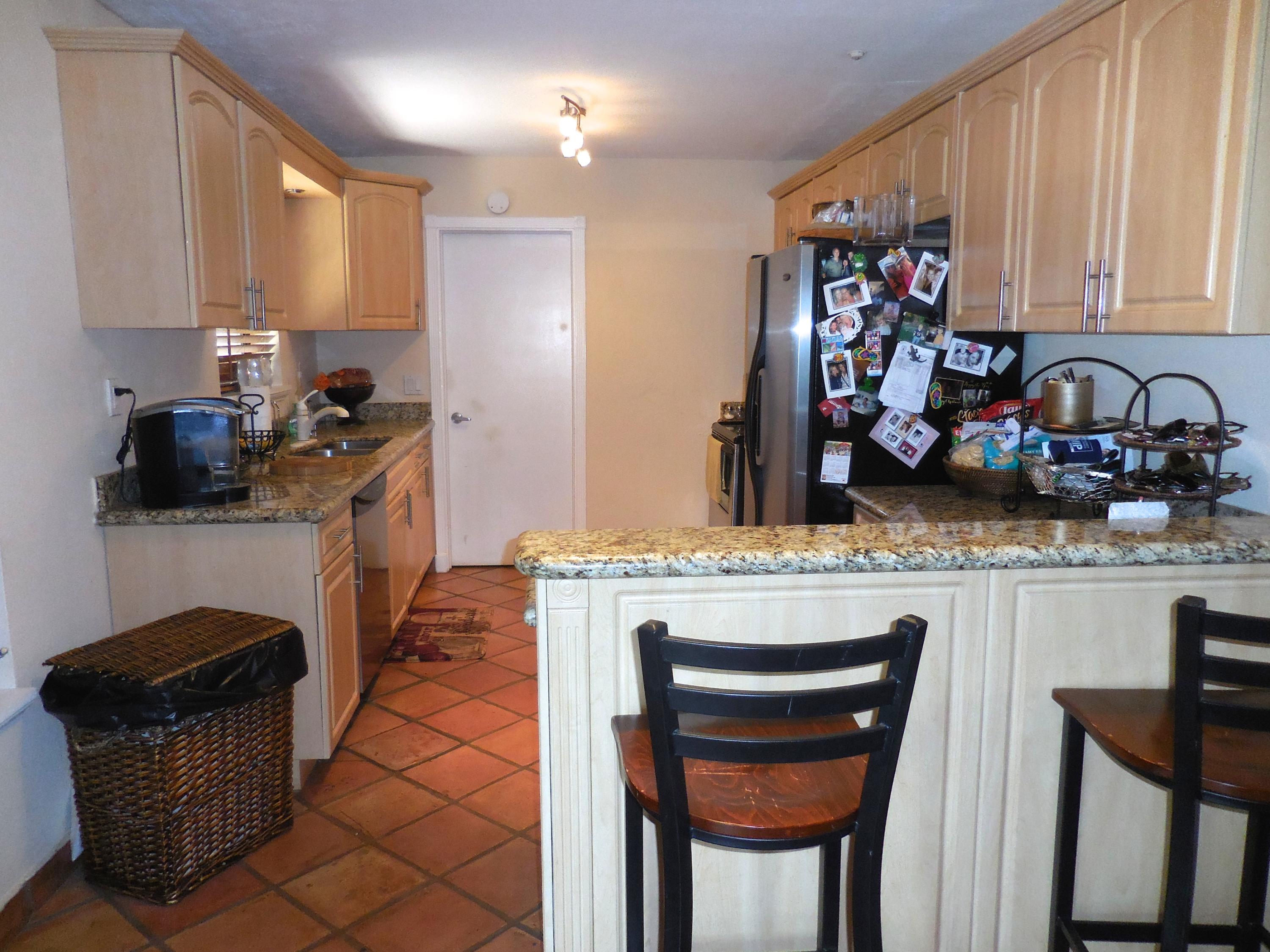 CBS single story home in east Boca, with no association fees! 3 bedrooms, 2 baths and carport in this updated home. Mexican tile floors thruout the entire interior, and french doors to backyard patio. Granite kitchen, wood cabinets opened up to living room/dining area. NEW ELECTRIC PANEL . STORM SHUTTERS. 2014 HWH. Updated baths with granite counters, new vanities, tiled walls. TERMITE BOND. Approx 8x10 covered patio, shed, plus huge fenced yard. Split bedroom plan for privacy. Interior washer/dryer and storage area.