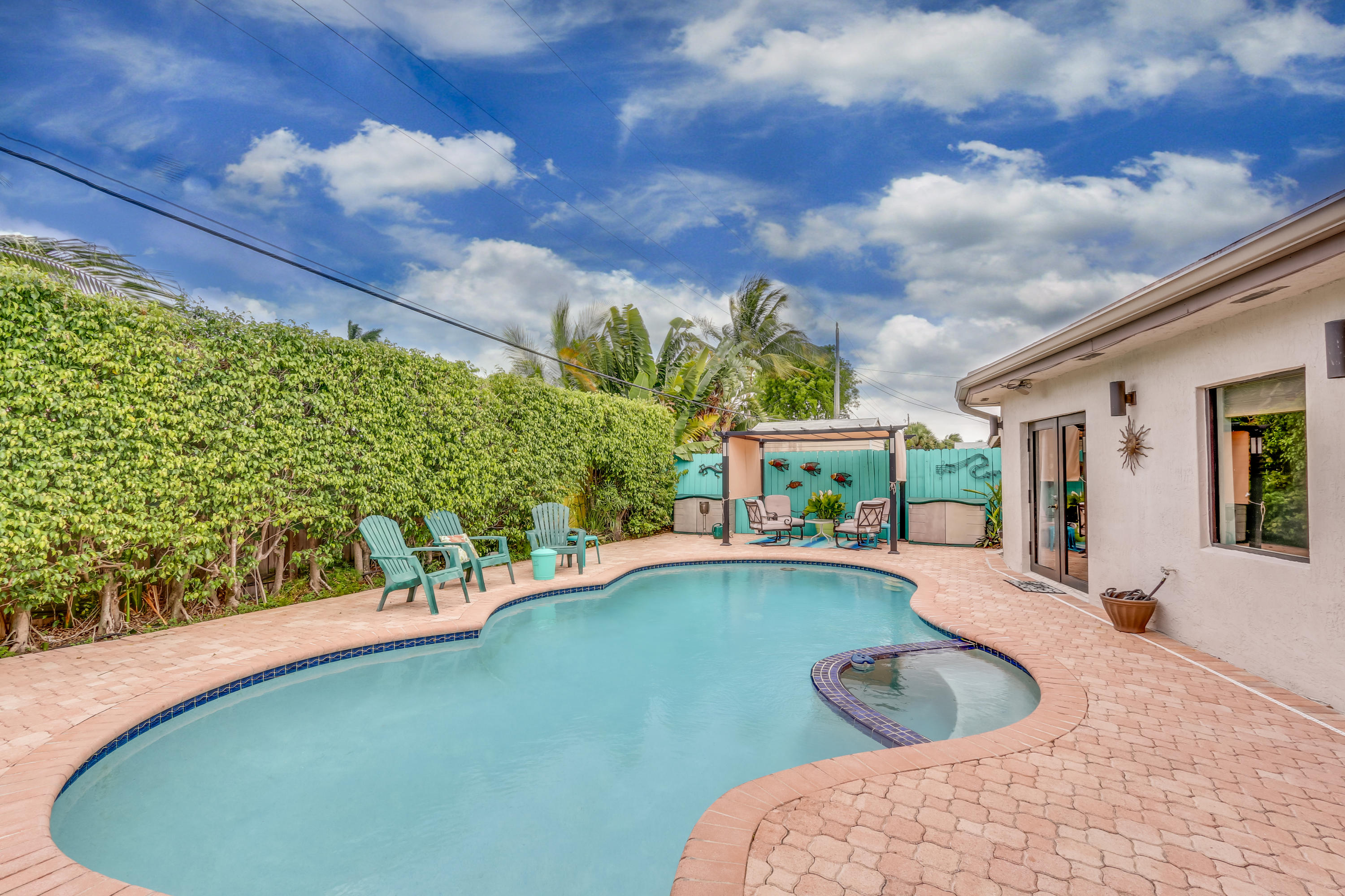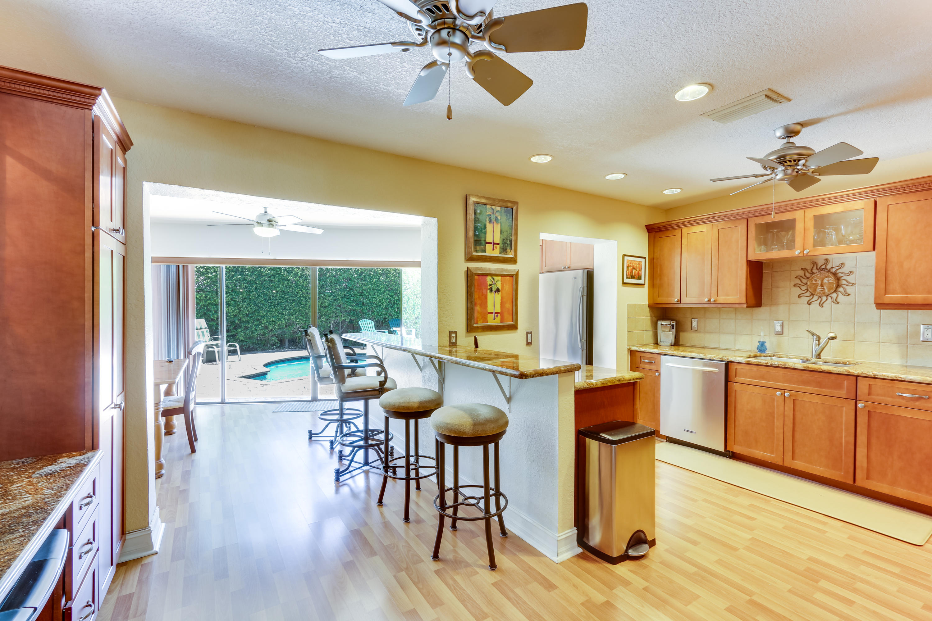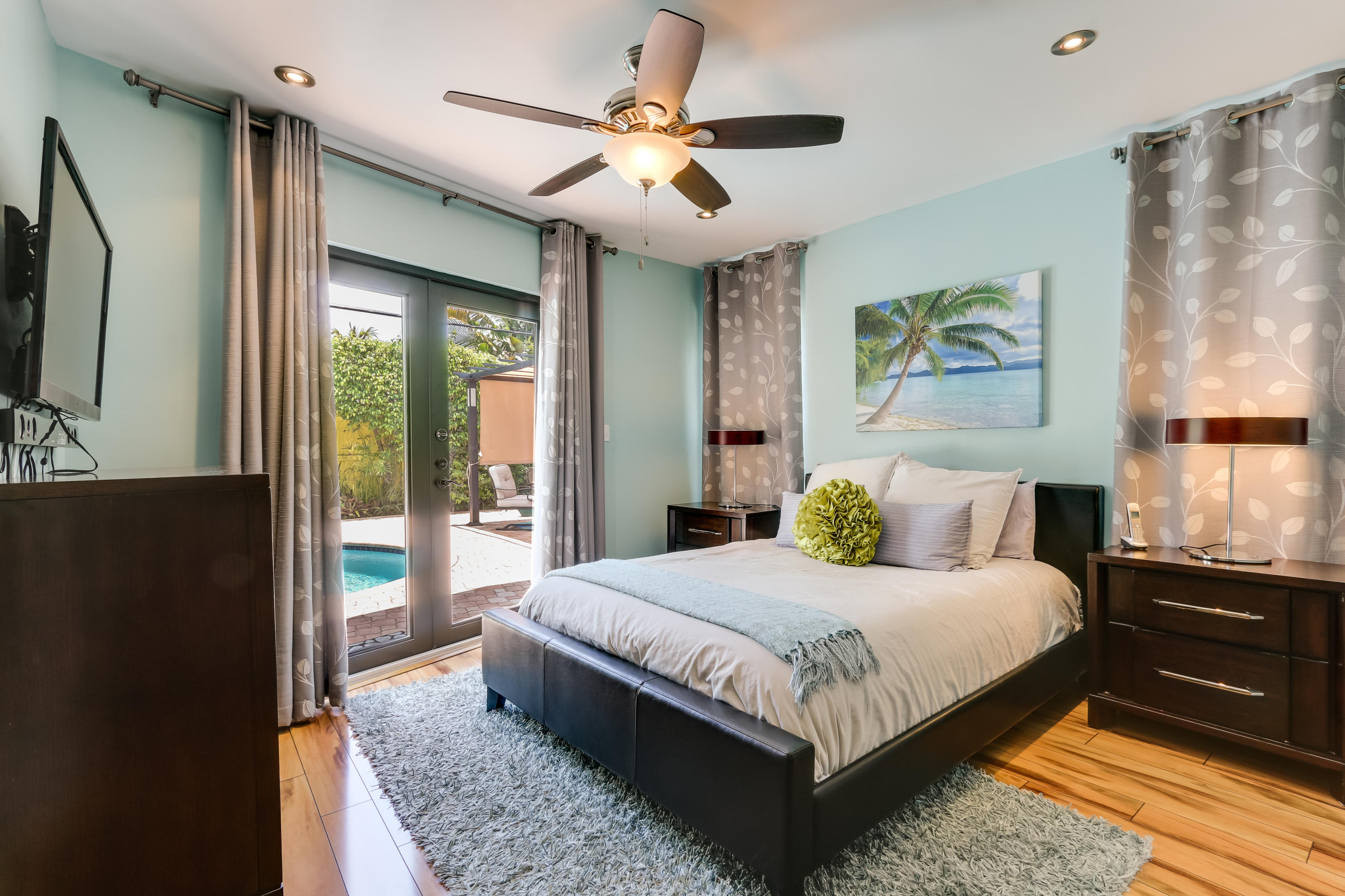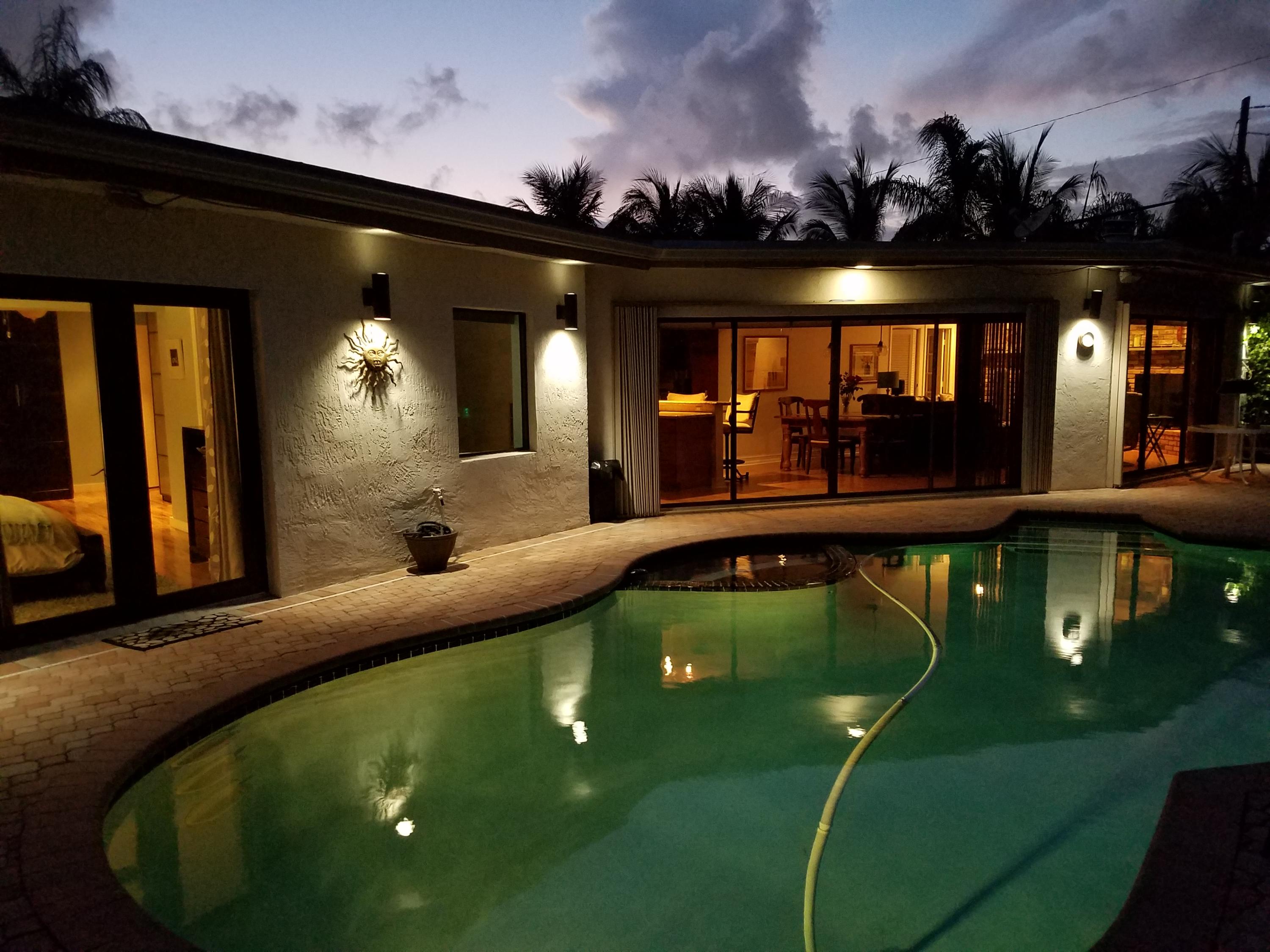 Private oasis in a great location!! This beautifully updated 3 bedroom 3 bath home with a magnificent pool has everything you could want. Walk through the front door to an open split bedroom floor plan with spectacular pool views from all over the home. The ample front living room is light and bright with a large window. The sizable kitchen features beautiful granite, stainless steel appliances, double oven, abundant storage and counter space, as well as a long bar for entertaining. The kitchen overlooks the open dining room and second spacious living area with an amazing fireplace. The master bedroom is one of a kind with floor to ceiling wardrobes in its own dressing room. The room has french doors overlooking the tropical pool, and a completely renovated master bath with dual sink