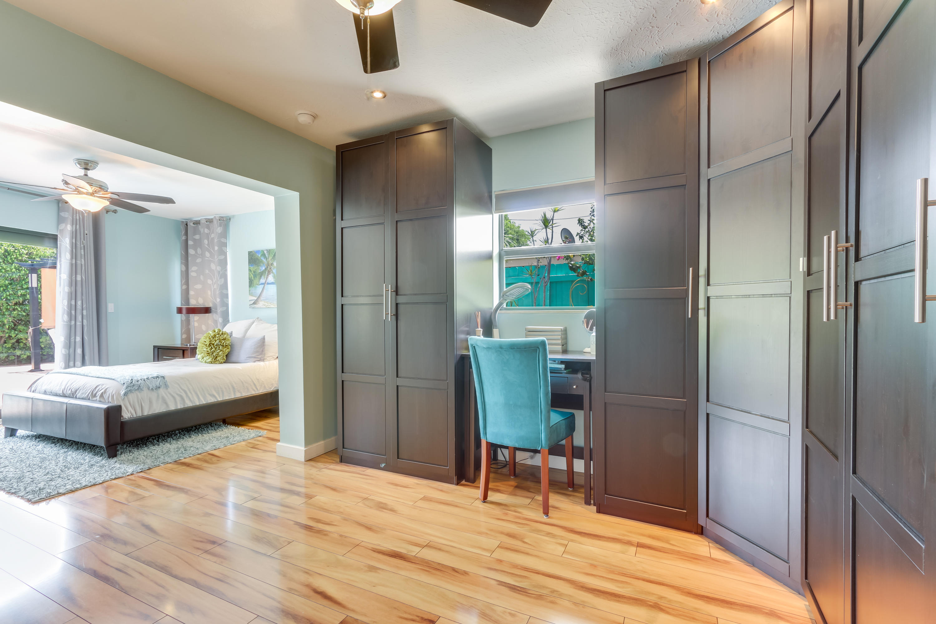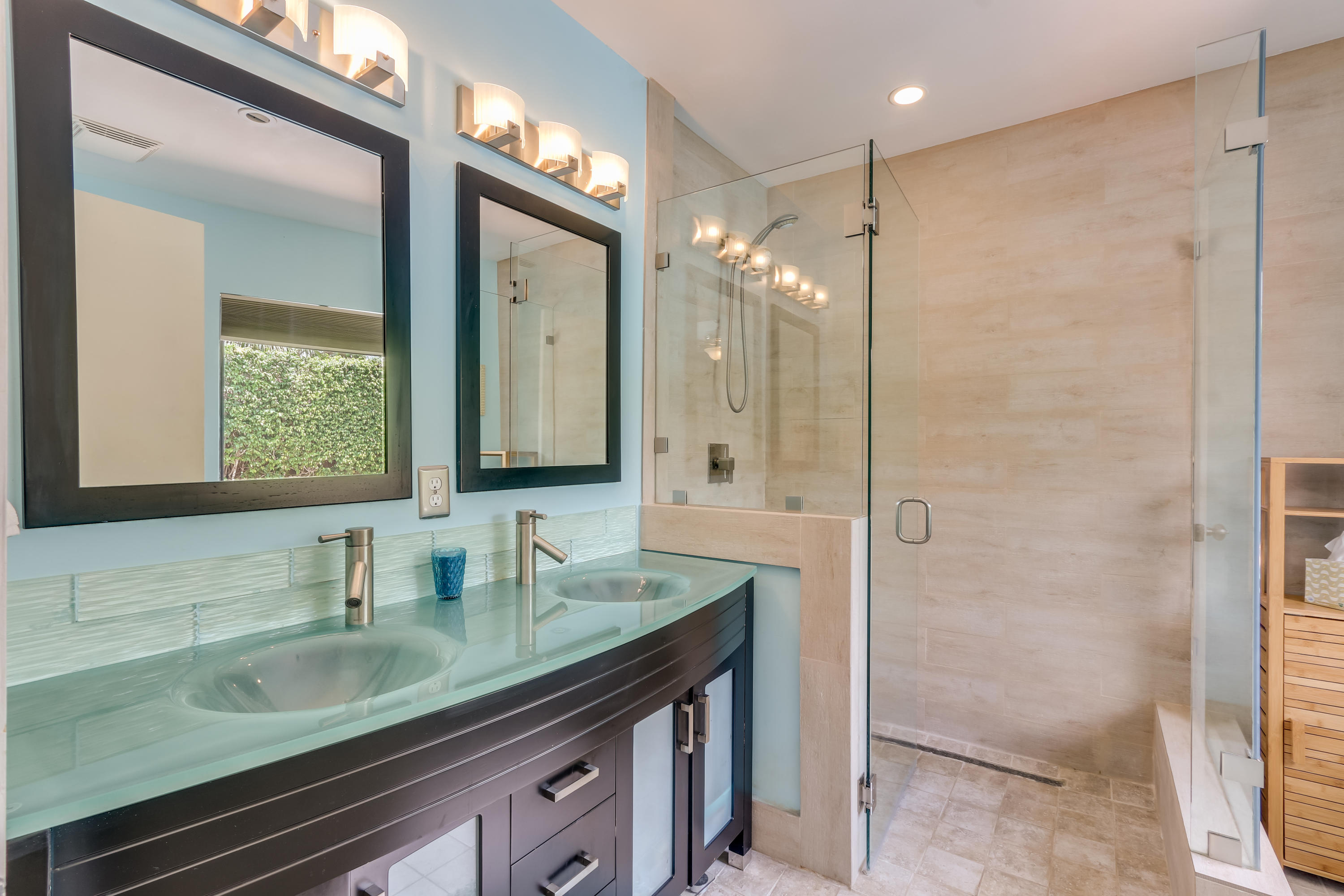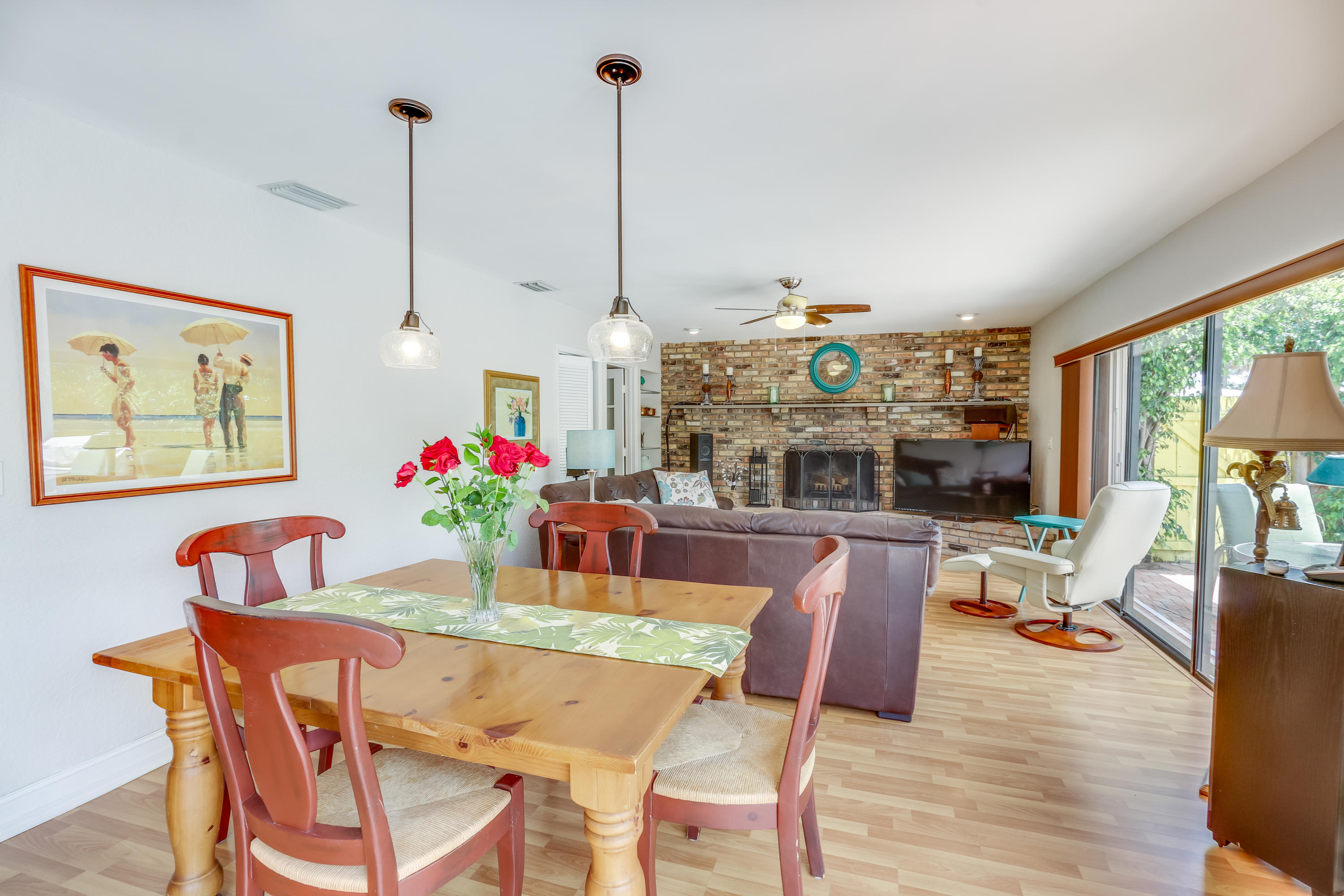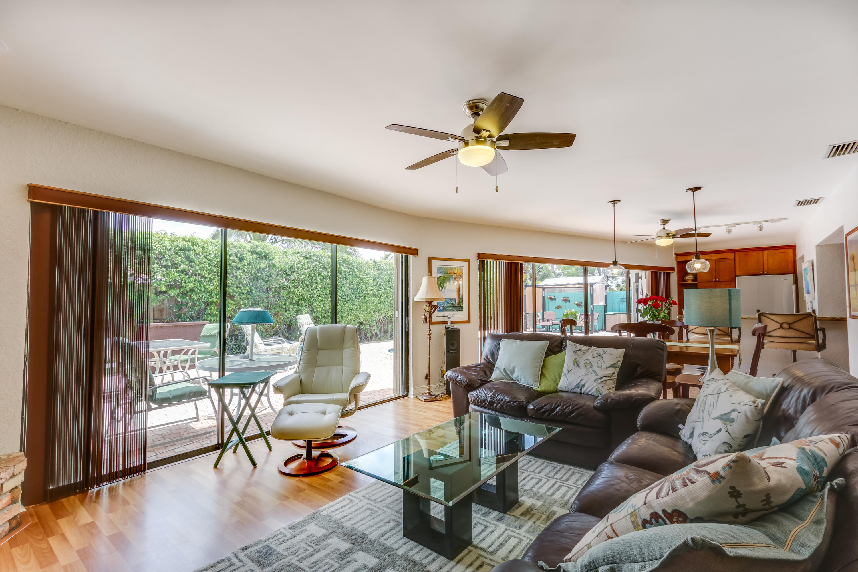 Private oasis in a great location!! This beautifully updated 3 bedroom 3 bath home with a magnificent pool has everything you could want. Walk through the front door to an open split bedroom floor plan with spectacular pool views from all over the home. The ample front living room is light and bright with a large window. The sizable kitchen features beautiful granite, stainless steel appliances, double oven, abundant storage and counter space, as well as a long bar for entertaining. The kitchen overlooks the open dining room and second spacious living area with an amazing fireplace. The master bedroom is one of a kind with floor to ceiling wardrobes in its own dressing room. The room has french doors overlooking the tropical pool, and a completely renovated master bath with dual sink