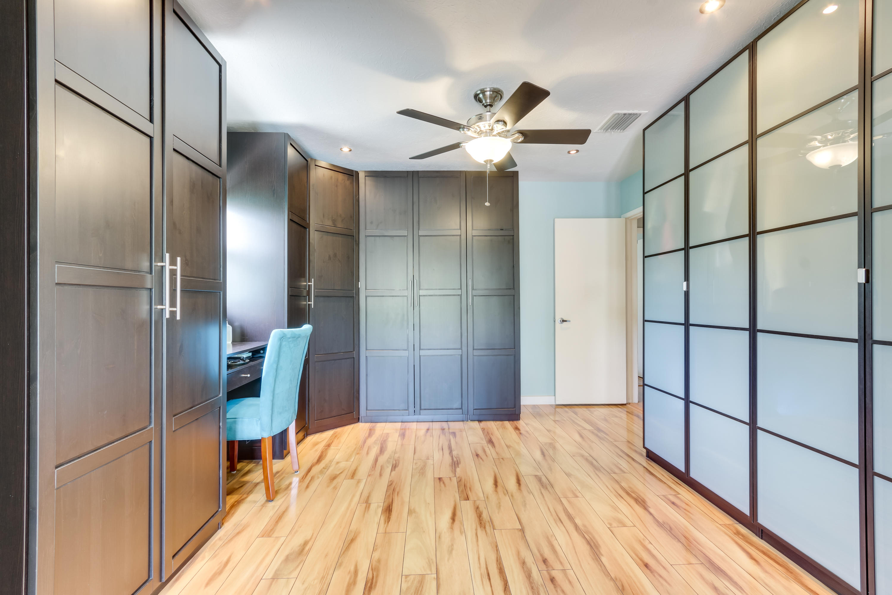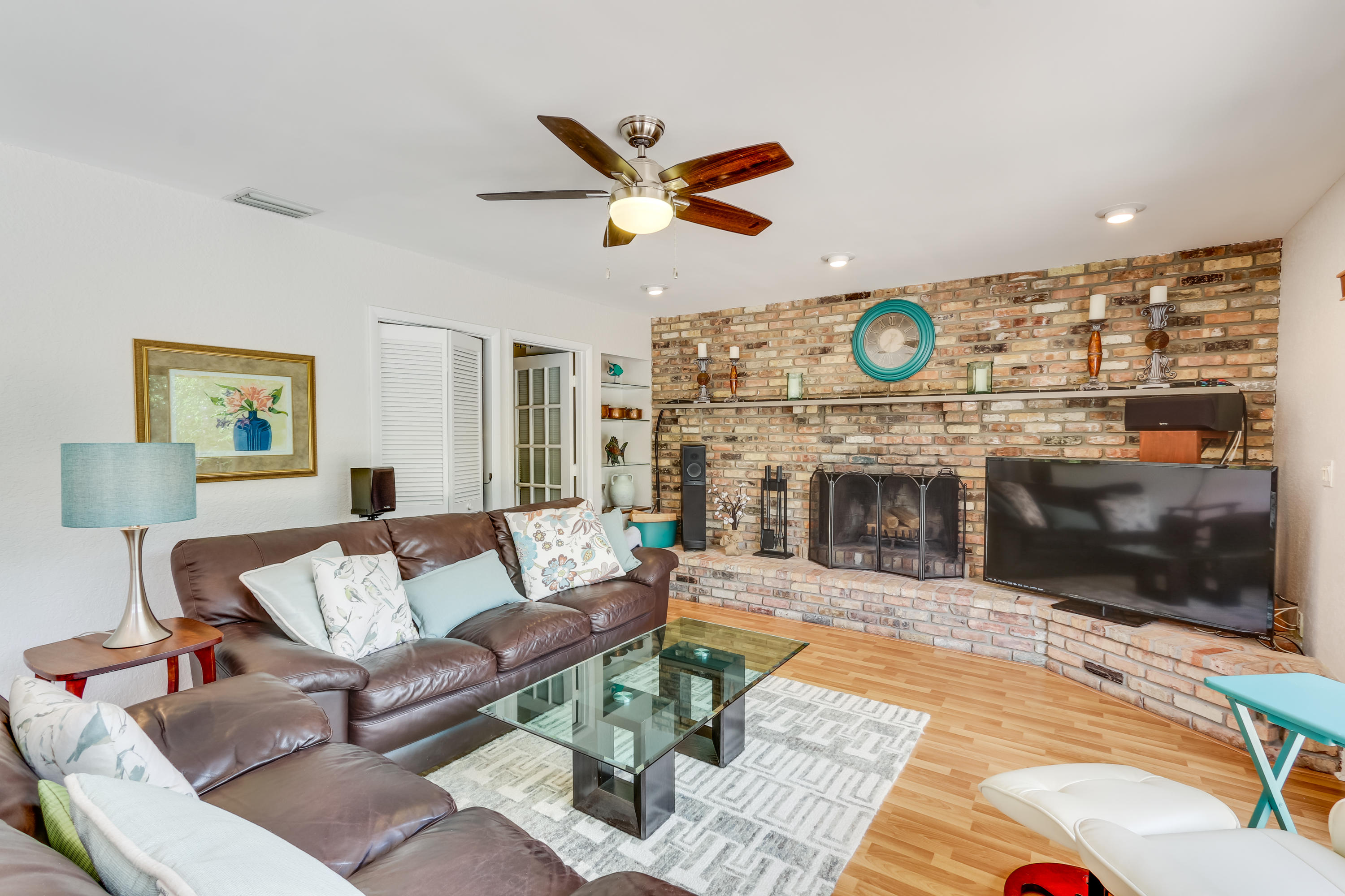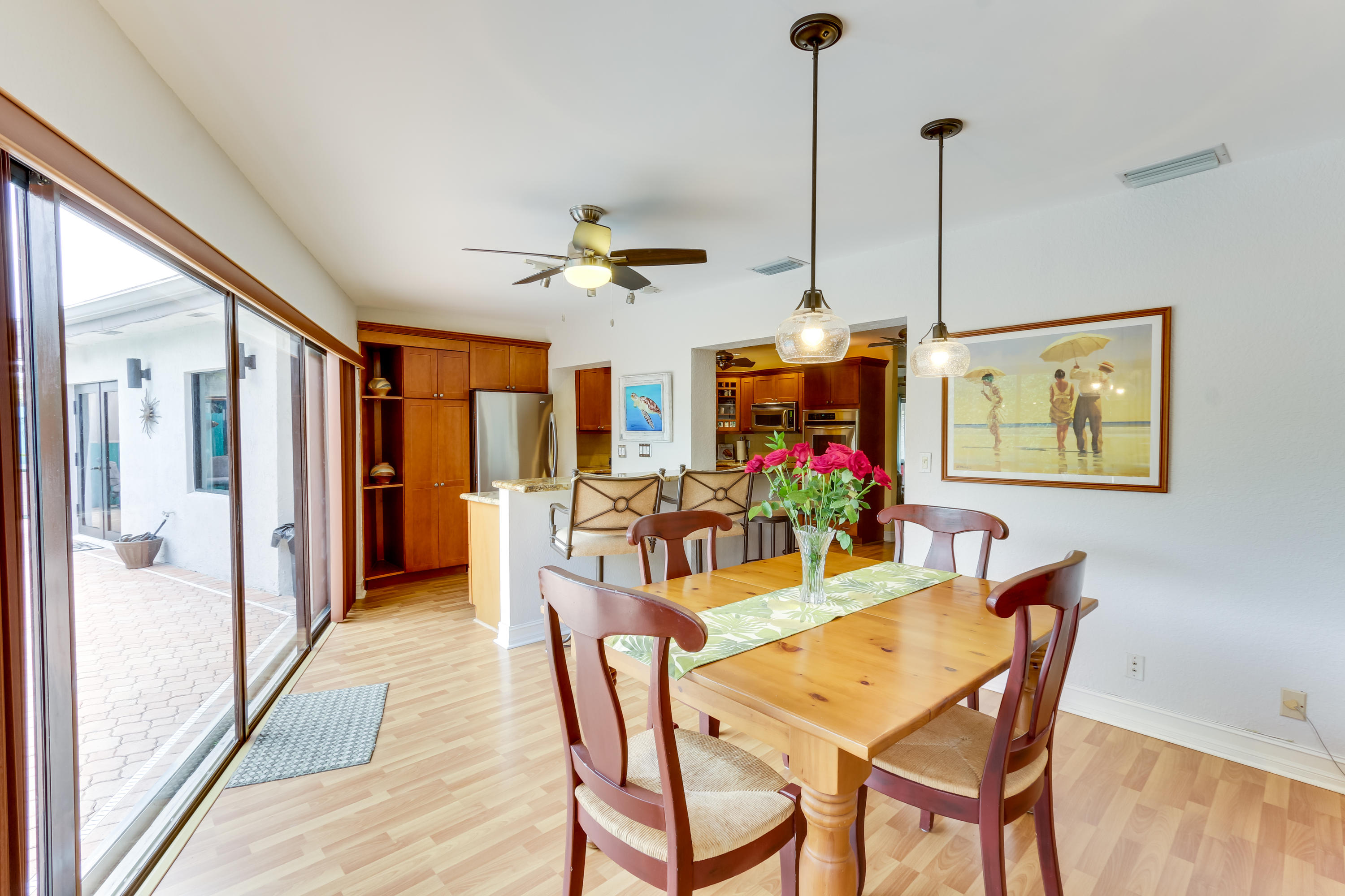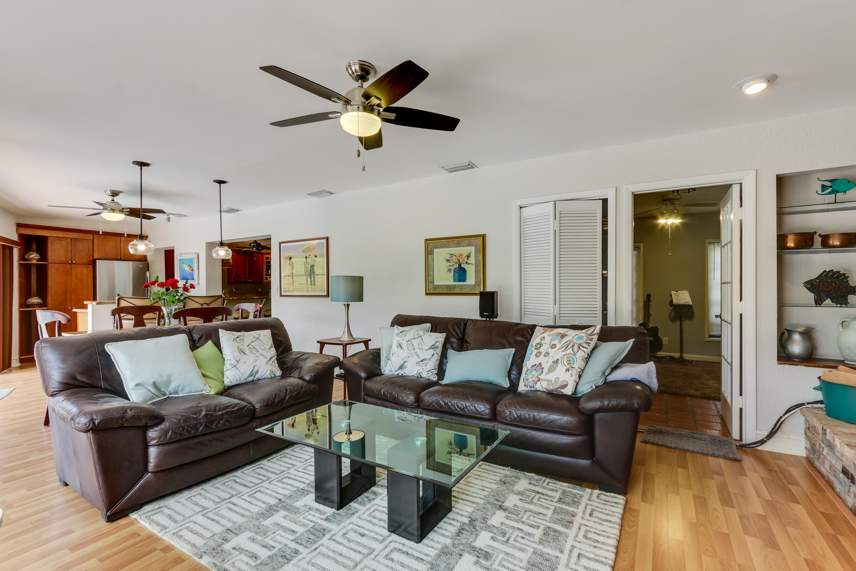 Private oasis in a great location!! This beautifully updated 3 bedroom 3 bath home with a magnificent pool has everything you could want. Walk through the front door to an open split bedroom floor plan with spectacular pool views from all over the home. The ample front living room is light and bright with a large window. The sizable kitchen features beautiful granite, stainless steel appliances, double oven, abundant storage and counter space, as well as a long bar for entertaining. The kitchen overlooks the open dining room and second spacious living area with an amazing fireplace. The master bedroom is one of a kind with floor to ceiling wardrobes in its own dressing room. The room has french doors overlooking the tropical pool, and a completely renovated master bath with dual sink