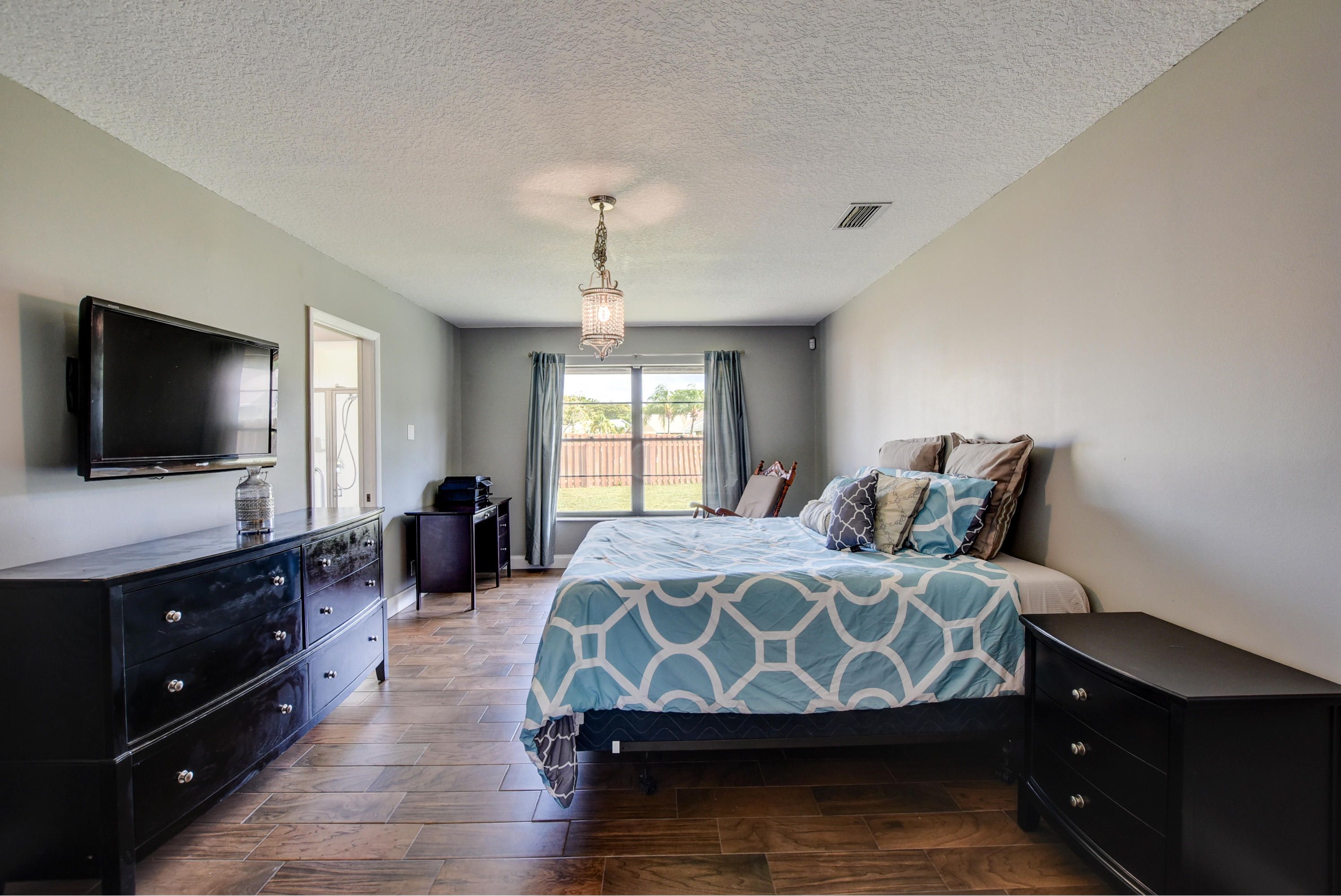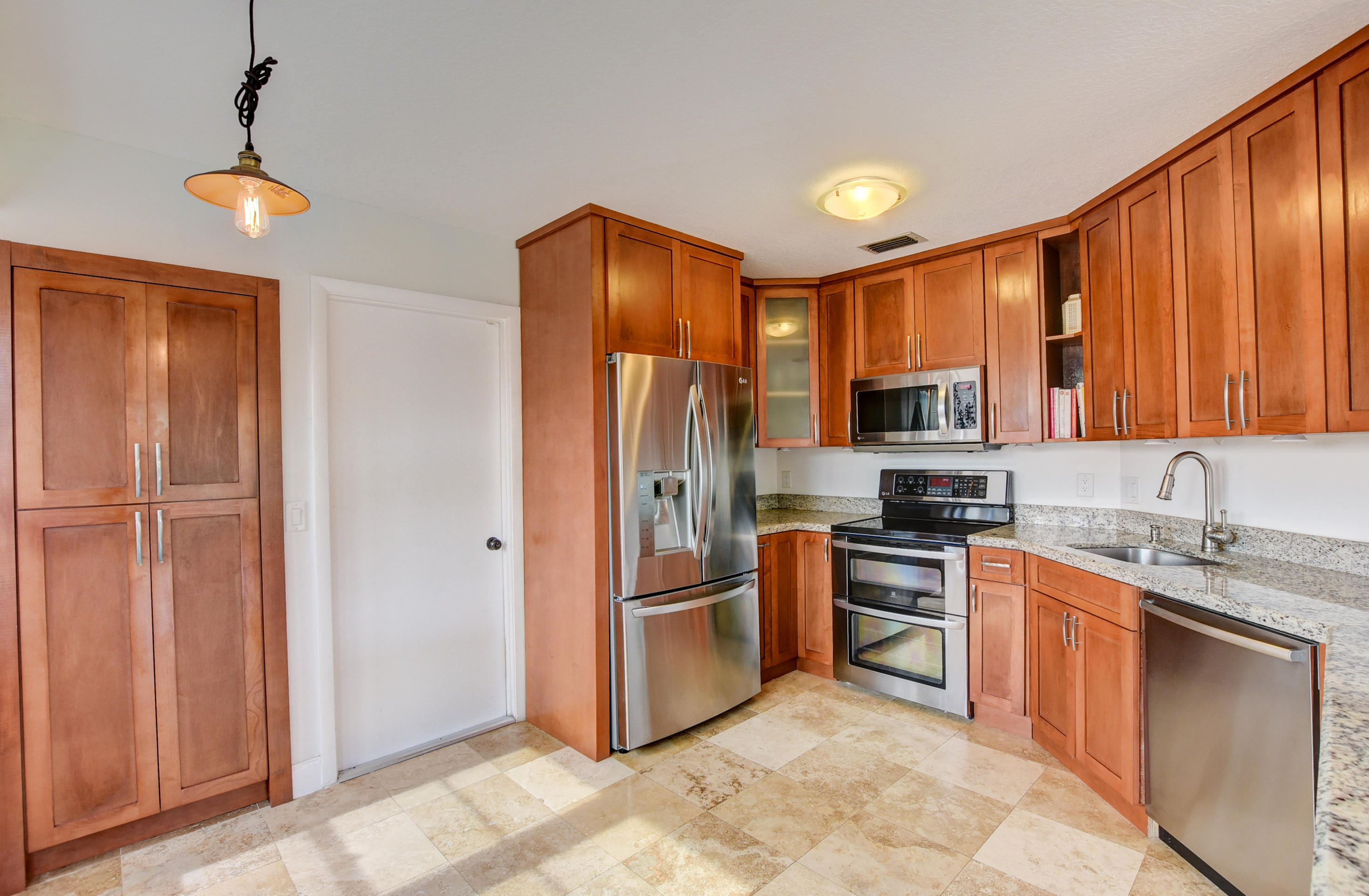 This corner lot home has an extremely large fenced in yard, complete with it's own Mango tree. This three bedroom, two bathroom house has high (popcorn free) vaulted ceilings. When you enter the front door, to the left are the bedrooms and to the right are the kitchen and dining areas. The main area and bedrooms have brand new, wood tile flooring. The bedrooms are large and spacious. The kitchen is completely updated with a view of the backyard. This is a bright home on an amazing lot, centrally located.