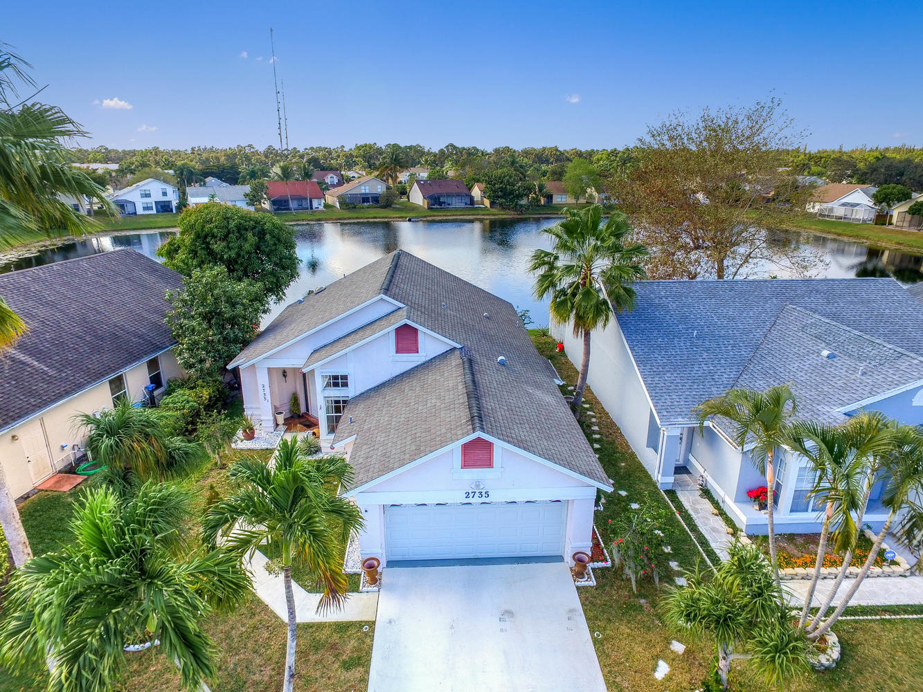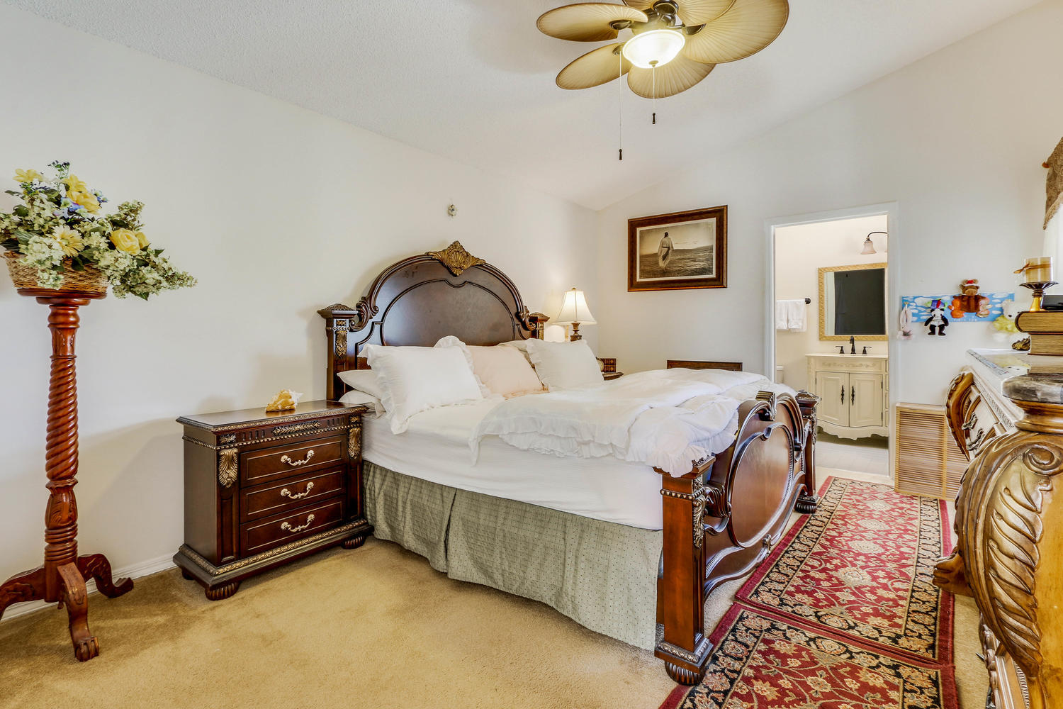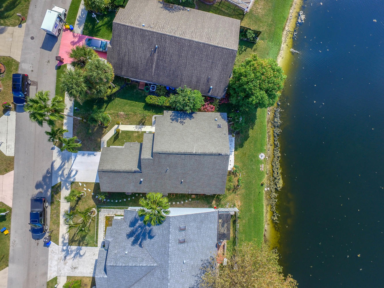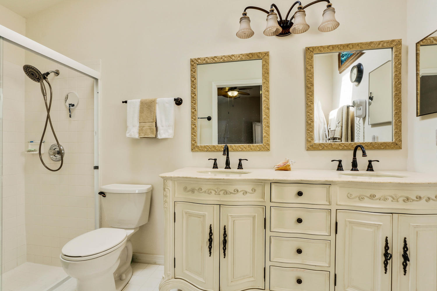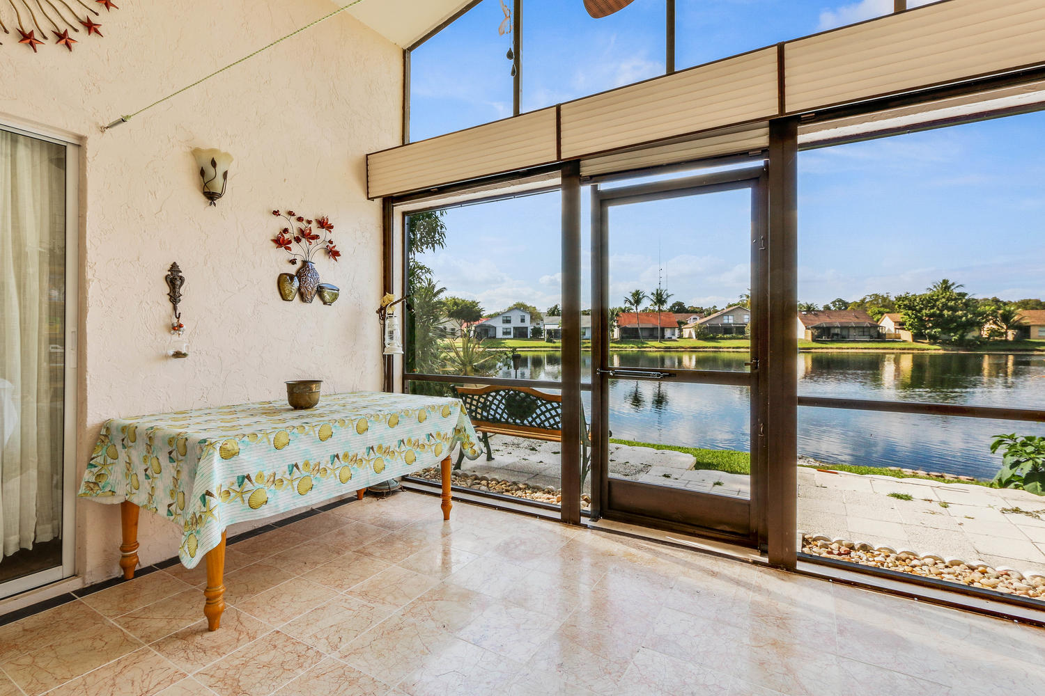 lake front home with two master bedrooms and baths. Superior floor plan with glass doors in living room and both bedrooms. Volume ceilings, split bedrooms with living room and patio in the middle. Spacious kitchen and dining areas. Newer Beautiful tile floors, new kitchen cabinets, granite counters and stainless steel appliances. Both bathrooms have been remodeled. Large enclosed patio on 3 sides with beautiful view of lake. Brand new AC Unit.