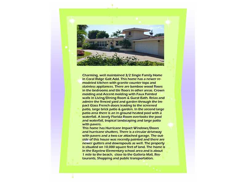 Charming well maintained Coral Ridge Galt Add Single Family Home. Newer remodeled kitchen with granite counters.Impact Glass French doors overlooking screened patio, brick patio & garden. In ground heated pool with waterfall. Two car garage. Newer Hurrica ne Impact Windows/Doors and hurricane shutters.Florida Room overlooking the pool and patio.