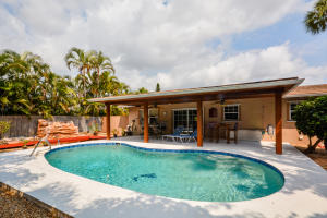 Absolute doll house in desirable Tunison Palms community. Top rated Addison Mizner Elementary school district. Just move in to this immaculate and charming 2 bedroom 2 bath beauty with tropical oasis in your own backyard. Updated kitchen and baths and ceramic tile throughout the home.Large covered patio with area adds additional living space and has pecky cypress ceiling overlooking a very private pool area and coy pond with waterfall and very tropical landscaping. Covered carport and marble pavered driveway add to the charm. Show and sell.