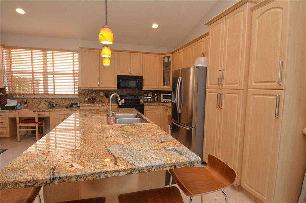 Beautiful 1 story lake front home with tile throughout common areas and wood in all bedrooms. Gorgeous kitchen with high end granite countertops, oversized eat at island, large built in desk area, new ss refrigerator. All bedroom closets have custom built ins. Yard is fully fenced with white aluminum fence. Large courtyard area has a pavered patio. 2nd Expansive patio overlooks the water. Home is protected by home security system and accordion shutters. New AC. Modern built in furniture can stay.