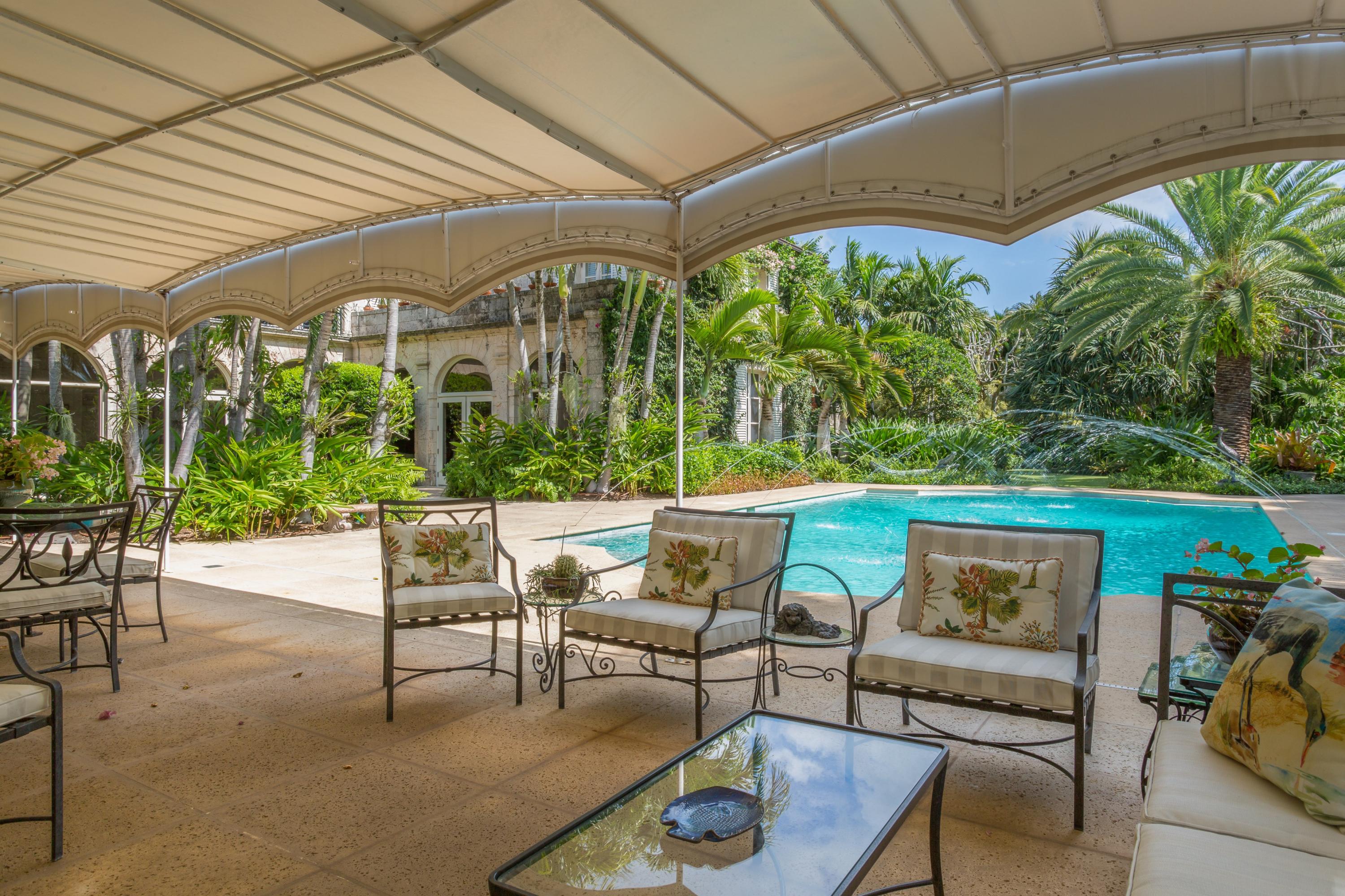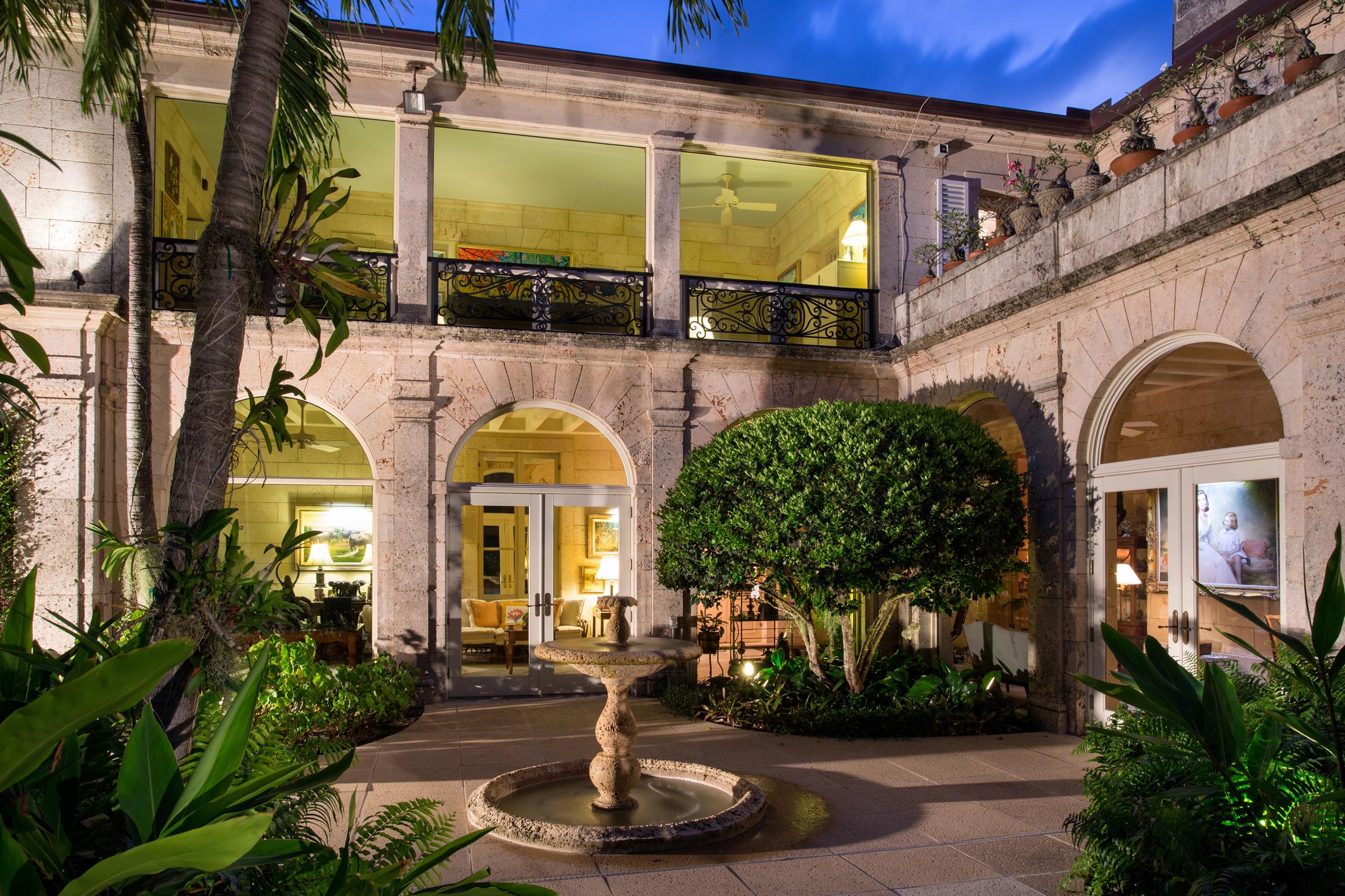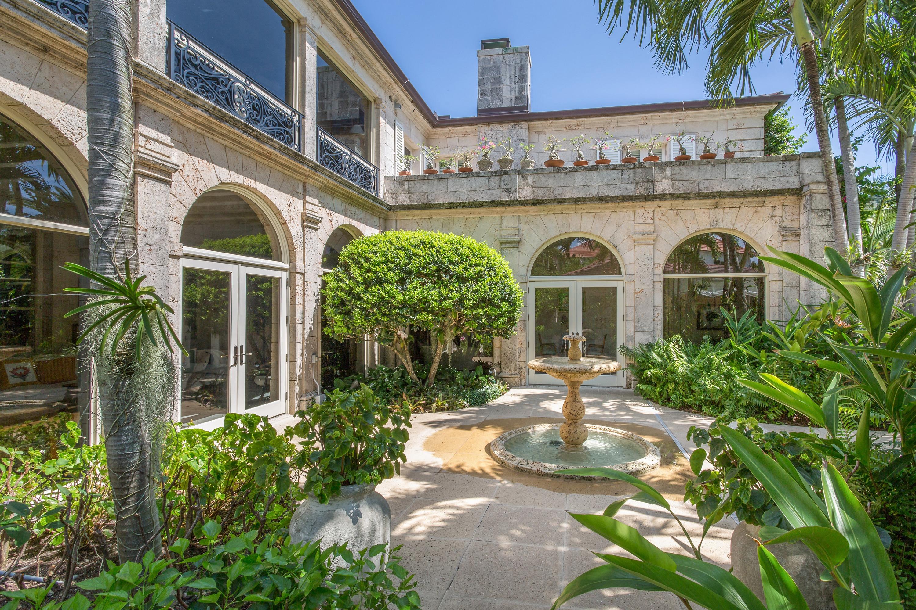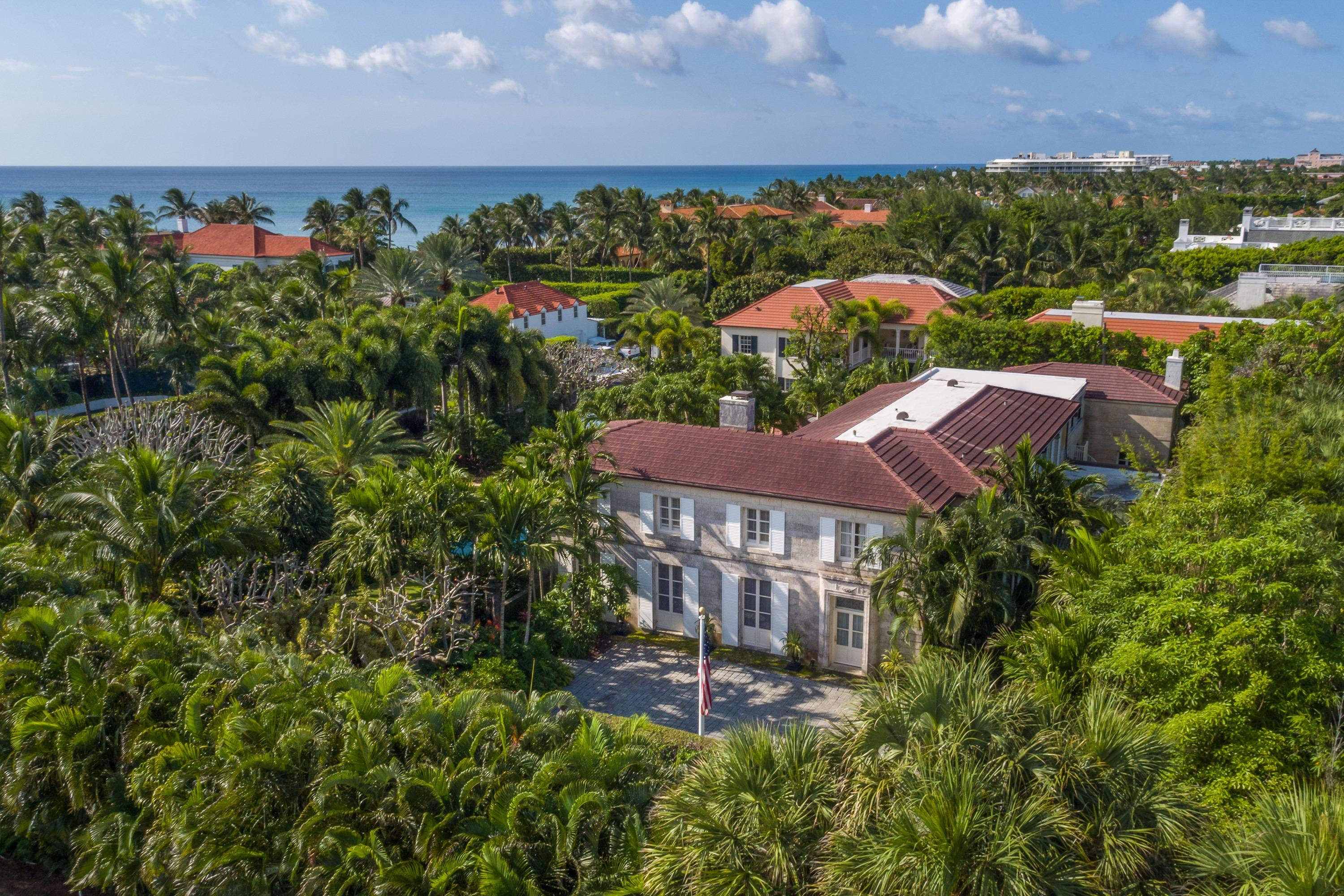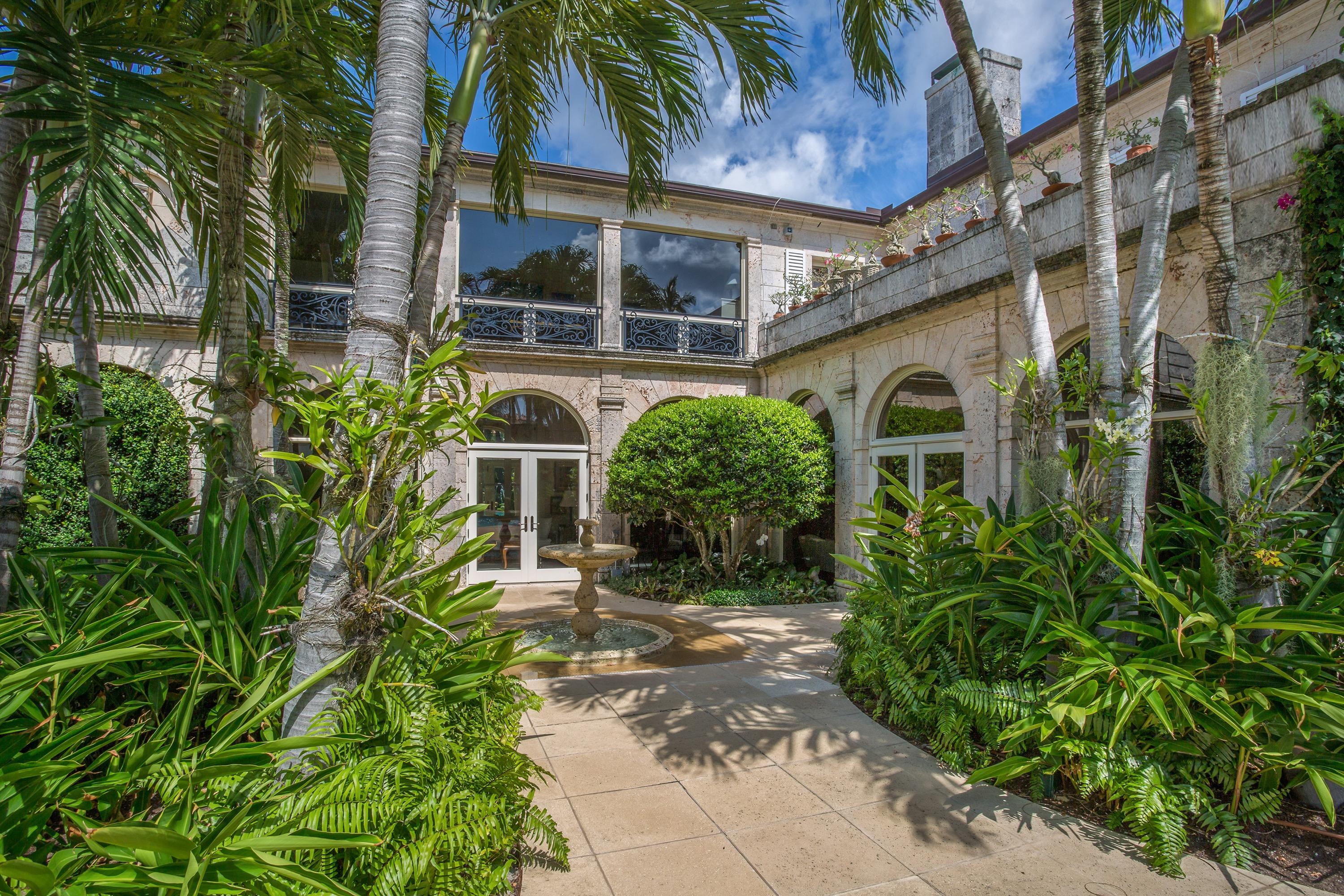 Extraordinary, Landmarked, late 1920's Palm Beach estate created by Howard Major in a "Creole" French Classical design. The stately residence, sitting on a lot of approx. 25,200 sq. ft., is finished with natural rusticated quarried coral blocks originating from Cuba both on the entire exterior as well as several important living areas and trim work on both levels inside the home. Black, white and grey Carrera Marble floors seen throughout the home are believed to have come to the New World as ballast in sailing vessels later cut into floor tiles and installed in a convent in Cuba from whence it was recovered and used in few residences in Palm Beach.The formal living room was designed especially to accommodate the beautiful walnut paneling recovered from a 17th century French Chateaux.
