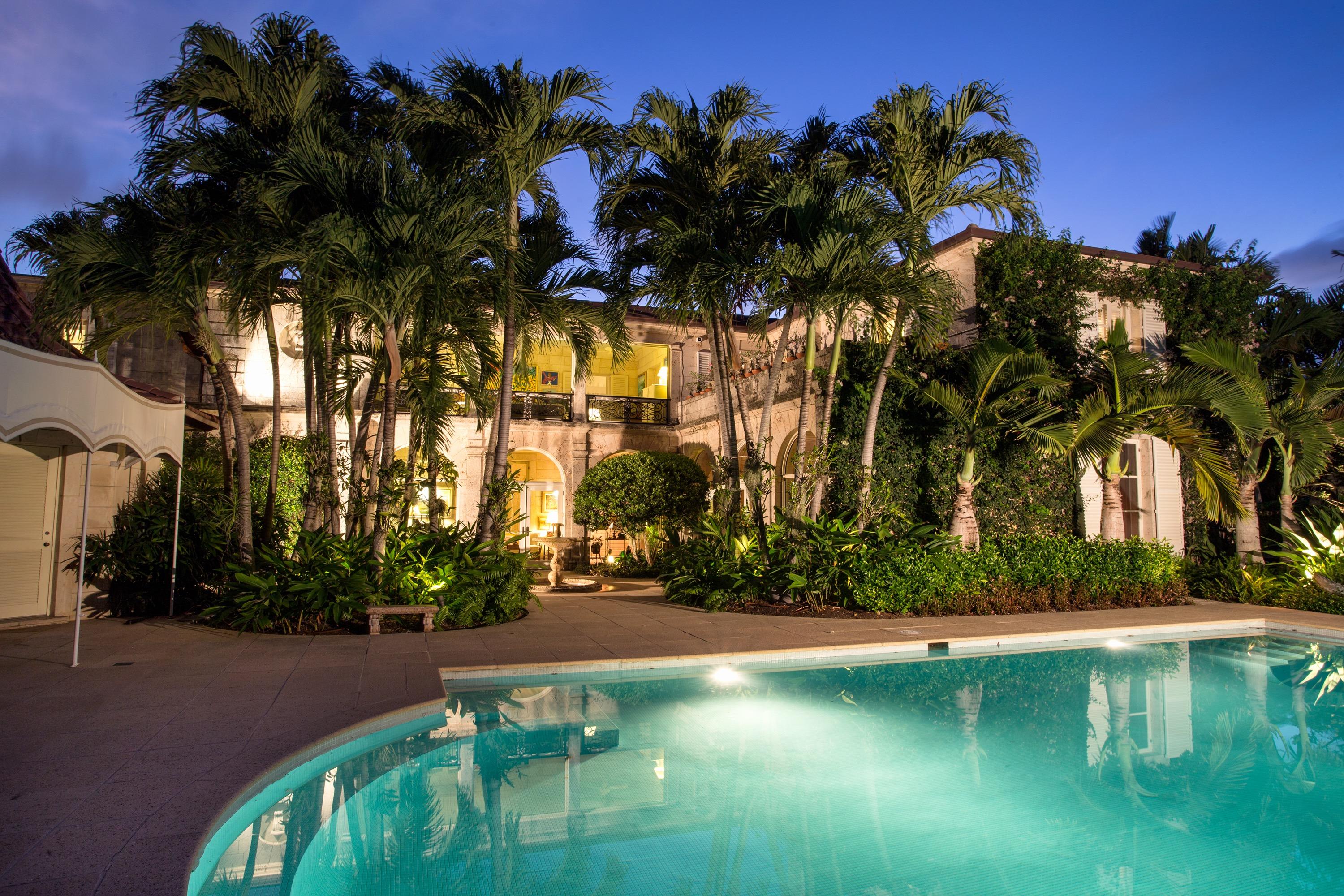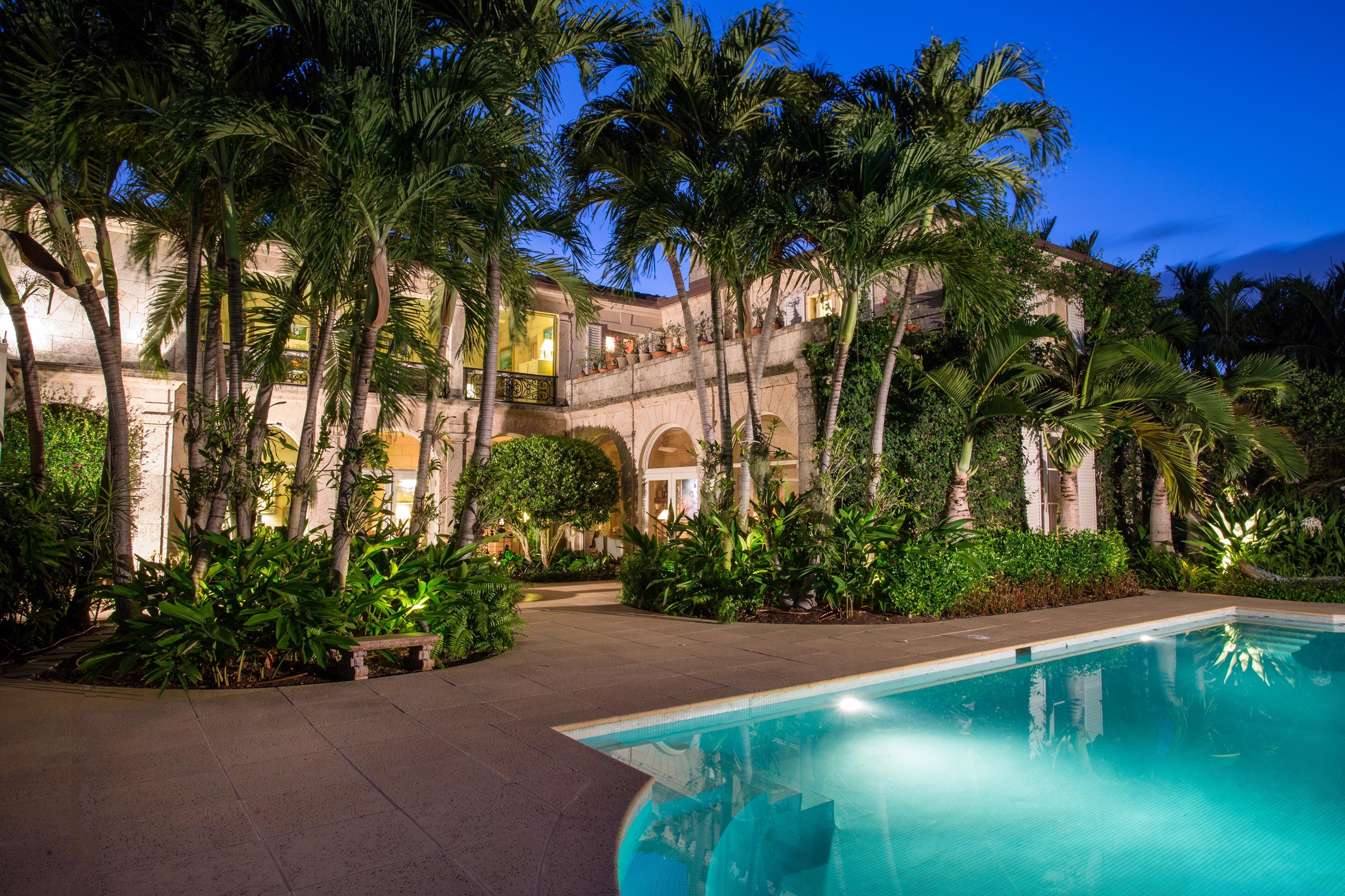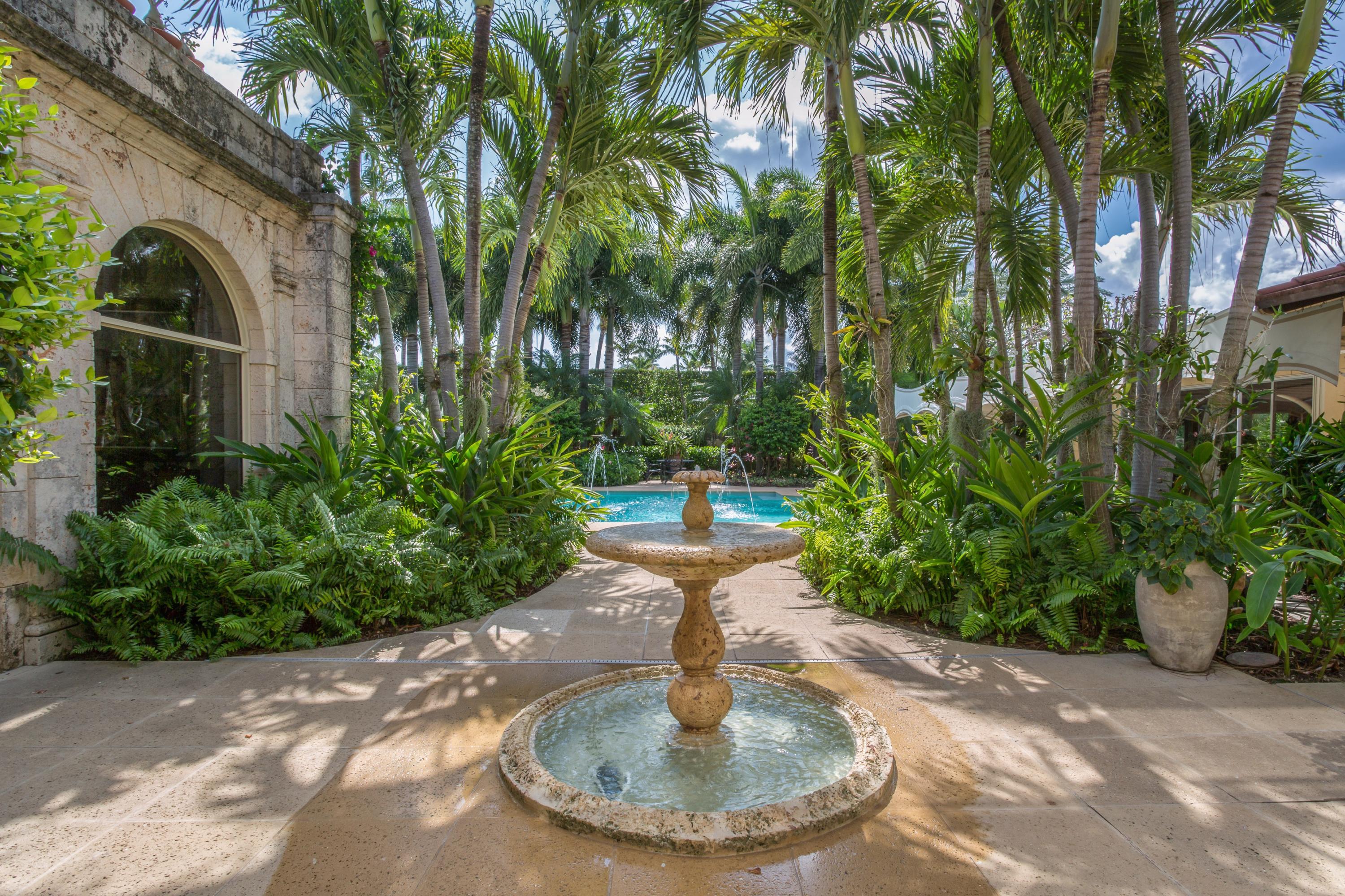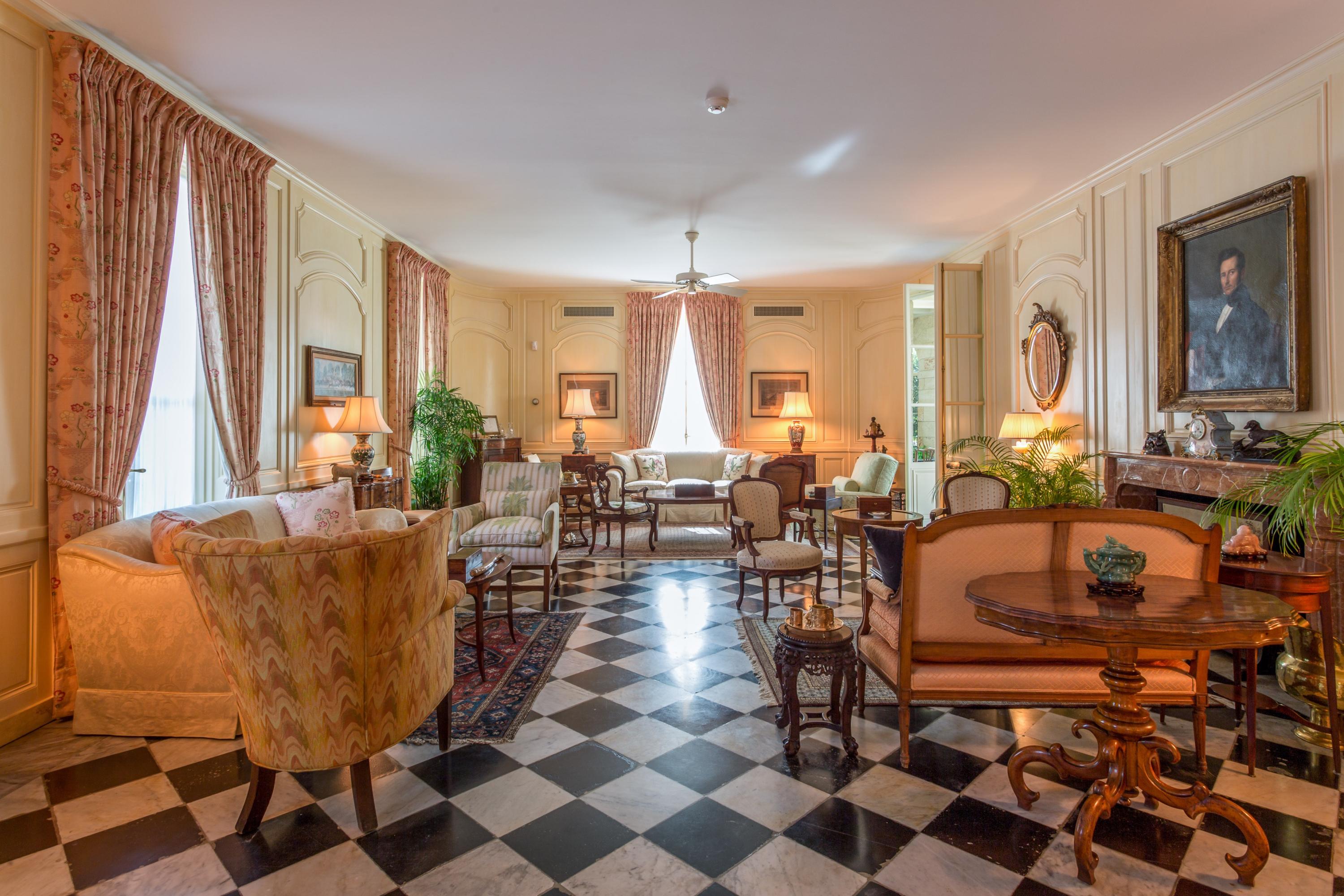 Extraordinary, Landmarked, late 1920's Palm Beach estate created by Howard Major in a "Creole" French Classical design. The stately residence, sitting on a lot of approx. 25,200 sq. ft., is finished with natural rusticated quarried coral blocks originating from Cuba both on the entire exterior as well as several important living areas and trim work on both levels inside the home. Black, white and grey Carrera Marble floors seen throughout the home are believed to have come to the New World as ballast in sailing vessels later cut into floor tiles and installed in a convent in Cuba from whence it was recovered and used in few residences in Palm Beach.The formal living room was designed especially to accommodate the beautiful walnut paneling recovered from a 17th century French Chateaux.
