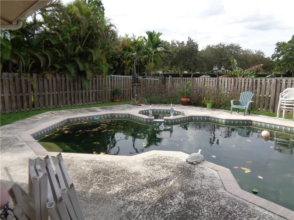 Very large DOUBLE LOT waterfront property! See folio numbers. Full 4 bedroom 2 bathroom with vaulted ceilings. Large living areas, kitchen with breakfast area! Formal Dining room! Accordion shutters! Covered patio overlooking pool and back yard. Fence for 1/2 of the property. Land goes all the way back to the canal (TWO LOTS). Stacked bedroom plan. Entire home opens up to the back yard and pool area. NEEDS WORK! AS IS. Call listing agent with any questions.