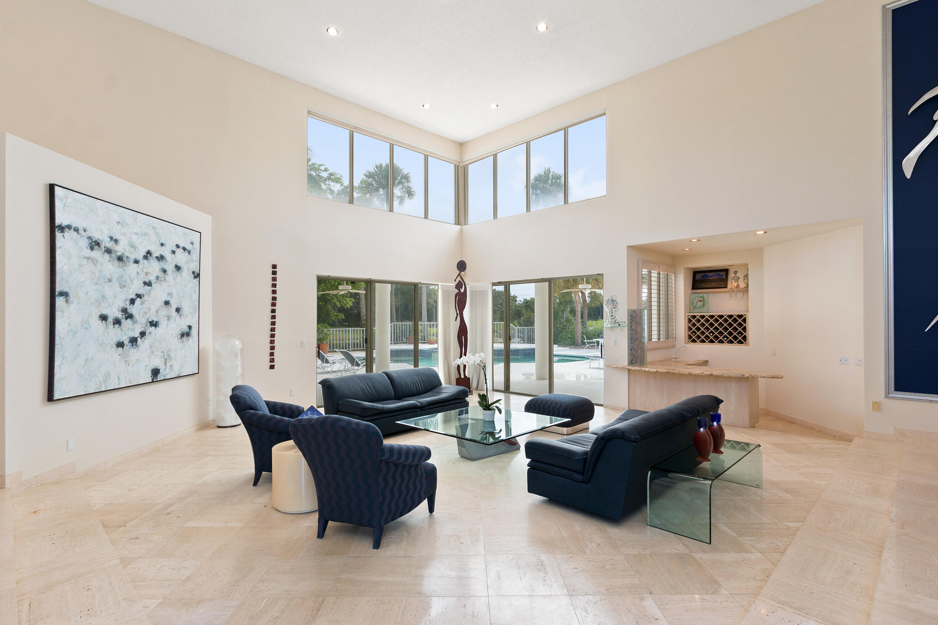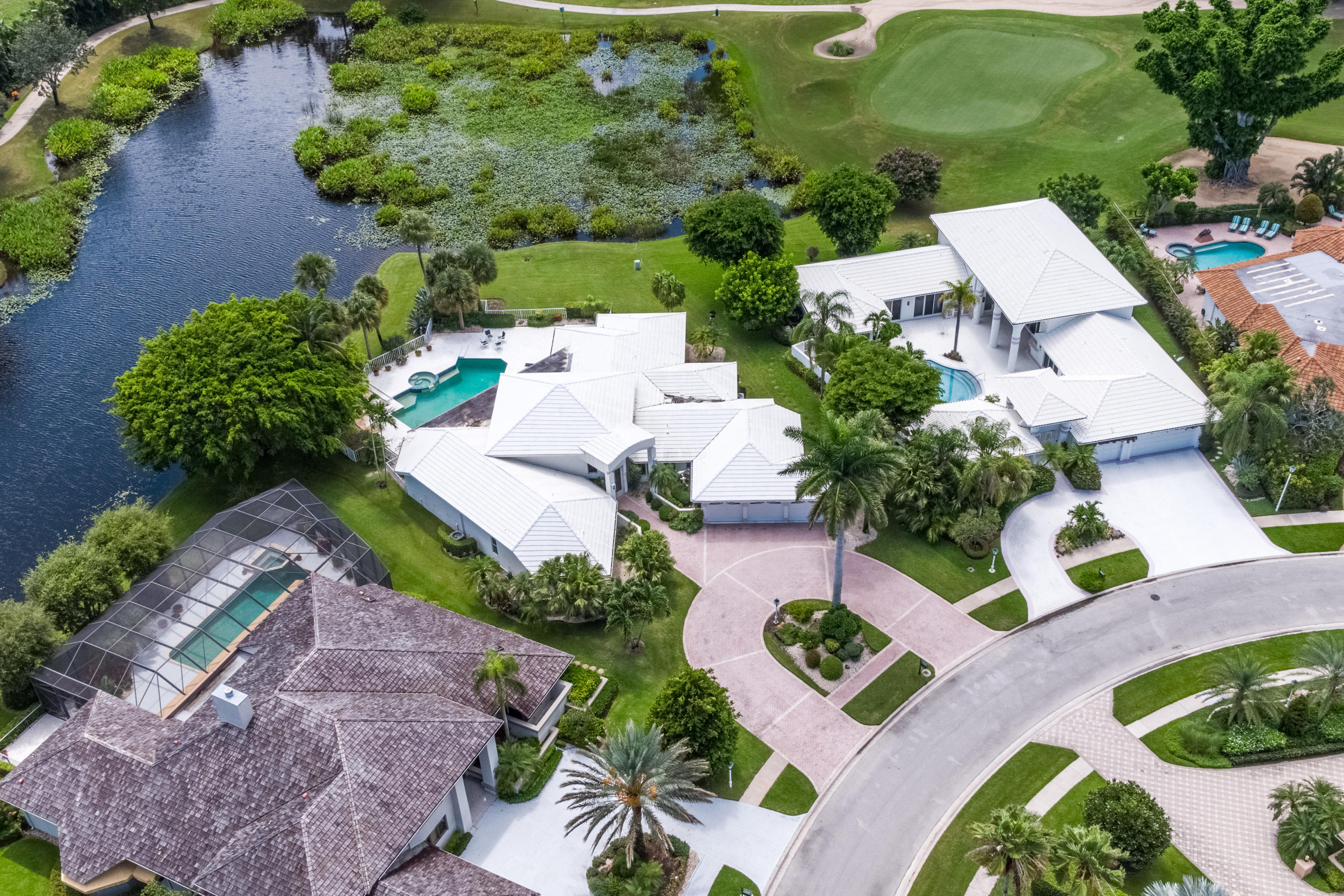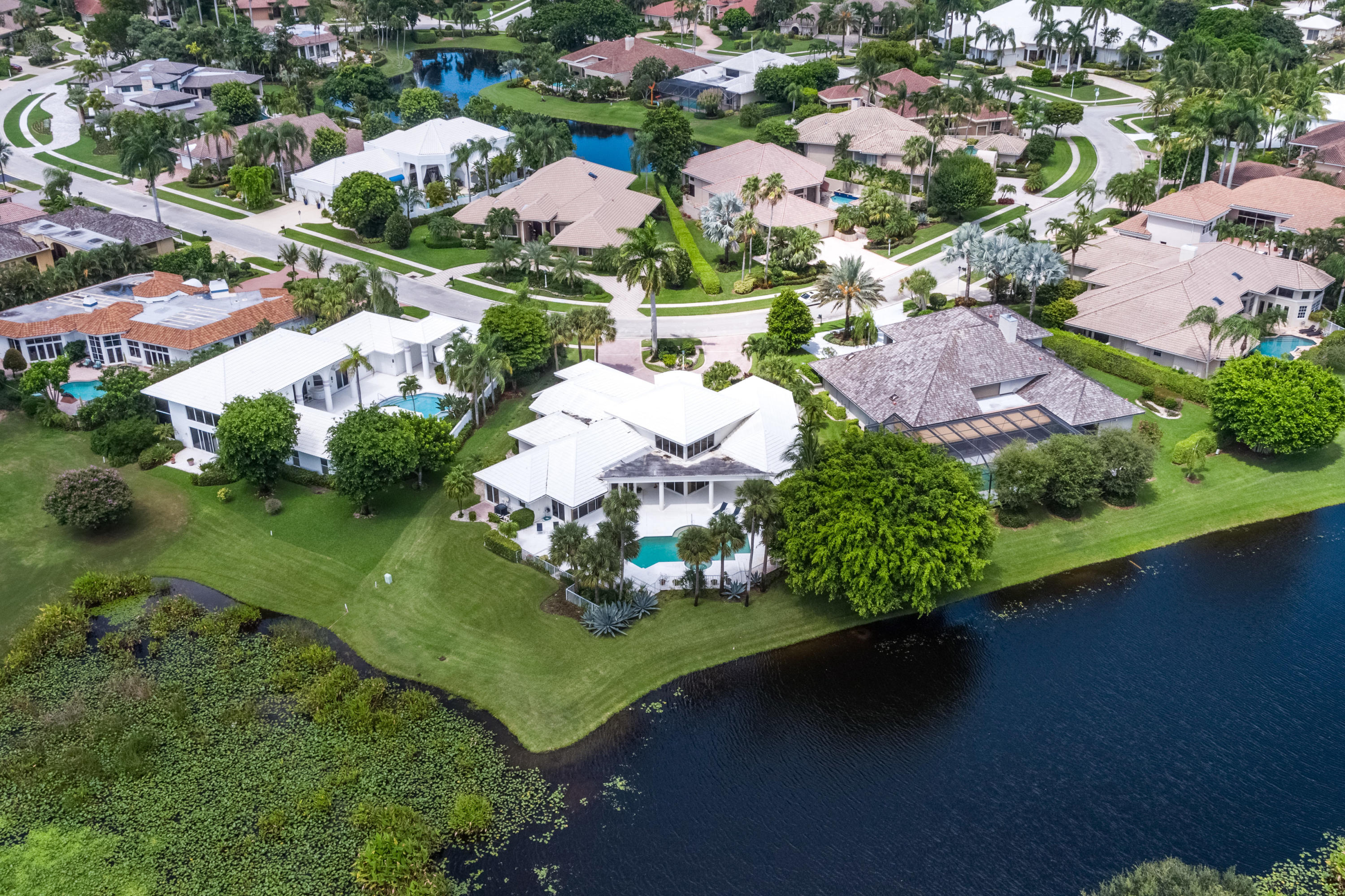 Panoramic lake & golf course views make this home UNIQUE, offering your own private sanctuary. The property is surrounded by an impressive 170 feet of lake frontage. Upon entering, you are greeted by high ceilings, abundant exterior light & amazing vistas in the gracious-sized formal living room. The open concept kitchen flows beautifully into the intimate family room. An impressive oversized master suite with sprawling views, enormous his/her closets & a master bath that offers his/her separate water closets is ideally designed. The additional bedrooms are all en suite & each provides a private patio area. A spacious custom-built office is set apart for privacy. Manicured tropical plantings highlight the patio deck that incorporates an oversized pool. Owner is putting on a brand new roof.