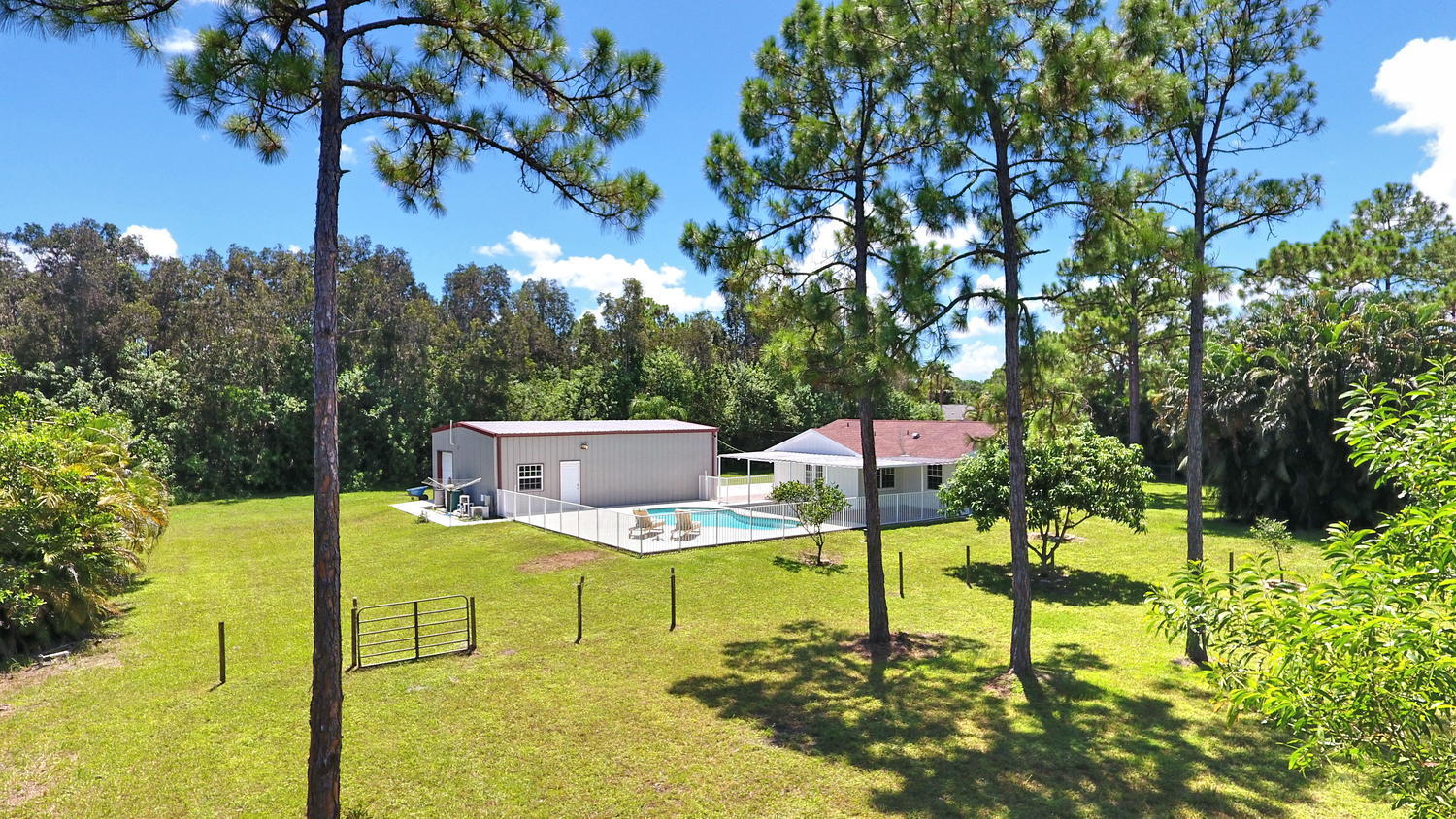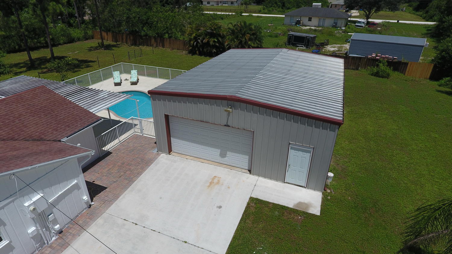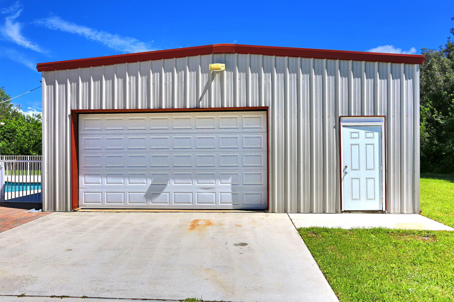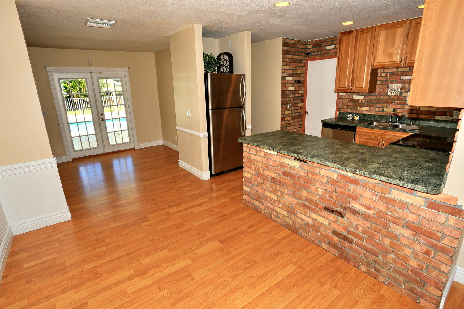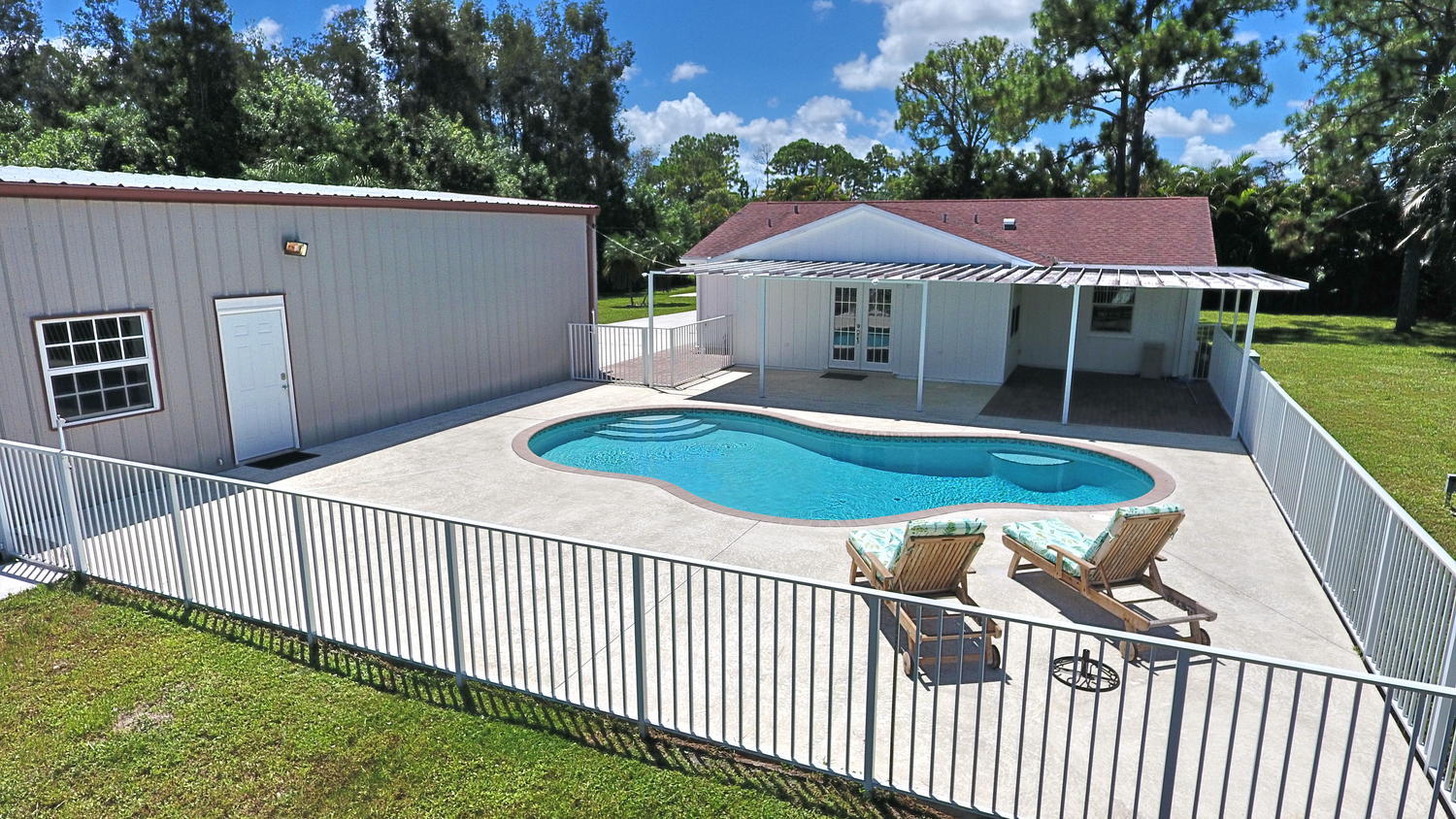 This charming home has been recently renovated, & has 3 bedrooms, 2 baths with a sparkling blue freeform pool! The kitchen has stainless steel appliances with a Chicago brick backsplash & island. There are numerous high hats, a large walk-in pantry/storage area, & there is laundry/utility room access. With wood laminate flooring throughout, the baths have ceramic tile. Exit the french doors to enjoy the relaxing covered patio & open brick paver deck. From here you can enter the detached cabana/pool room with full bath that could also be used as an office or even an art studio! The air conditioned cabana room is housed in the detached steel garage/building measuring 40' X 29', & 2 cars can park easily inside. There is industrial steel shelving, & a 3rd garage door entrance for a golf cart