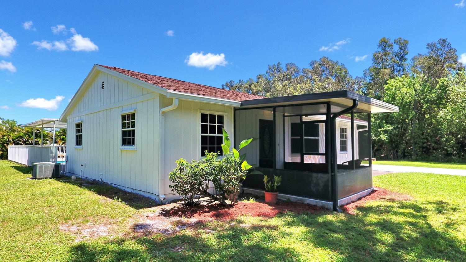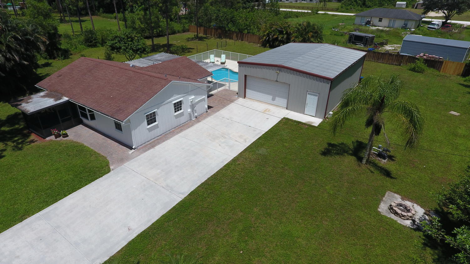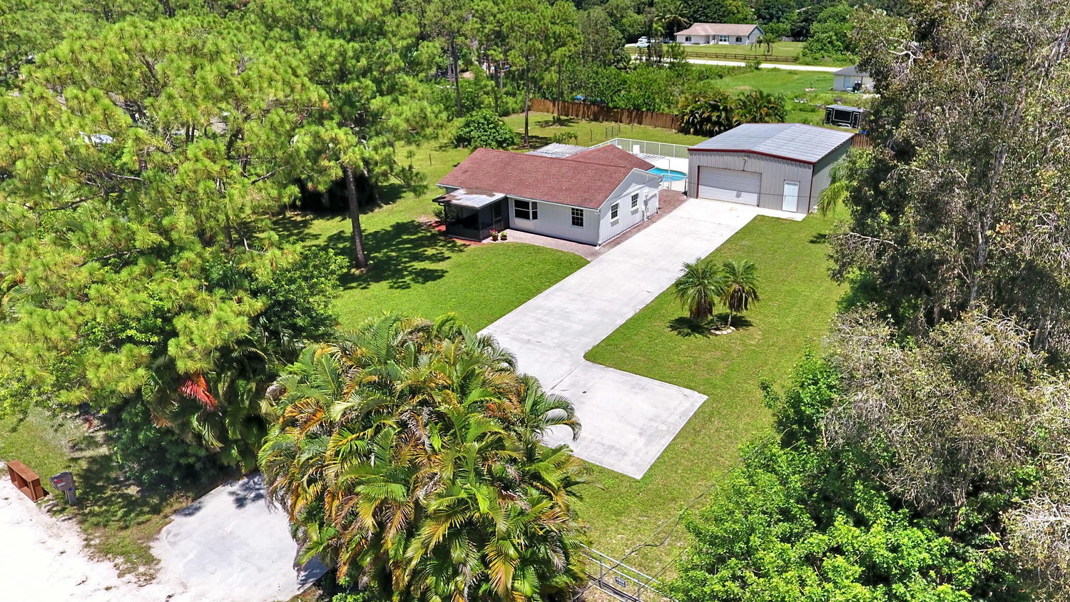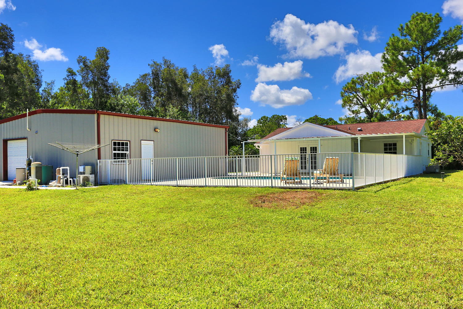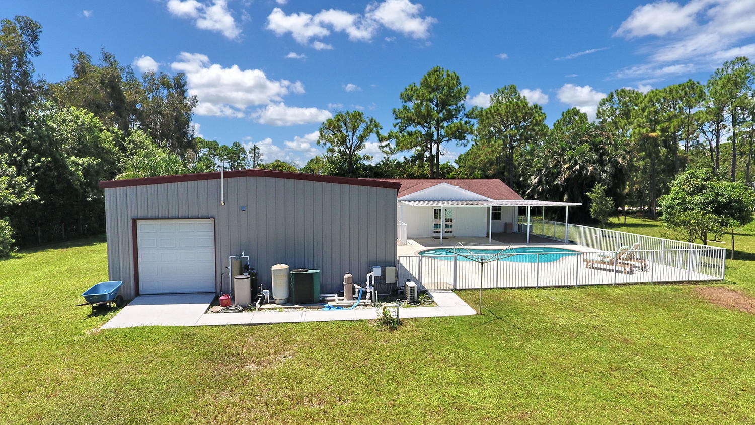 This charming home has been recently renovated, & has 3 bedrooms, 2 baths with a sparkling blue freeform pool! The kitchen has stainless steel appliances with a Chicago brick backsplash & island. There are numerous high hats, a large walk-in pantry/storage area, & there is laundry/utility room access. With wood laminate flooring throughout, the baths have ceramic tile. Exit the french doors to enjoy the relaxing covered patio & open brick paver deck. From here you can enter the detached cabana/pool room with full bath that could also be used as an office or even an art studio! The air conditioned cabana room is housed in the detached steel garage/building measuring 40' X 29', & 2 cars can park easily inside. There is industrial steel shelving, & a 3rd garage door entrance for a golf cart
