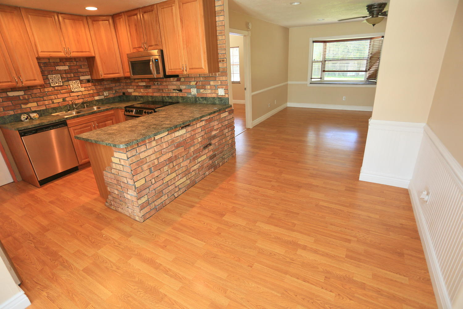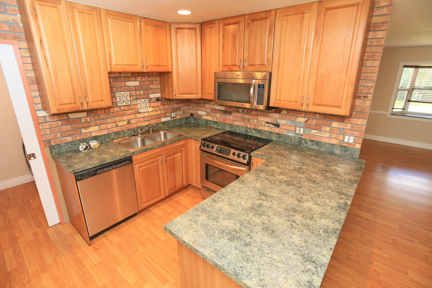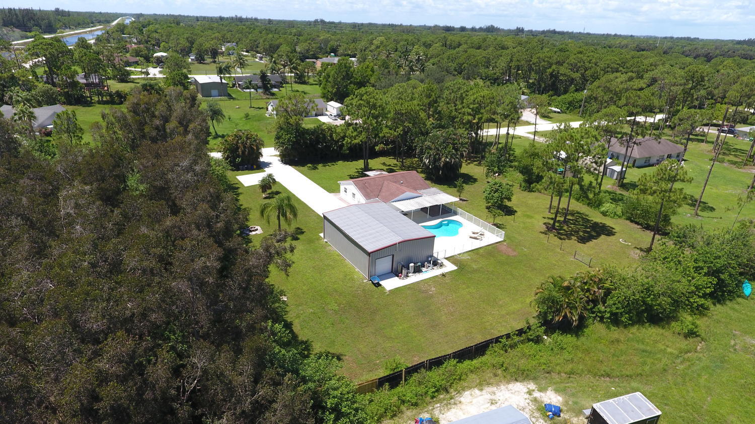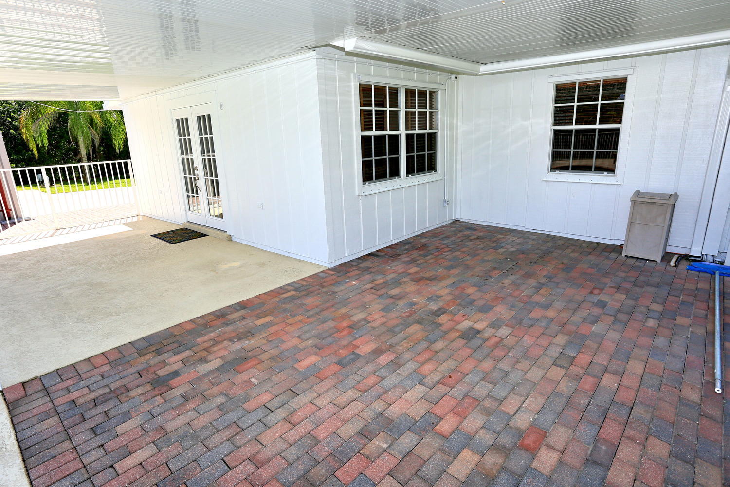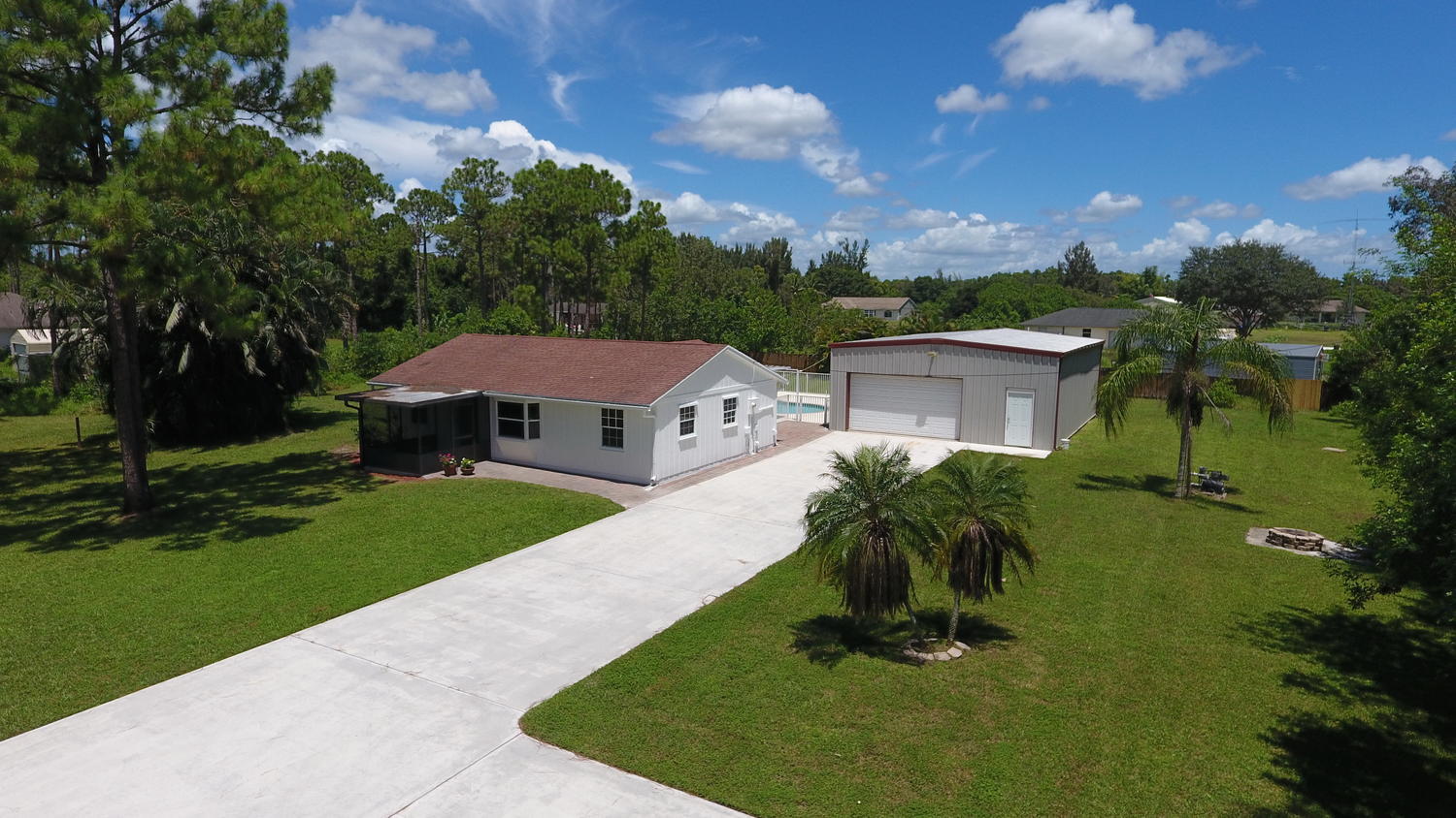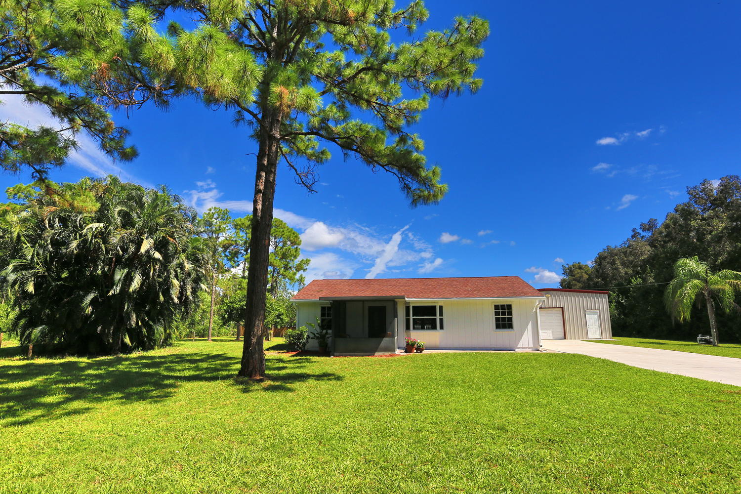 This charming home has been recently renovated, & has 3 bedrooms, 2 baths with a sparkling blue freeform pool! The kitchen has stainless steel appliances with a Chicago brick backsplash & island. There are numerous high hats, a large walk-in pantry/storage area, & there is laundry/utility room access. With wood laminate flooring throughout, the baths have ceramic tile. Exit the french doors to enjoy the relaxing covered patio & open brick paver deck. From here you can enter the detached cabana/pool room with full bath that could also be used as an office or even an art studio! The air conditioned cabana room is housed in the detached steel garage/building measuring 40' X 29', & 2 cars can park easily inside. There is industrial steel shelving, & a 3rd garage door entrance for a golf cart