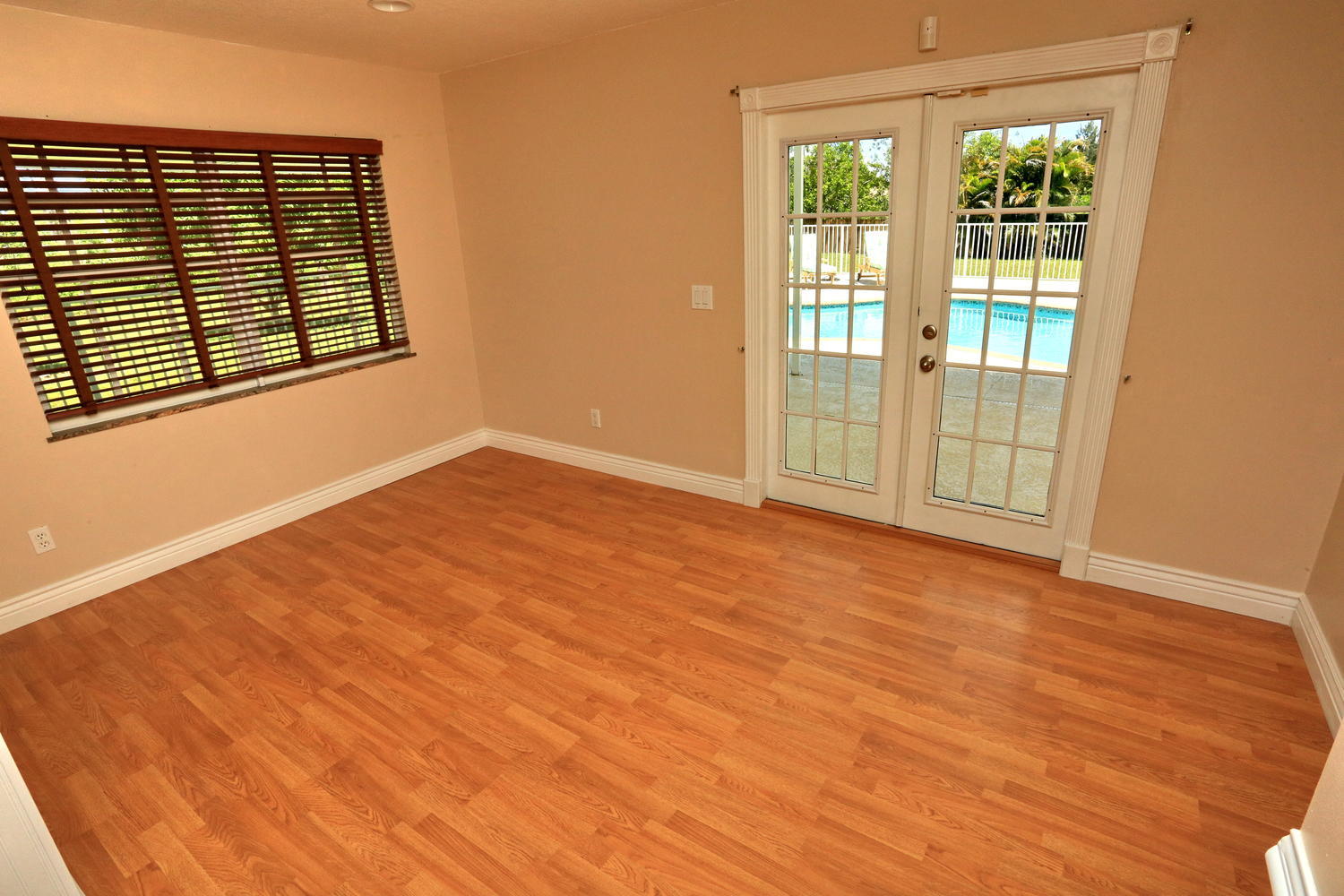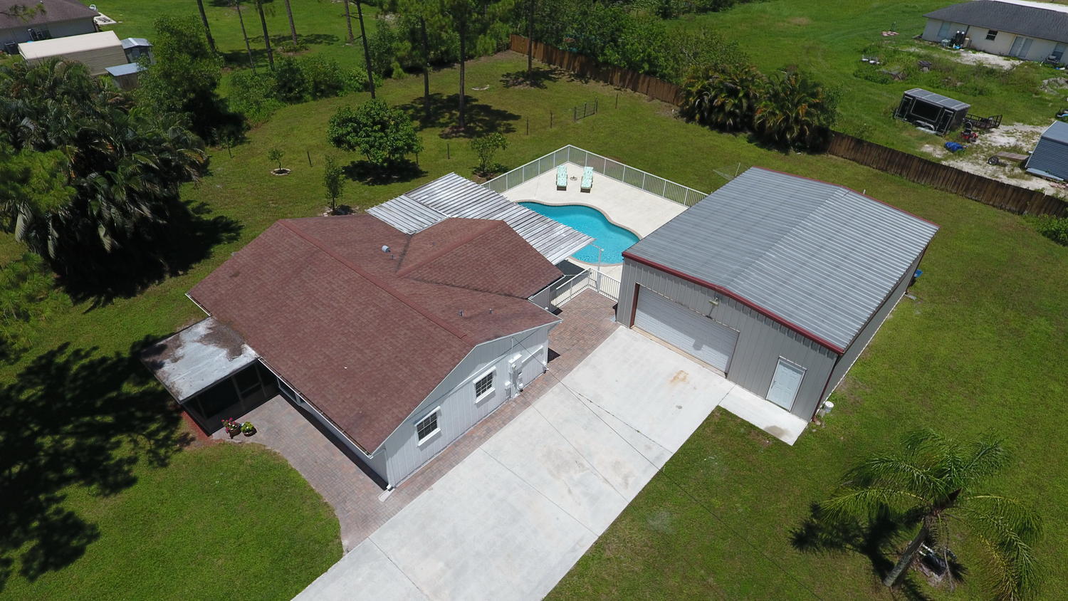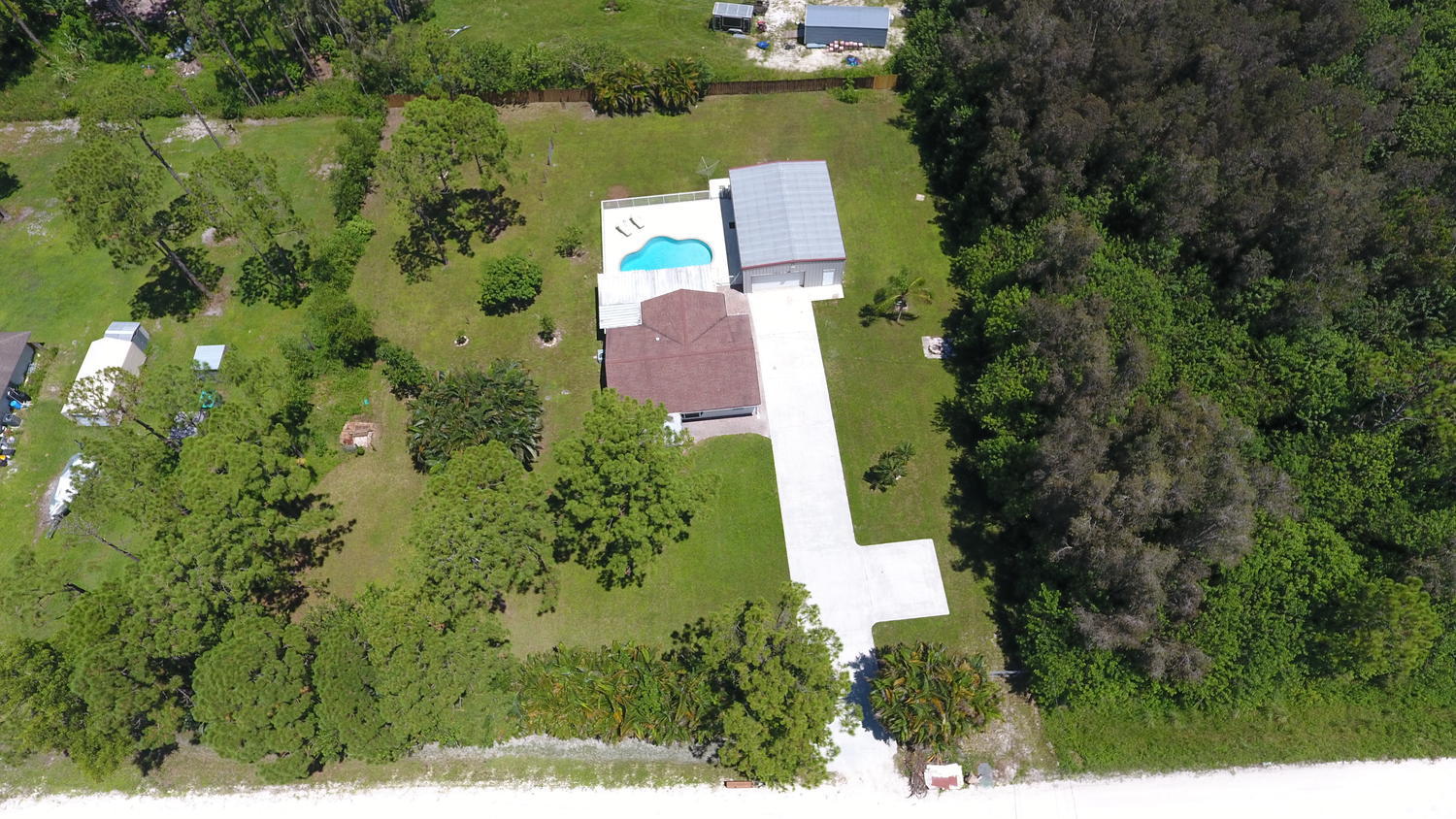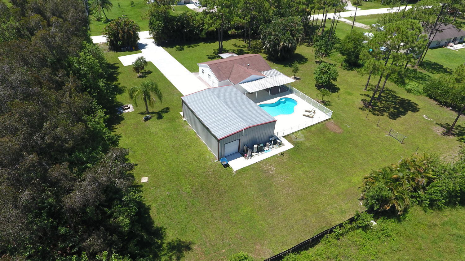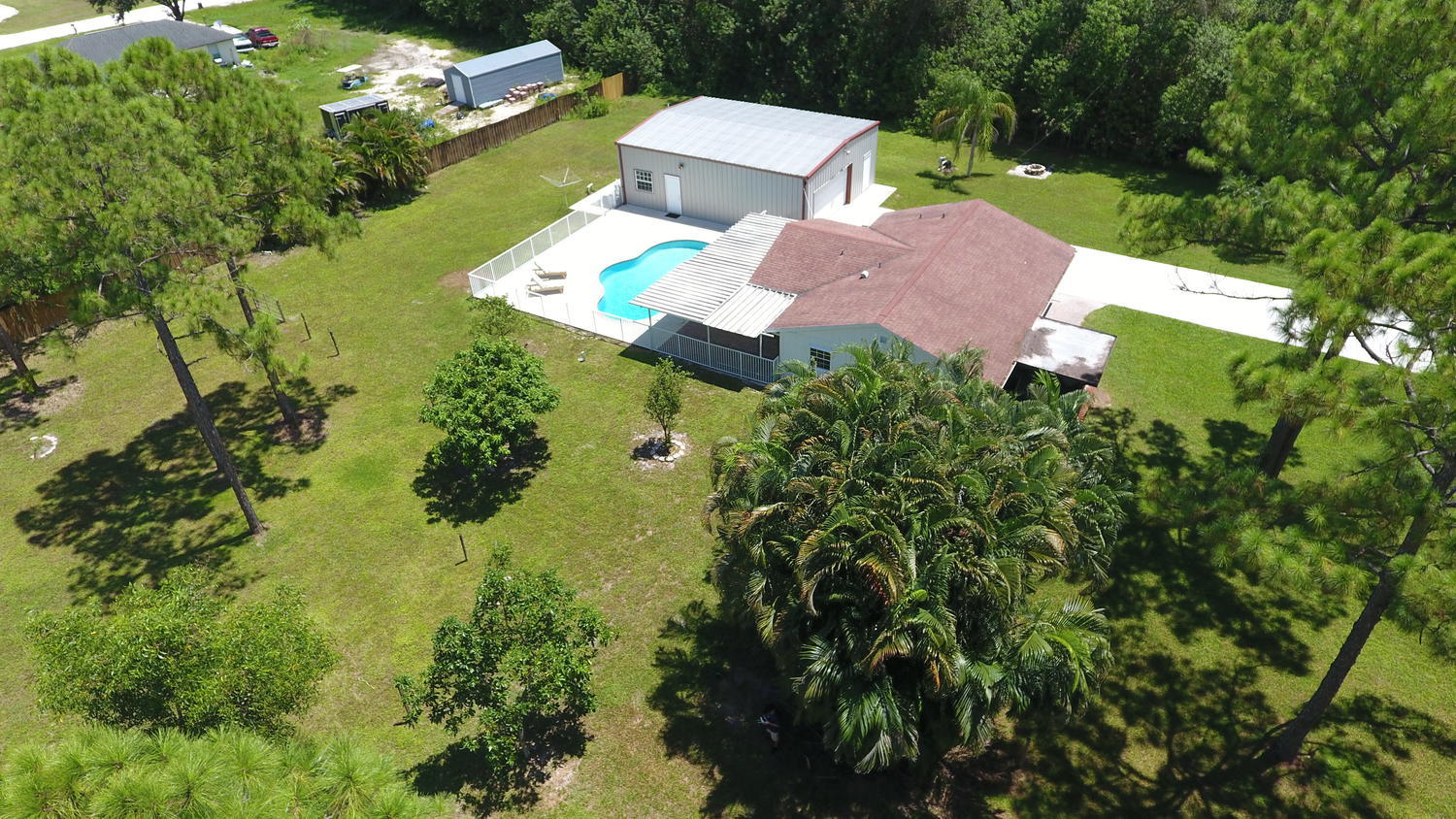 This charming home has been recently renovated, & has 3 bedrooms, 2 baths with a sparkling blue freeform pool! The kitchen has stainless steel appliances with a Chicago brick backsplash & island. There are numerous high hats, a large walk-in pantry/storage area, & there is laundry/utility room access. With wood laminate flooring throughout, the baths have ceramic tile. Exit the french doors to enjoy the relaxing covered patio & open brick paver deck. From here you can enter the detached cabana/pool room with full bath that could also be used as an office or even an art studio! The air conditioned cabana room is housed in the detached steel garage/building measuring 40' X 29', & 2 cars can park easily inside. There is industrial steel shelving, & a 3rd garage door entrance for a golf cart