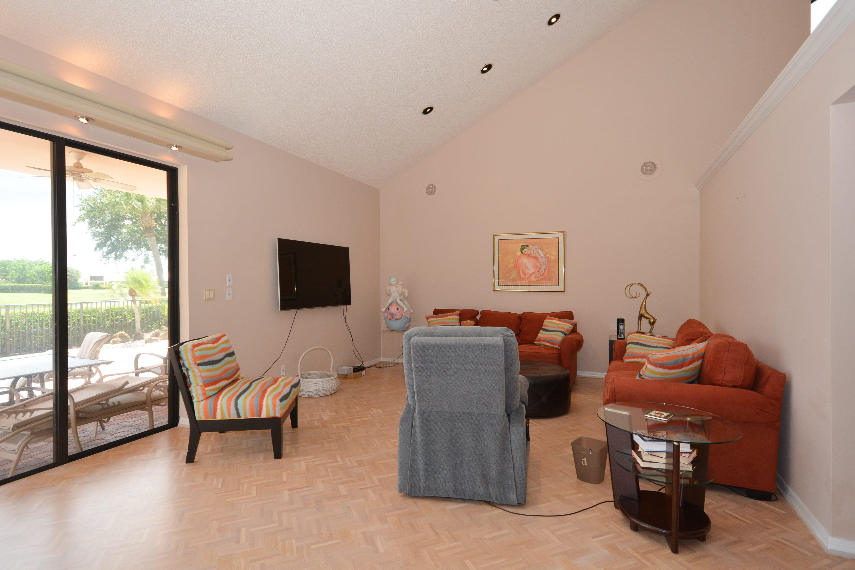 A must see sprawling one-story home located in northeast Boca Raton with gorgeous golf & lake views. This lovely 3 bedroom, 3.1 bath home features a bright, open and split bedroom floorplan. Herringbone hardwood floors in the main living areas, Fireplace and Wet bar in the living room, Full house water purification system. Large patio area great for entertaining with beautiful pool overlooking the lake and 17th Tee. Pool was resurfaced in 2015 & has a newer pump. 2 Zone A/C units (2015). Roof is approx. 10 years old. Replaced electric panels (2015). Replaced 7'' gutters around house. Country Club membership is required.