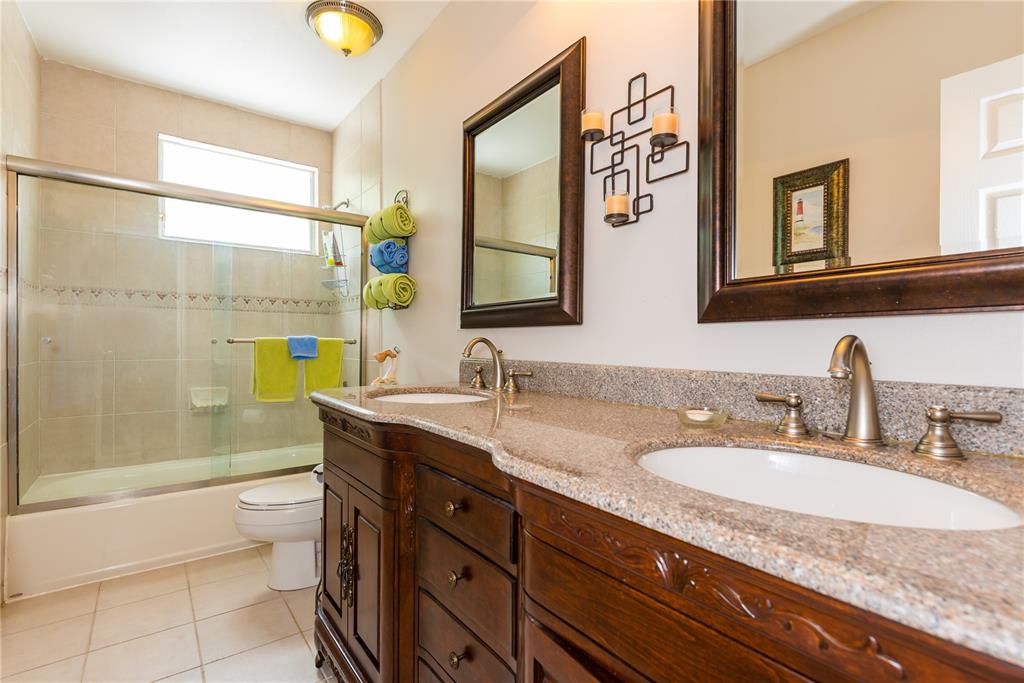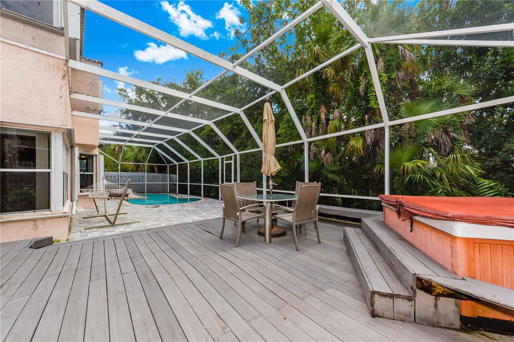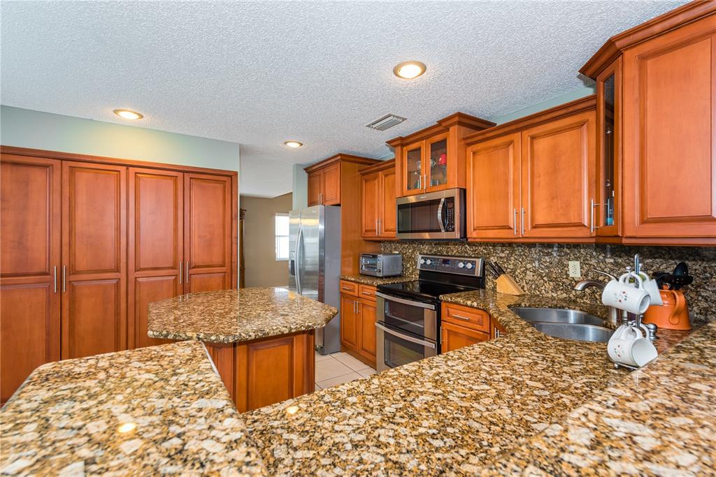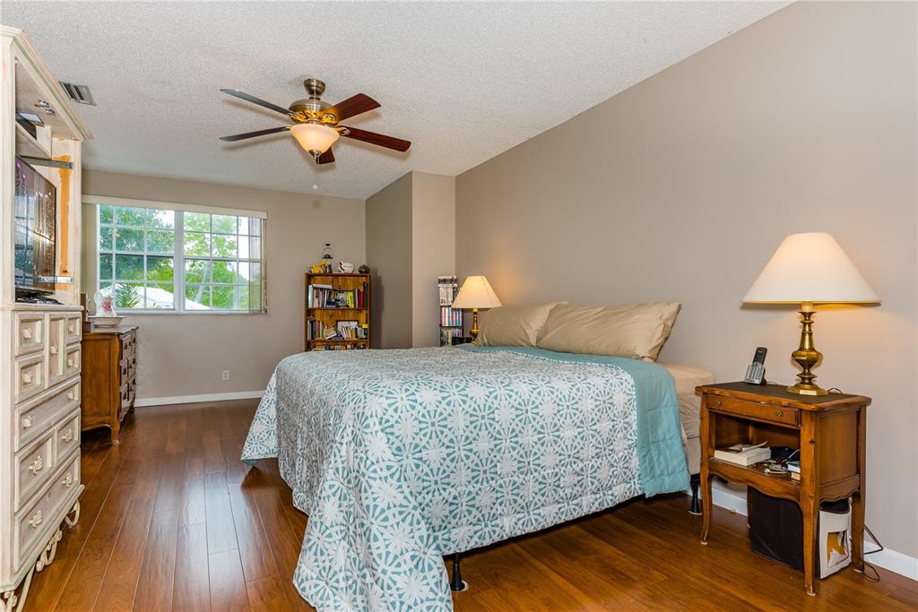 Look no further! This 4 bedroom has 3 full bathrooms, is spacious, well kept and has numerous upgrades. The huge master suite upstairs, has a king-sized bed with an oversized walk-in mirrored closet that opens into a spa-like bathroom, freshly tiled, with his & her wood w/granite sinks. All bedrooms have laminate flooring upstairs. Whether full sized or queen sized beds in the rooms, there is still plently of space for furniture and even excercise equipment! The kitchen has stainless steel appliances, granite counter tops, plus an island, wooden cabinets & pantry, opens into a breakfast nook, that overlooks a den and a screened expansive patio & deck area beside the water with lush vegetation. There is a full sized laundry room with washer & dryer, plus has accordian hurricane shutters!