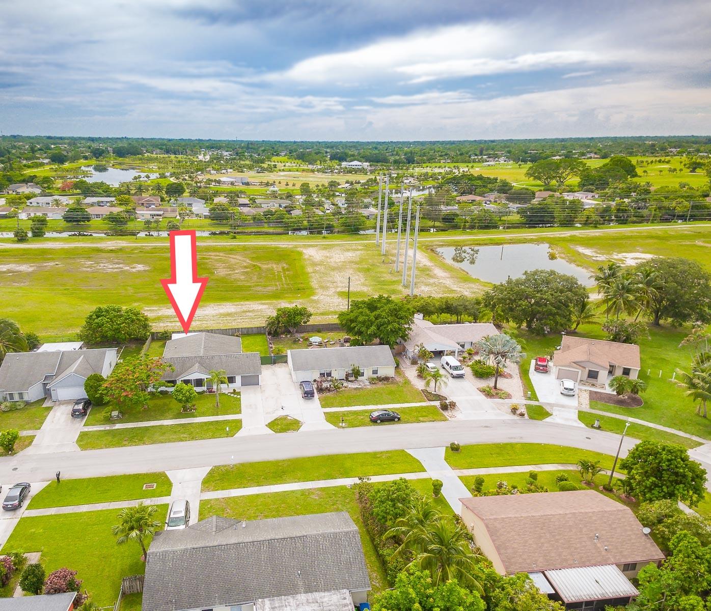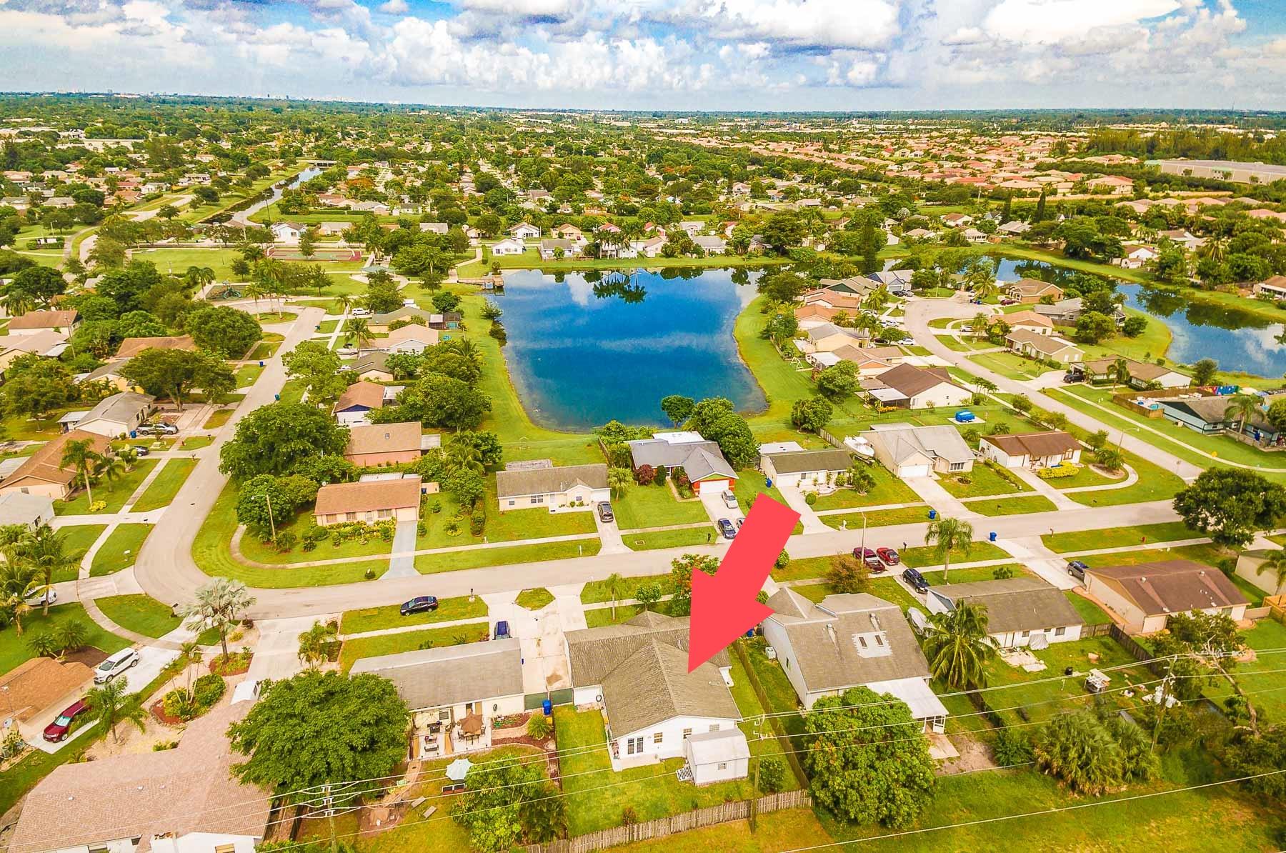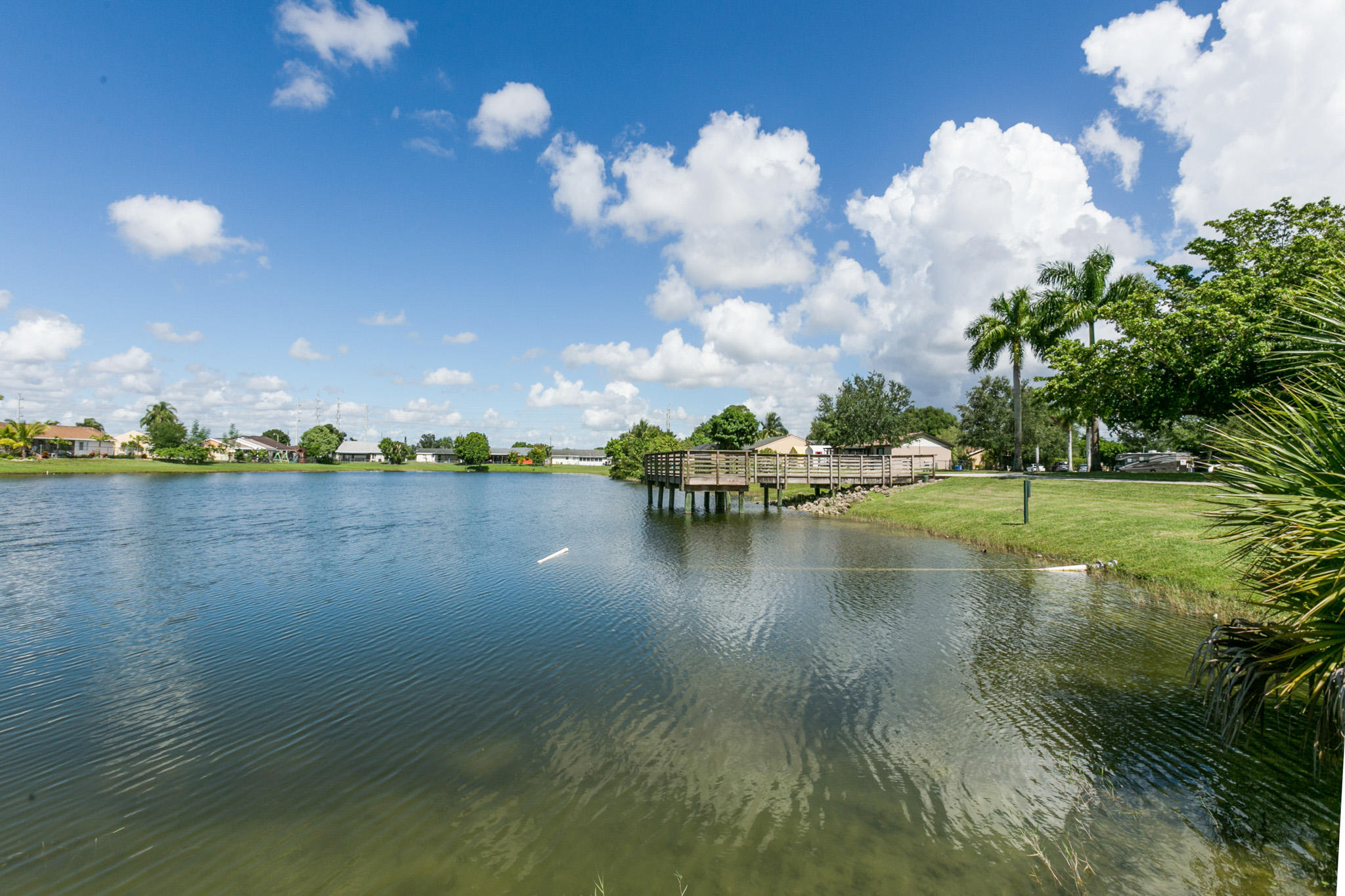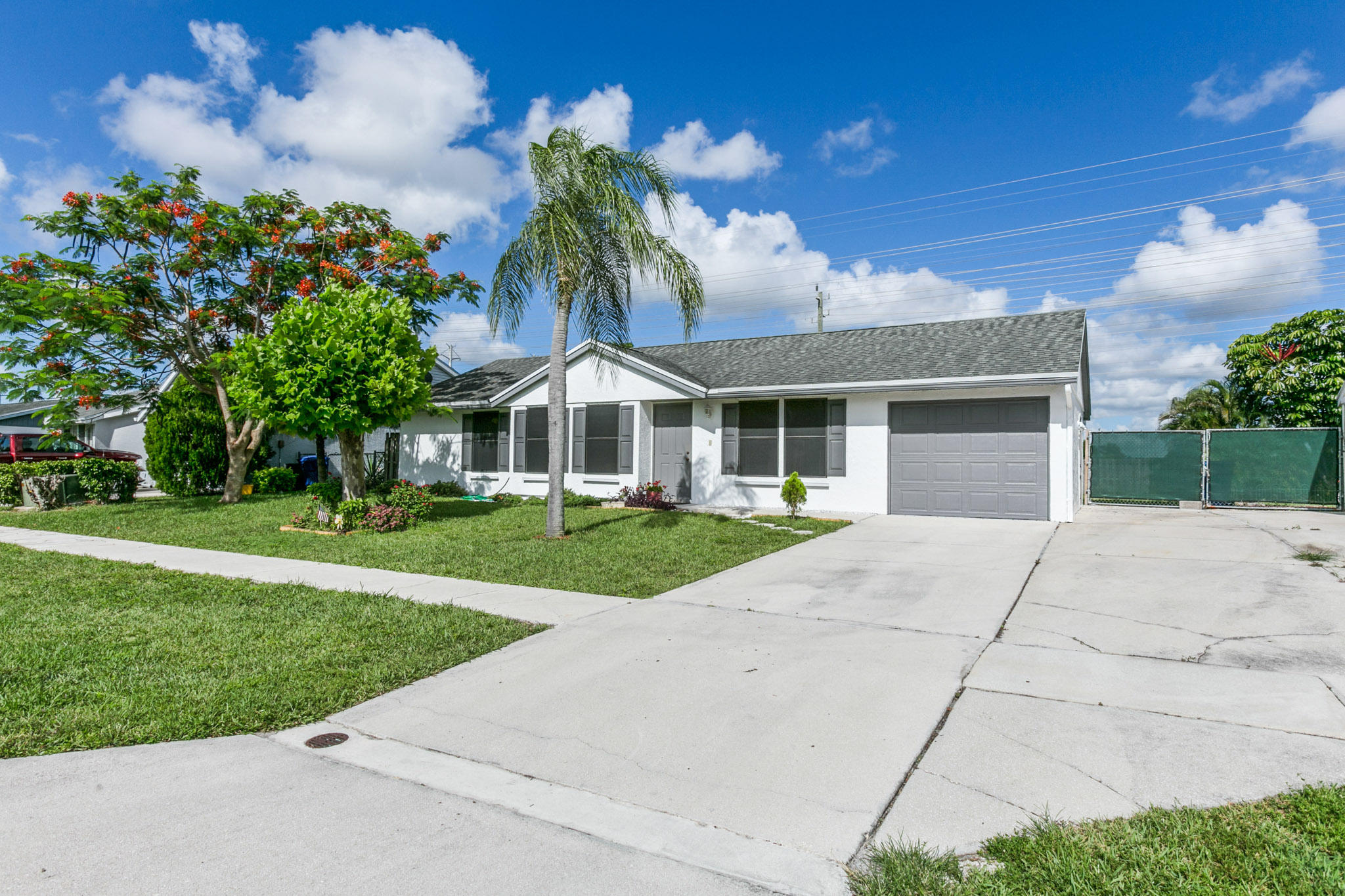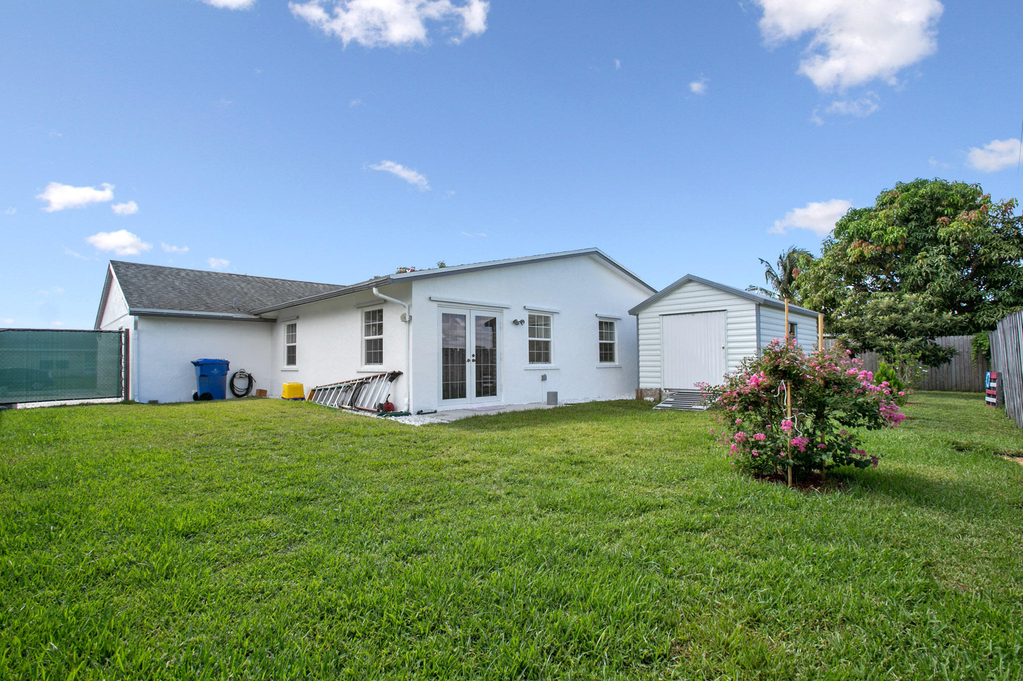 You'll love this charming ranch home with a spectacular Great Room with vaulted knockdown ceilings, recessed lighting, tons of windows, french doors that lead out to a fenced yard with new sod. For tinkering around in the yard, it also has a large 10' x 16' workshop shed. This 3 bedroom, 2 bathroom home with 1 car garage will give you 2,328 sq ft of generous space to move about. New garage door with hurricane brace installed. Just painted exterior and added new window shutters. Inside just painted and knockdown ceilings. Situated in a quiet and friendly neighborhood with no through traffic. Two blocks away is a recreational park that includes playground, basketball, dock for fishing and dog park. Two miles from from Village of Royal Palm Beach Commons Park & public golf.