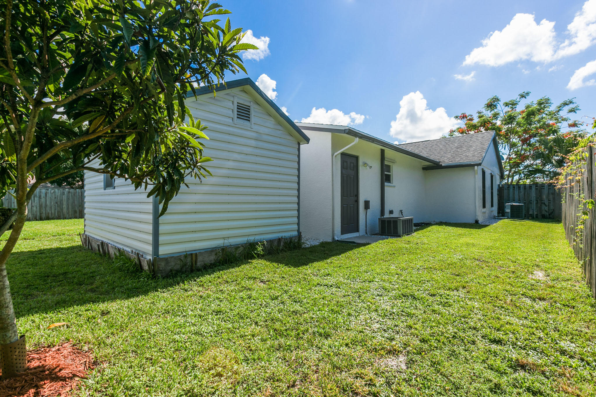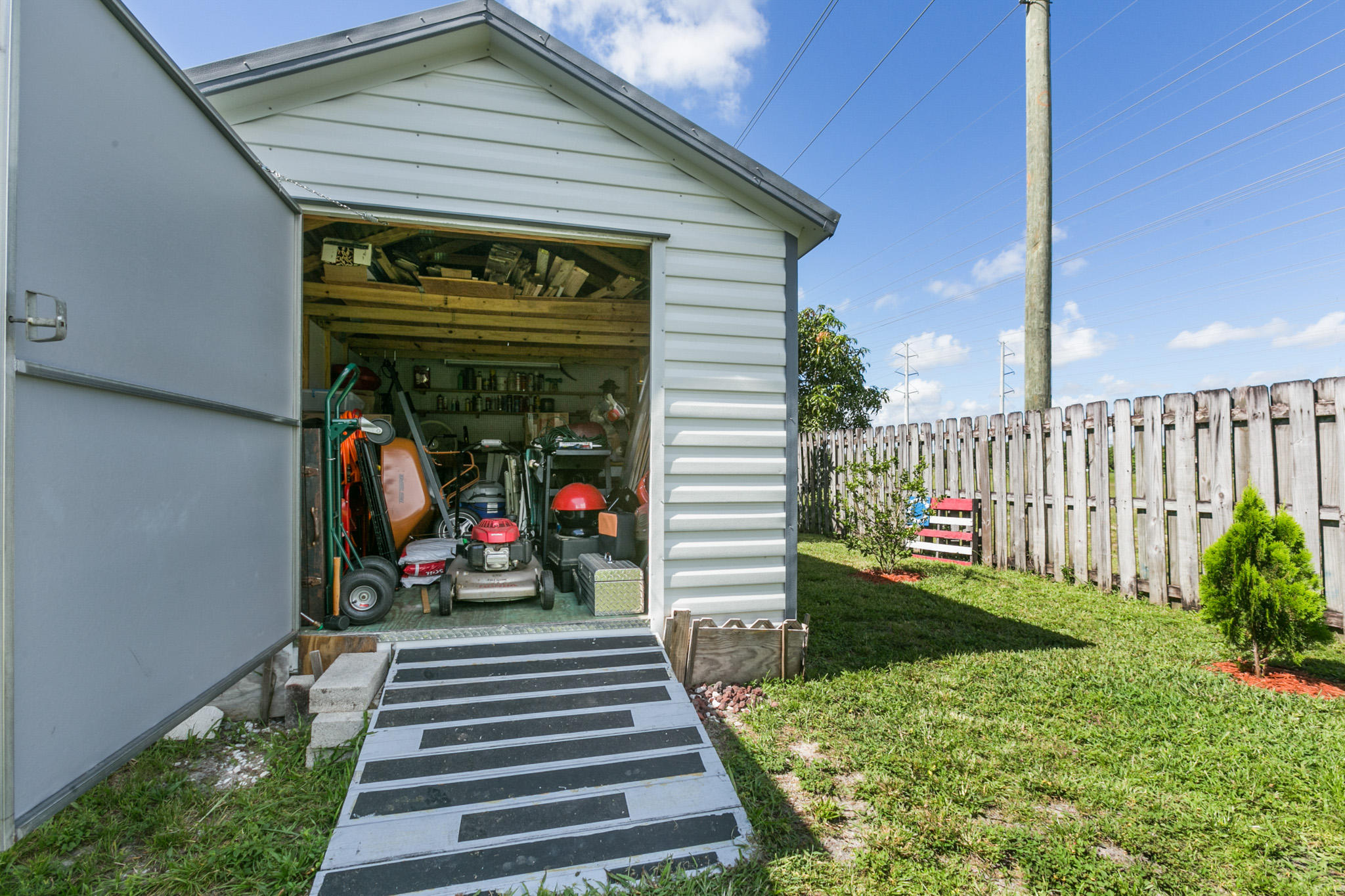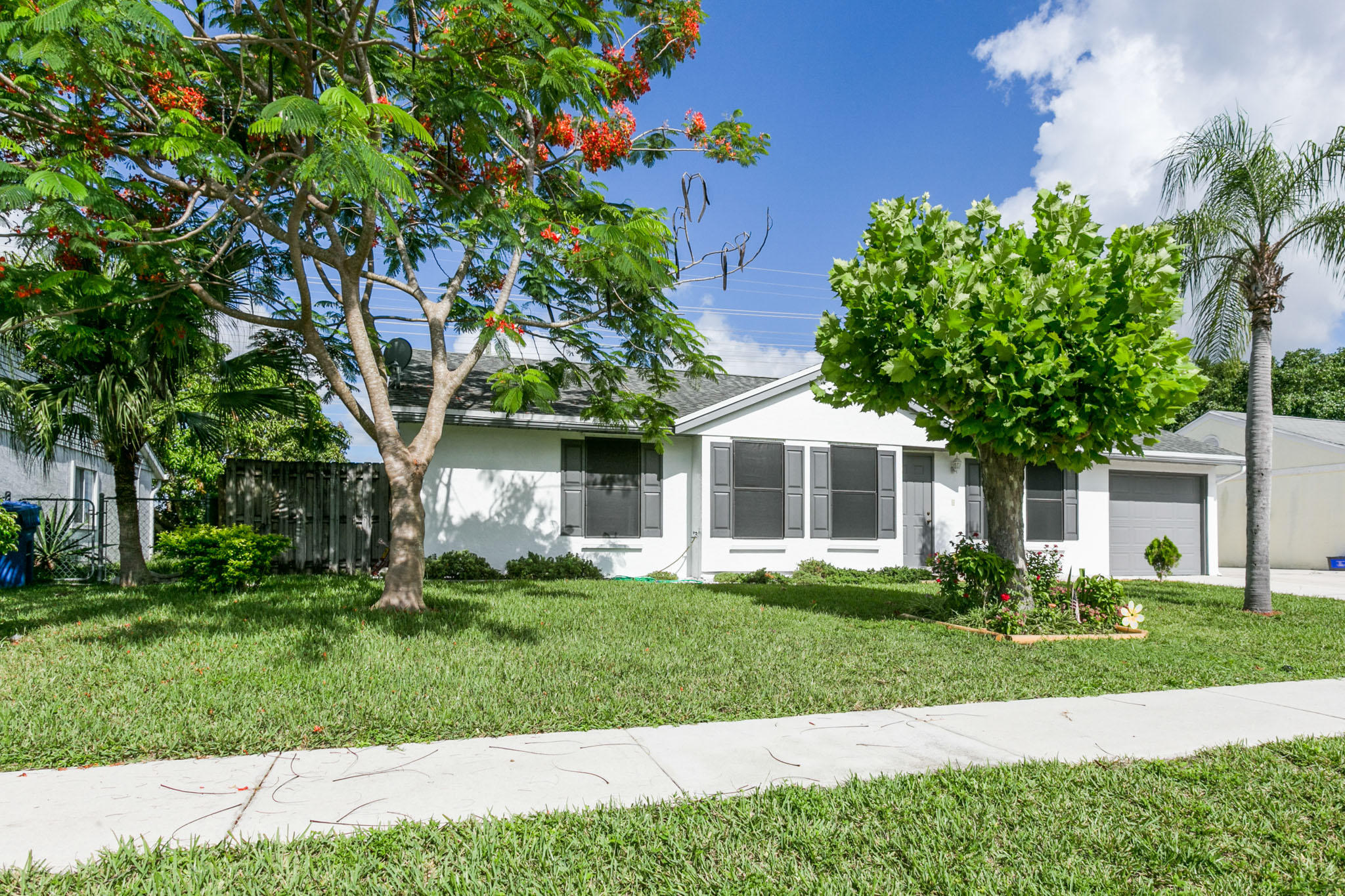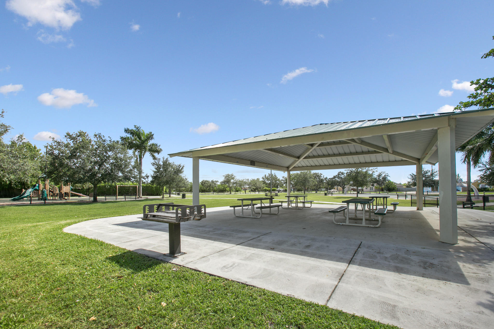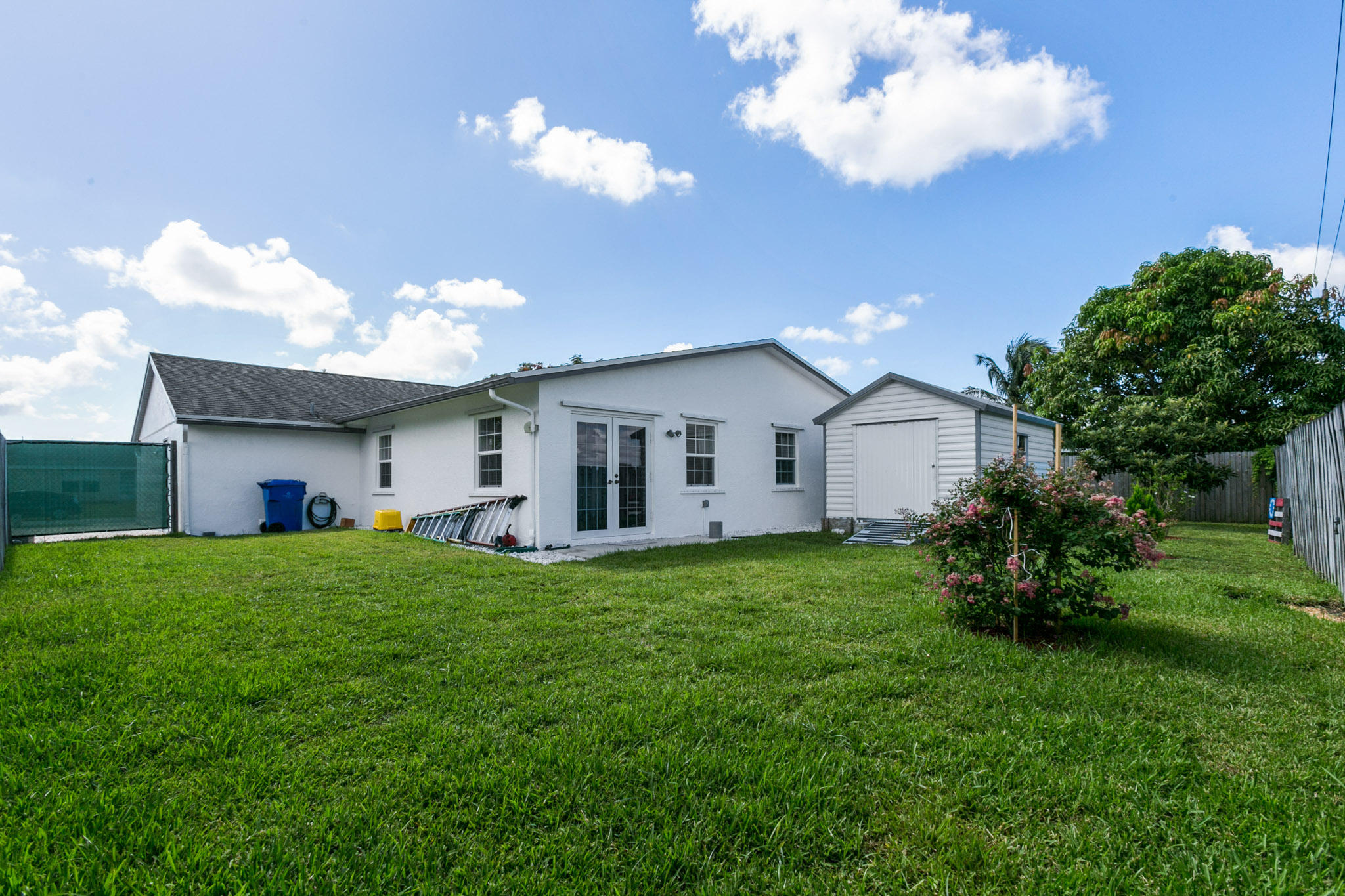 You'll love this charming ranch home with a spectacular Great Room with vaulted knockdown ceilings, recessed lighting, tons of windows, french doors that lead out to a fenced yard with new sod. For tinkering around in the yard, it also has a large 10' x 16' workshop shed. This 3 bedroom, 2 bathroom home with 1 car garage will give you 2,328 sq ft of generous space to move about. New garage door with hurricane brace installed. Just painted exterior and added new window shutters. Inside just painted and knockdown ceilings. Situated in a quiet and friendly neighborhood with no through traffic. Two blocks away is a recreational park that includes playground, basketball, dock for fishing and dog park. Two miles from from Village of Royal Palm Beach Commons Park & public golf.