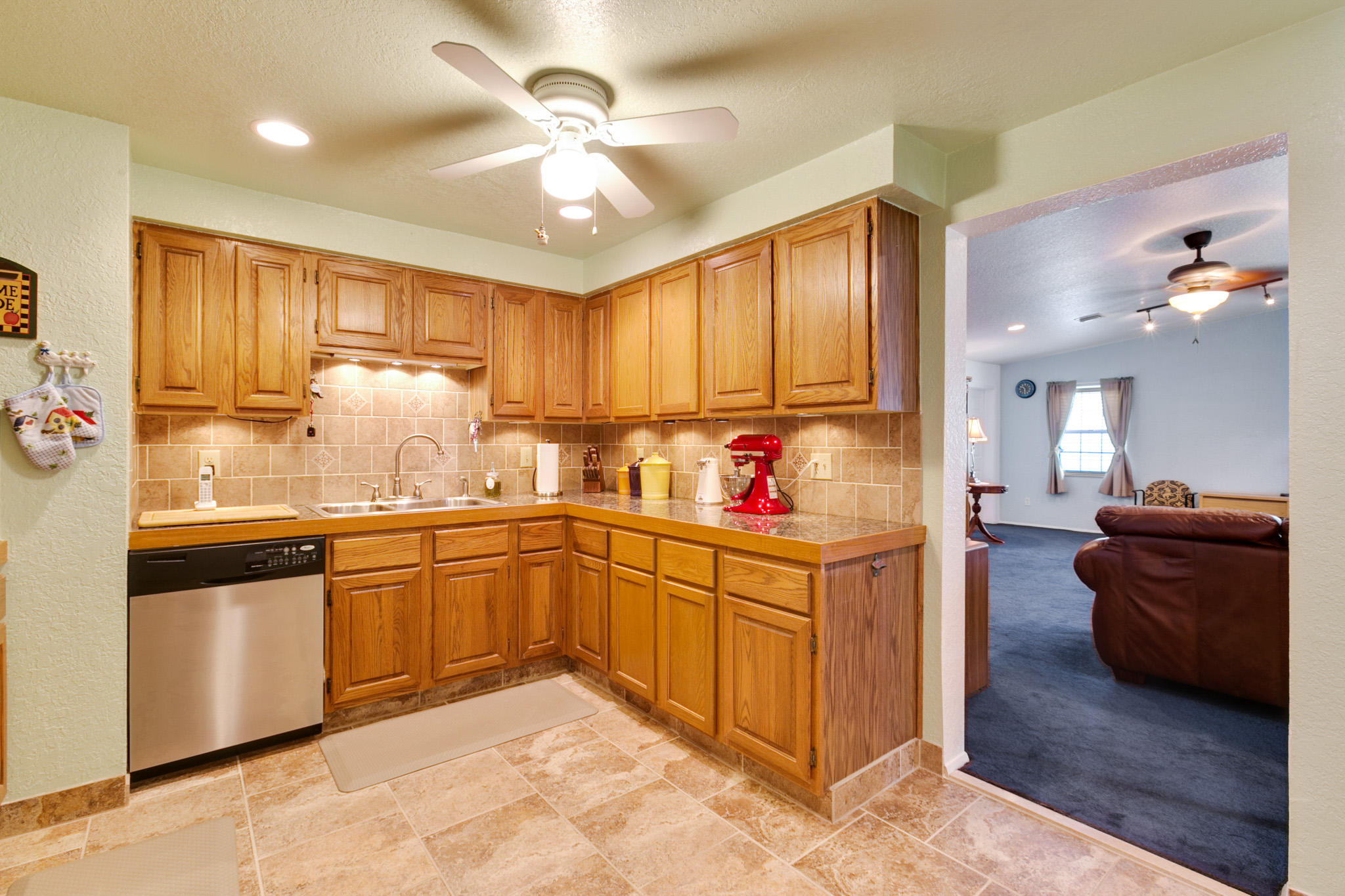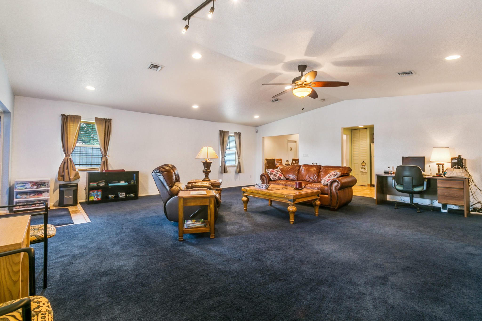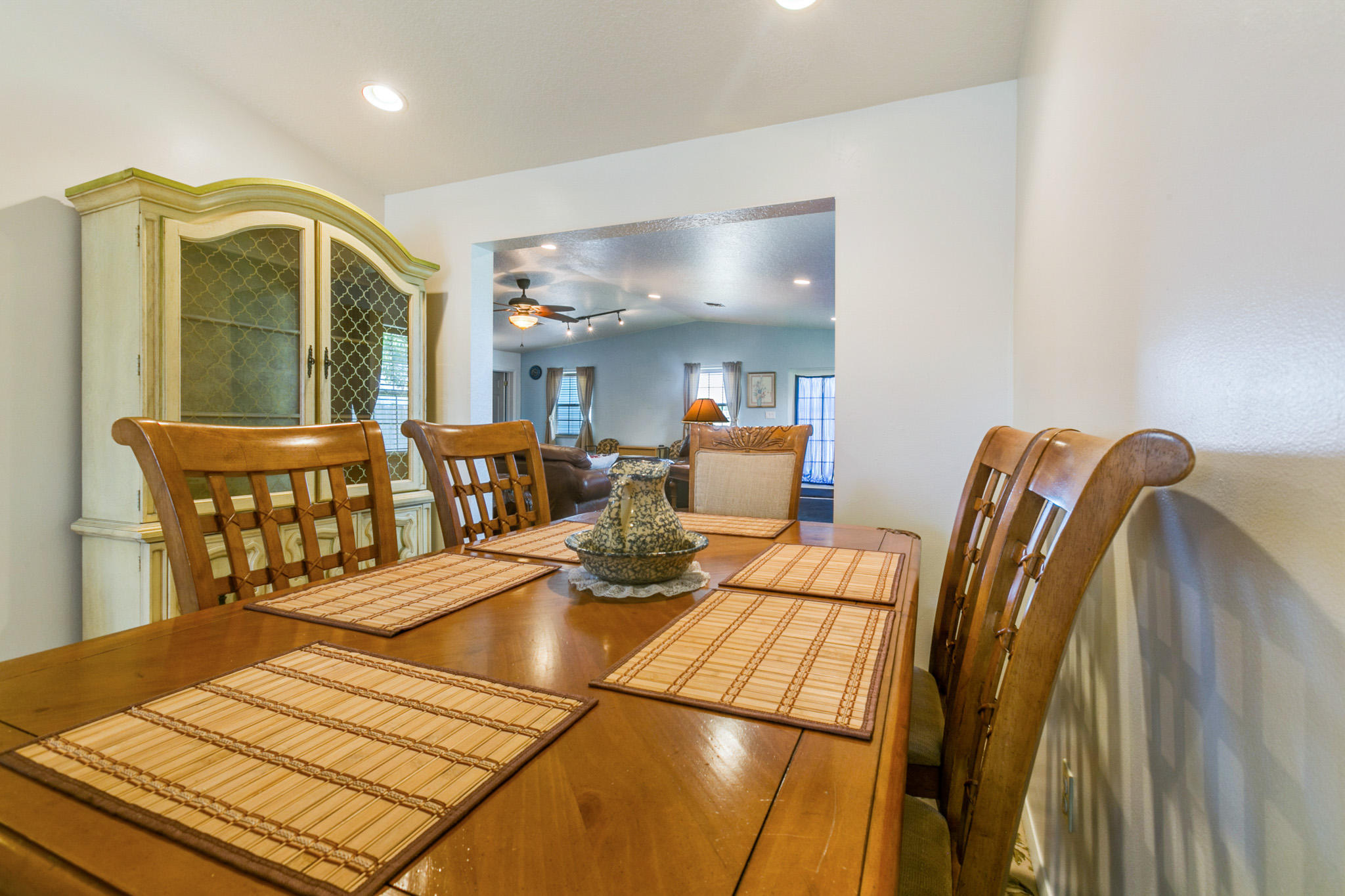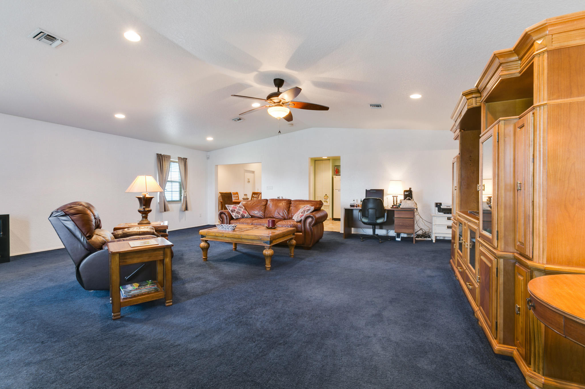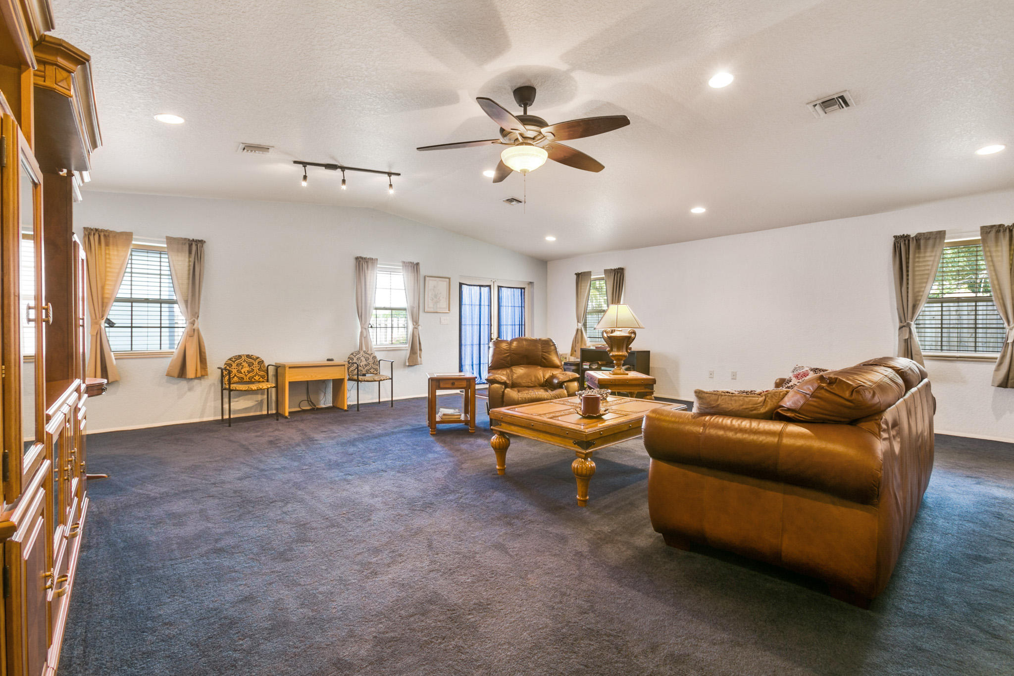 You'll love this charming ranch home with a spectacular Great Room with vaulted knockdown ceilings, recessed lighting, tons of windows, french doors that lead out to a fenced yard with new sod. For tinkering around in the yard, it also has a large 10' x 16' workshop shed. This 3 bedroom, 2 bathroom home with 1 car garage will give you 2,328 sq ft of generous space to move about. New garage door with hurricane brace installed. Just painted exterior and added new window shutters. Inside just painted and knockdown ceilings. Situated in a quiet and friendly neighborhood with no through traffic. Two blocks away is a recreational park that includes playground, basketball, dock for fishing and dog park. Two miles from from Village of Royal Palm Beach Commons Park & public golf.