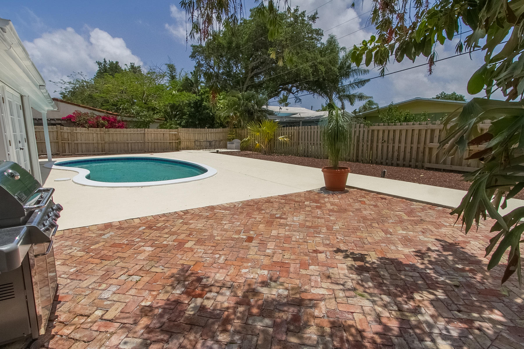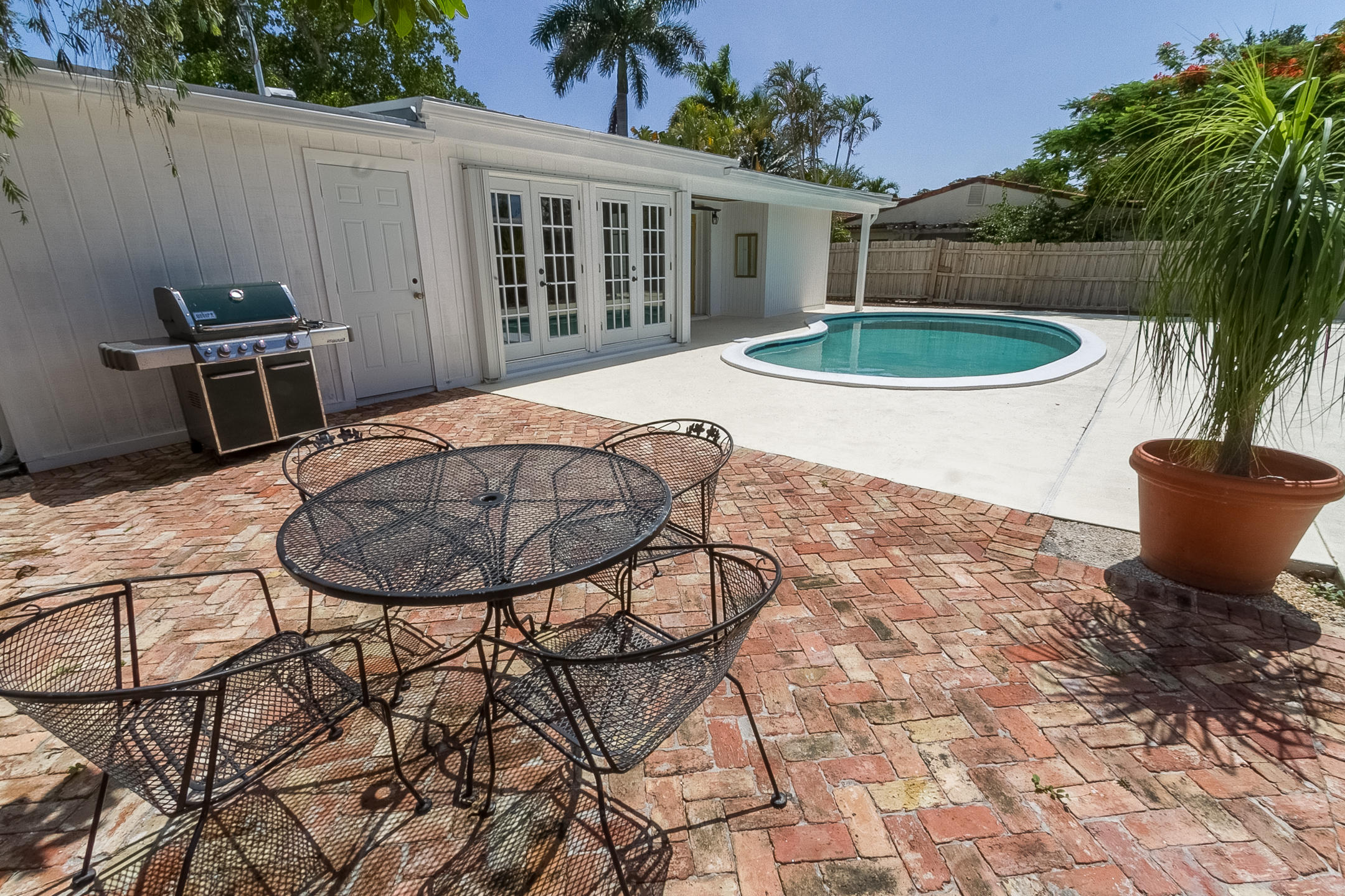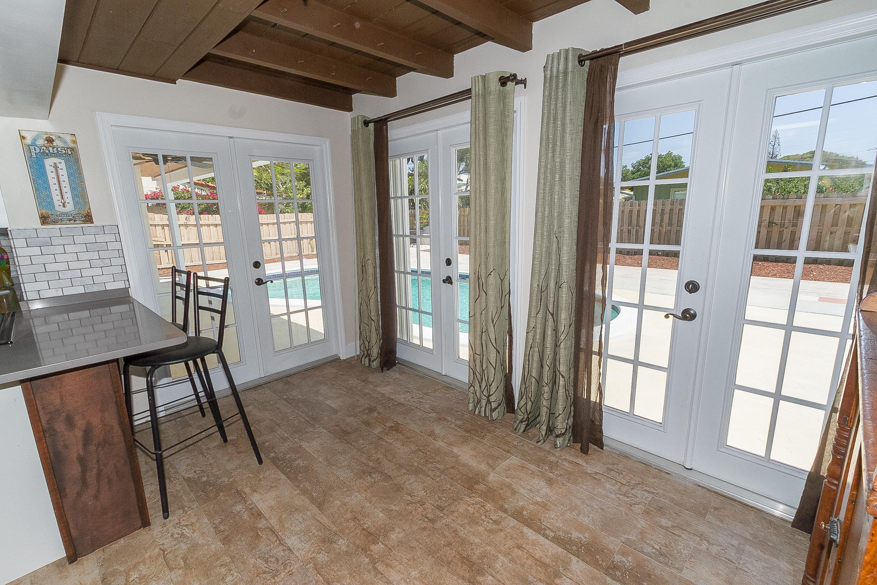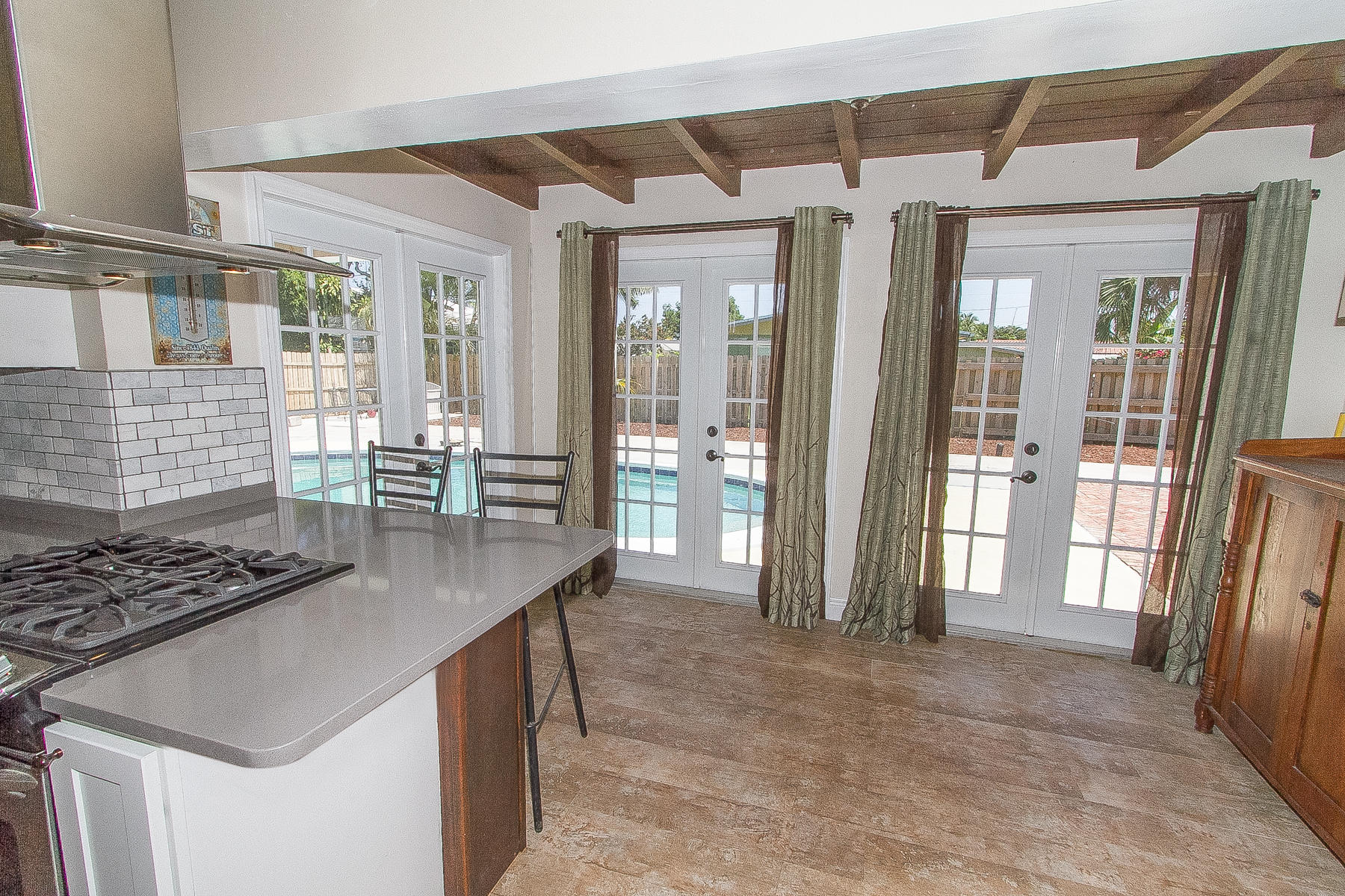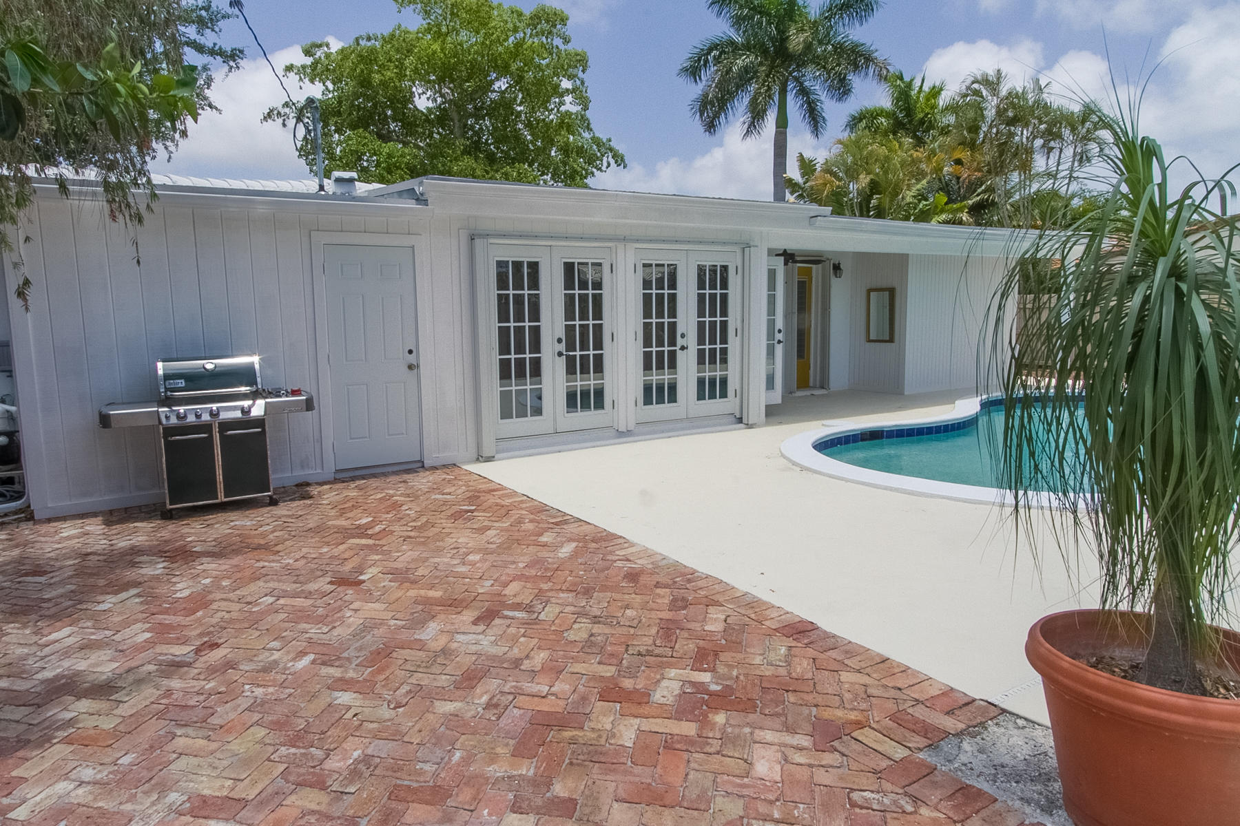 Charming Boca Raton pool home in high demand Boca Raton Square with highly rated schools with great features including and a completely redesigned open kitchen in with gas range and stainless appliances, new beautiful neutral porcelain flooring THROUGHOUT the home, bathrooms remodeled all in 2013, gutters installed in 2011, newer A/C condenser (2014) and newer S-style roof installed in 2011, storm protection with use of impact windows, accordion shutters, and wood shutters, cabana Bath directly off the pool, gas from city for the range and hot water heater, new electric panel and house rewired 2012, brick driveway 2013 and large brick patio adjacent to pool, fence doors and wood beamed ceiling in dining area off pool, and sought after SE exposure.