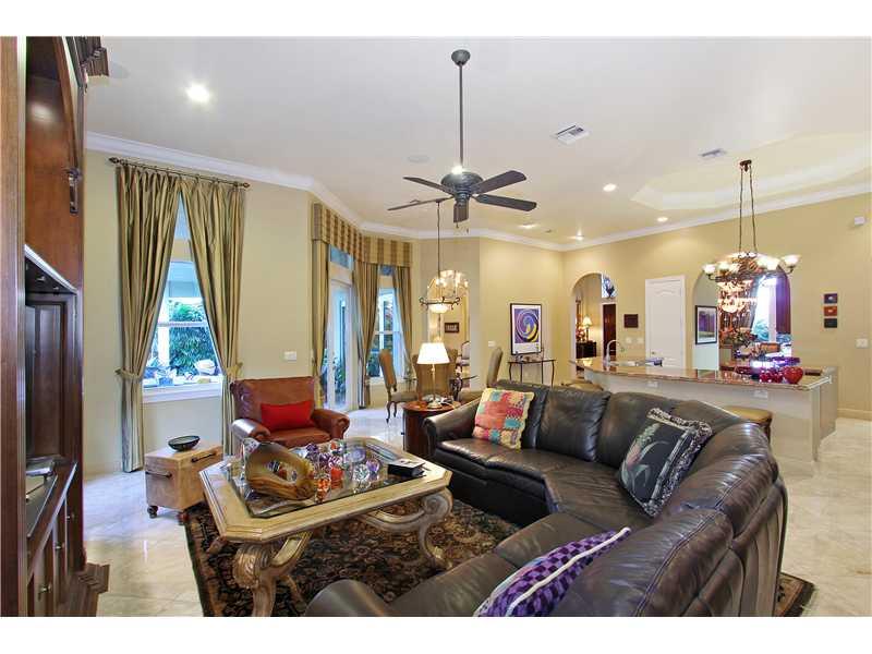 Beautifully presented one level Mediterranean inspired 4BR/3BA/2CG pool residence is certain to please. The foyer entry flows to dramatic formal living and dining rooms with impressive 13' to 17' tray ceilings and opens to exquisite chefs kitchen with ce nter island and wet bar. Large family room and breakfast nook, custom drapery, marble floors, impact windows and doors. Outside boasts a delightful covered loggia, sparkling pool with wet shelf and a summer kitchen ideal for entertaining. Generator Inc.