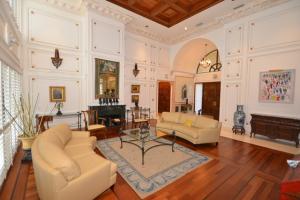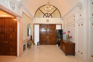 This meticulously-maintained one-story (no steps) home features magnificent architectural details throughout. Marble and inlaid hardwood floors, gorgeous coffered ceilings, crown and trim moldings, custom wainscoting, plantation shutters, and more show exquisite attention to detail. The living room features a fireplace and wet bar; the formal dining room features French doors leading to a picturesque patio; the office is wood-paneled and spacious. A large master suite features his & her baths with granite countertops and beautiful wood cabinets, large fully-outfitted closets, steam shower, and more. The kitchen, with high-end appliances, is open to the breakfast area and large family room. The home also features a large pool and patio area with lovely golf course views.