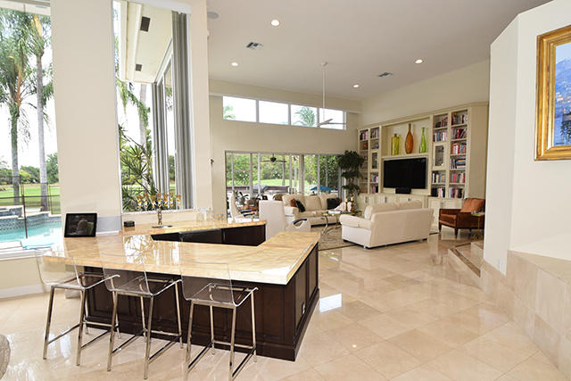 Beautifully-renovated Contemporary one-story 3 bedroom + office home with fabulous lake & golf course views in St. Andrews CC. Clean lines, marble floors, huge windows, high ceilings, wet bar with LED-illuminated onyx countertop, generator, new roof, new A/C units, new water heater, hurricane protection, and much more. The renovated island kitchen opens to the breakfast & family rooms. The kitchen features WOLF induction cooktop & Bosch dishwasher, double ovens + convection + microwave, wine refrigerator, Sub-Zero refrigerator + 2 refrigerator drawers. The master suite has new flooring, 3 walk-in closets, and his & her (fully-renovated) baths. Guest bedrooms are en-suite. The lanai, saltwater pool, and patio with BBQ + cooktop, are perfect for enjoying private lake and golf course views.