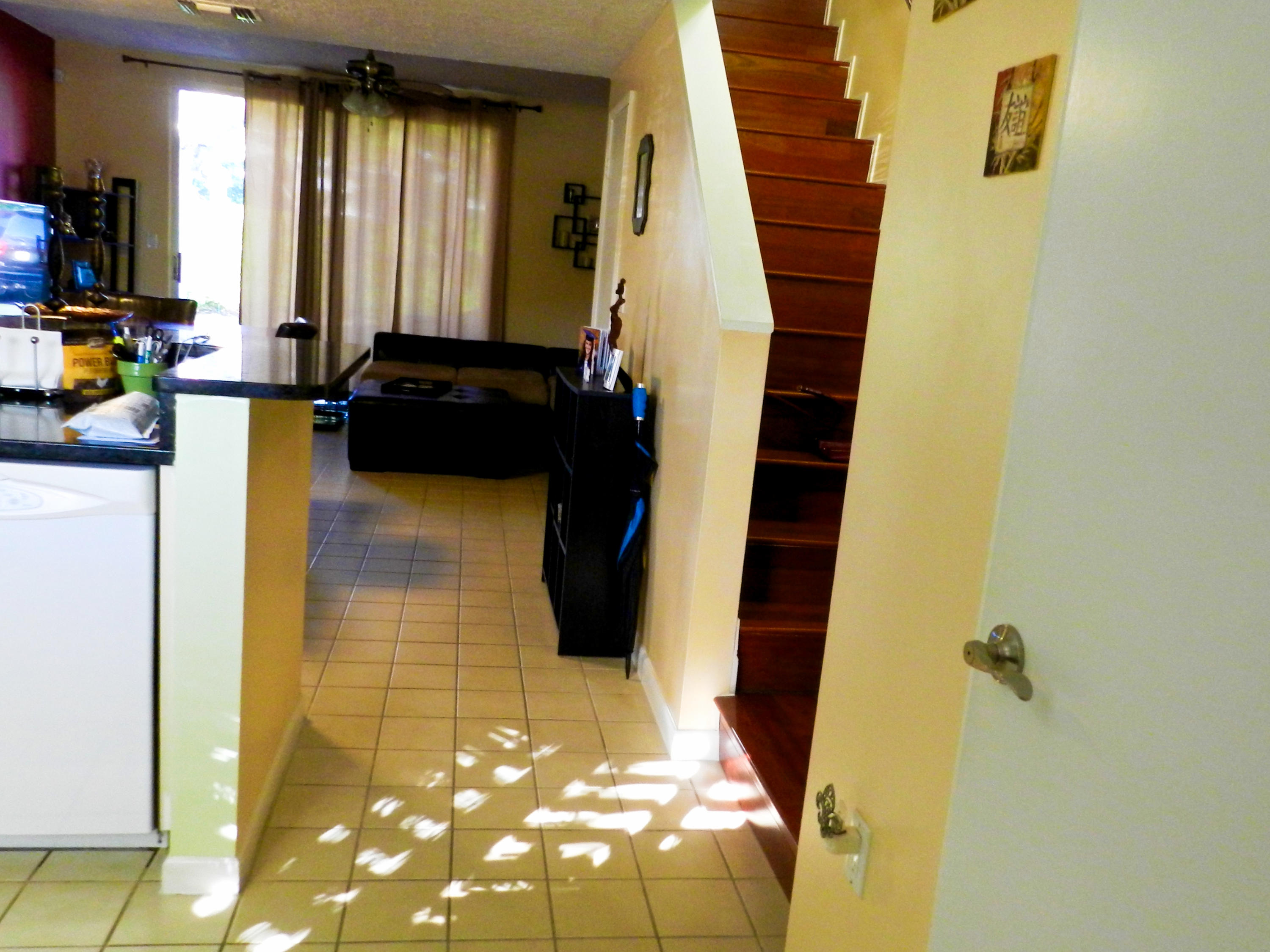 East Boca Townhome in Boca Quay, Jeffery Street gated community. 2 Bedroom 2 Bath with wood floors on 2nd floor and staircase. Tile floors and half bath downstairs. Plantation shutters in kitchen. Accordion Storm shutters upstairs and downstairs. 1 reserved space in front unit with additional owner space and plenty of guest parking. Community also has Pool and intracoastal views, includes water in hoa dues of $257 monthly.