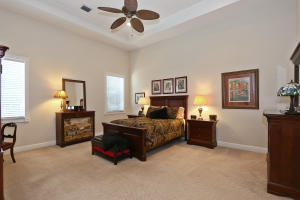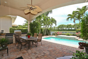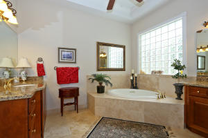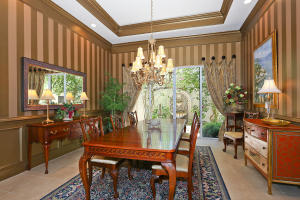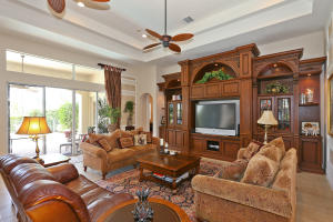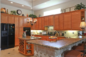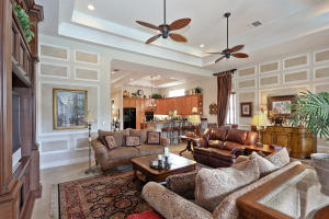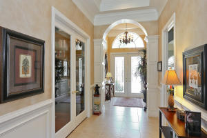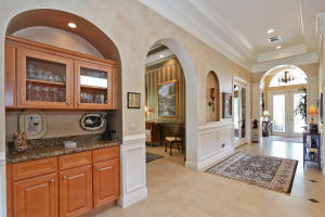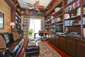 This is a one of a kind home w/many custom upgrades.Double lead glass entry doors, double coffered ceilings, max. crown molding,wainscoating & custom arches. Floors are ceramic tile in kit., large formal DR, and large great room. This home has the ultimate custom shelves, cabinets, and built-ins. Gourmet kitchen w/gas cooktop,granite counters, tumbled marble backsplash, island w/veg sink & disposal. Wine rack, pantry pull-outs. Library w/custom shelves & built-ins, wood floors,double glass doors w/touch lights. Master suite w/his&her baths, whirlpool tub & bidet. Powder bath has Venetian plaster & designer tile. 2 guest suites w/baths. Covered patio w/ summer kitchen. Pool has a great private water view, w/sheer descent waterfall. Paver brick motor court. Side entry 2.5 garage with