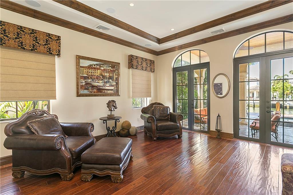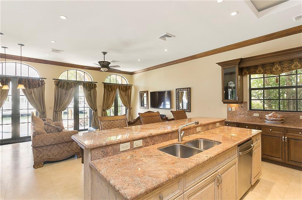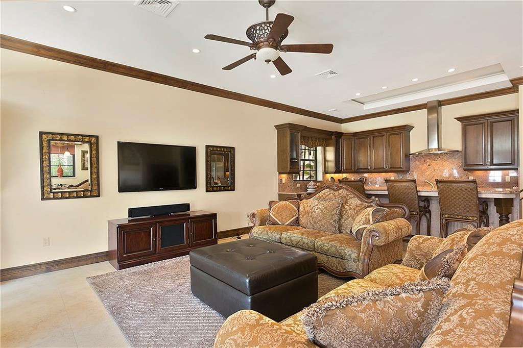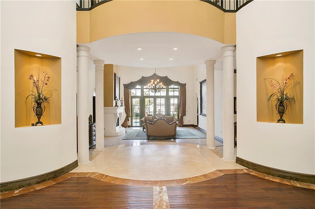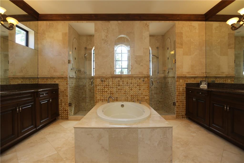 : Exquisite Mediterranean home -- like new built in 2006. Designed By Benchmark Homes and Annie Caruthers of In-Site Design Breathtaking waterview entry into marble and wood grand foyer with elegant curving staircase. Master suite encompasses entire side of house with waterfront balcony, custom his and her closets, a separate sitting area with beverage bar. Huge master bath with generous separate wash areas, vanity, separate WC and 2 entrances to shower which spans width of bathroom. Elegant catwalk