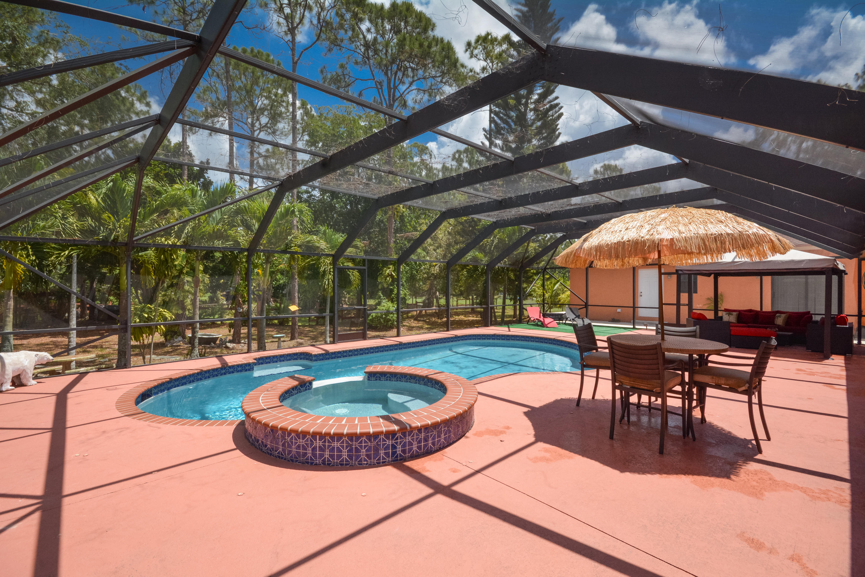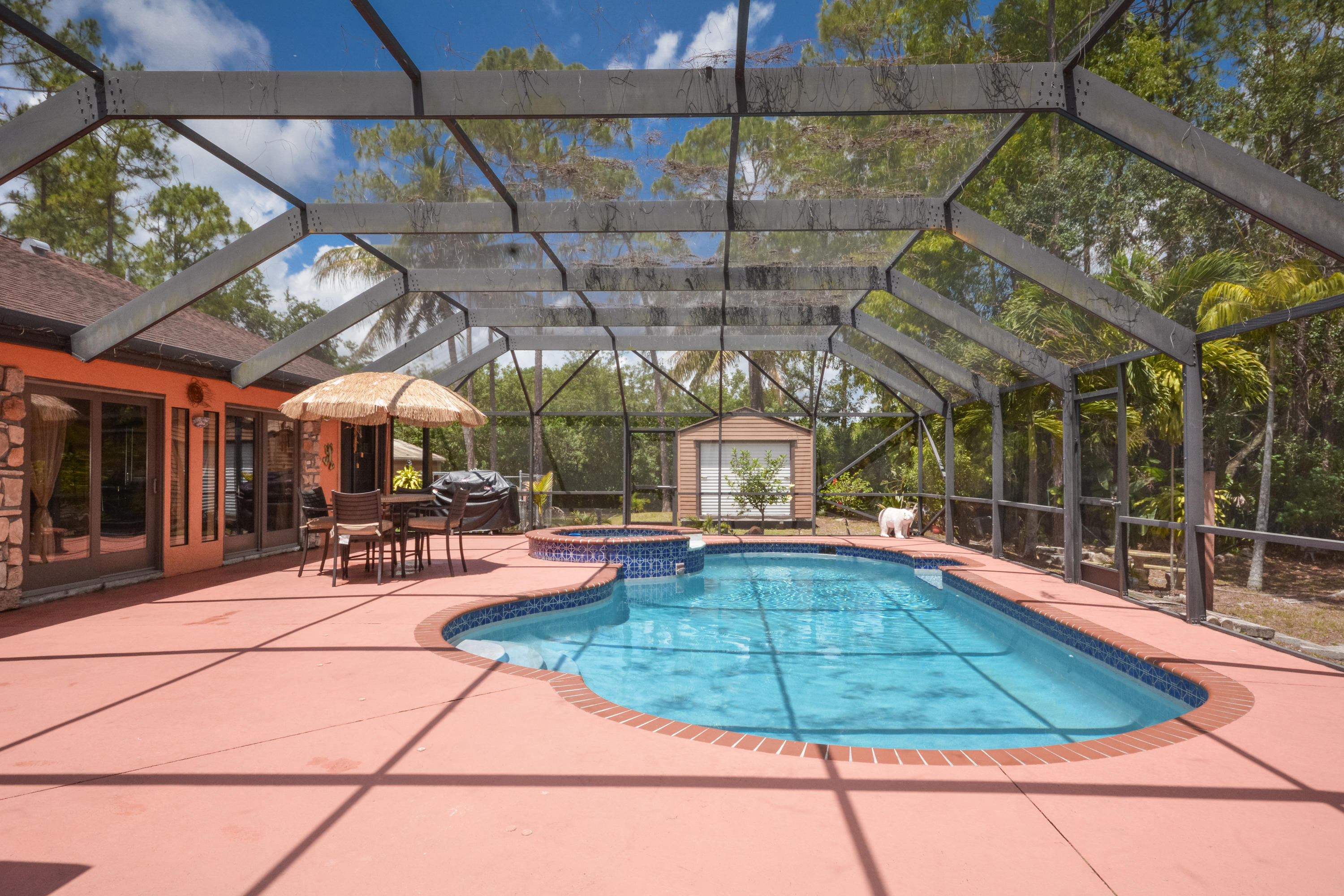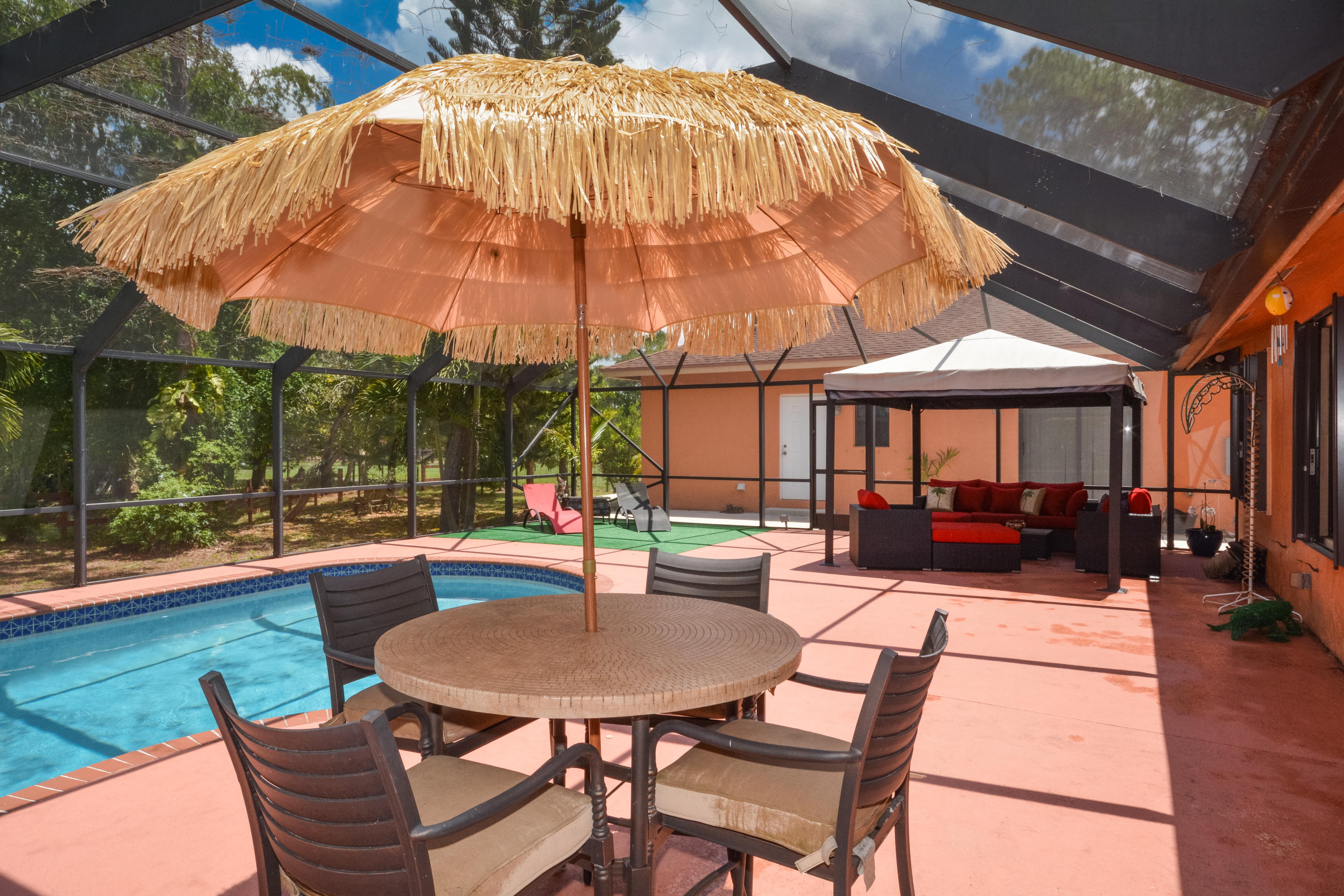 OVER 2 ACRE LOT! PRIVACY FENCED! OPEN DESIGN SPLIT FLOOR PLAN 3BR/2BA/2CG.FOYER ENTRANCE TO LIVING ROOM, OPEN KITCHEN W/SS APPLIANCES. ENCLOSED FLORIDA ROOM. ROOL WITH BABY FENCE AND DOME SCREEN. STABLES! FREE STANDING BUILDING BUILT IN 2009 AND ALL PERMITS CLOSED 2BR/1BA MOTHER IN LAW SUITE. KITCHEN W/ STAINLESS APPLIANCES. TILE AND RENOVATED BEDROOM. STACKABLE W/D.