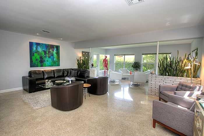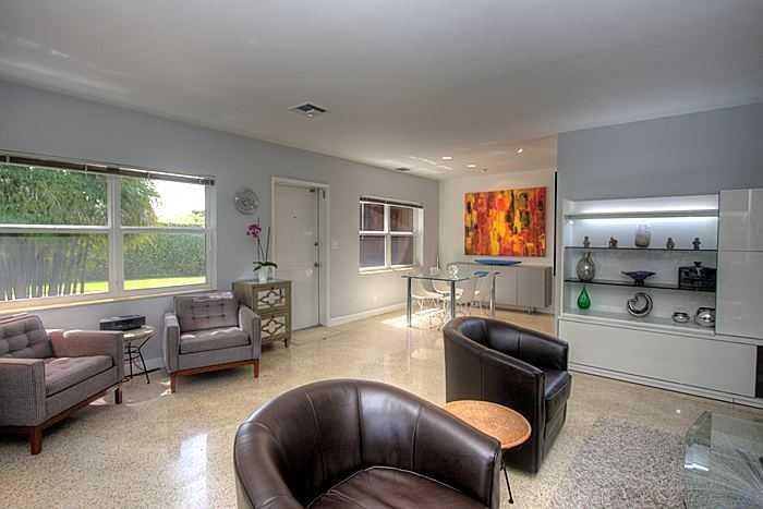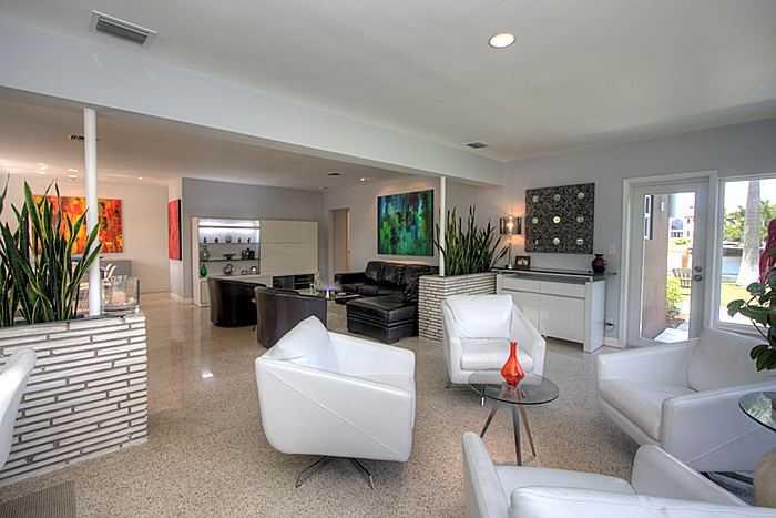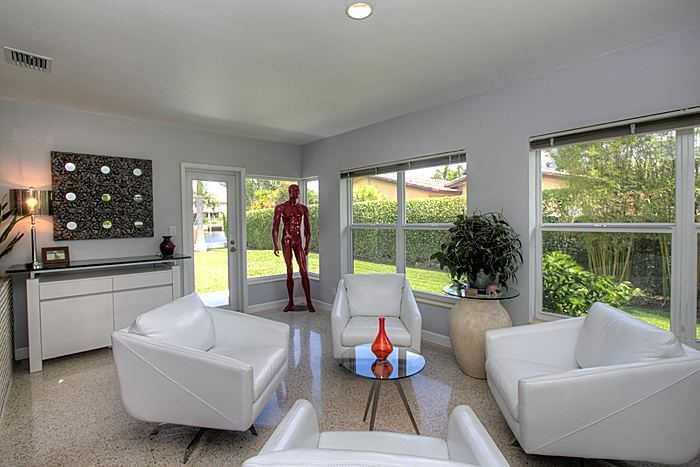 Hip mid-century modern residence east of US 1, situated directly on the widest part of the Middle River. Updated to perfection in 2011, this gorgeous, bright & airy turn-key home features cool terrazzo floors throughout, stunning modern kitchen, impact wi ndows/doors, and newer AC & roof. Tucked away on a quiet cul-de-sac, with a splendid park-like setting, this oversized lot features a long private driveway, 80' dock, spacious yard with room for a pool, and spectacular wide waterway views.