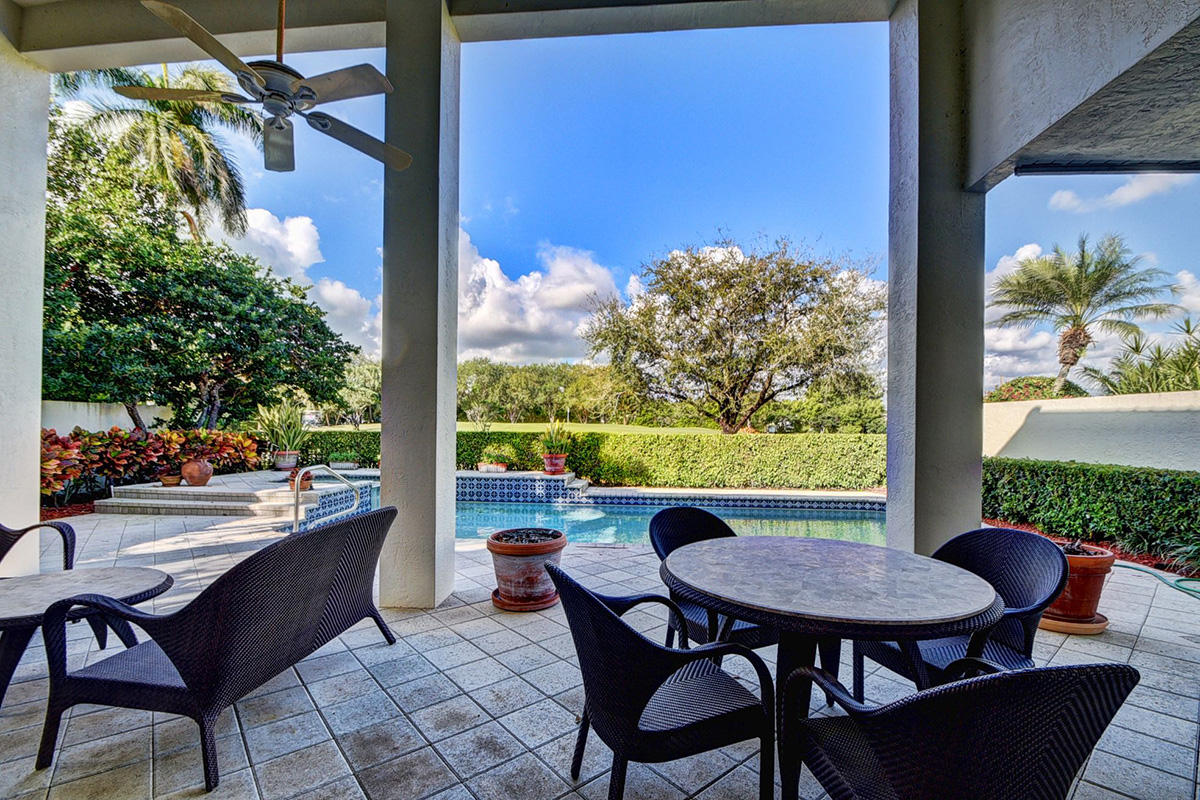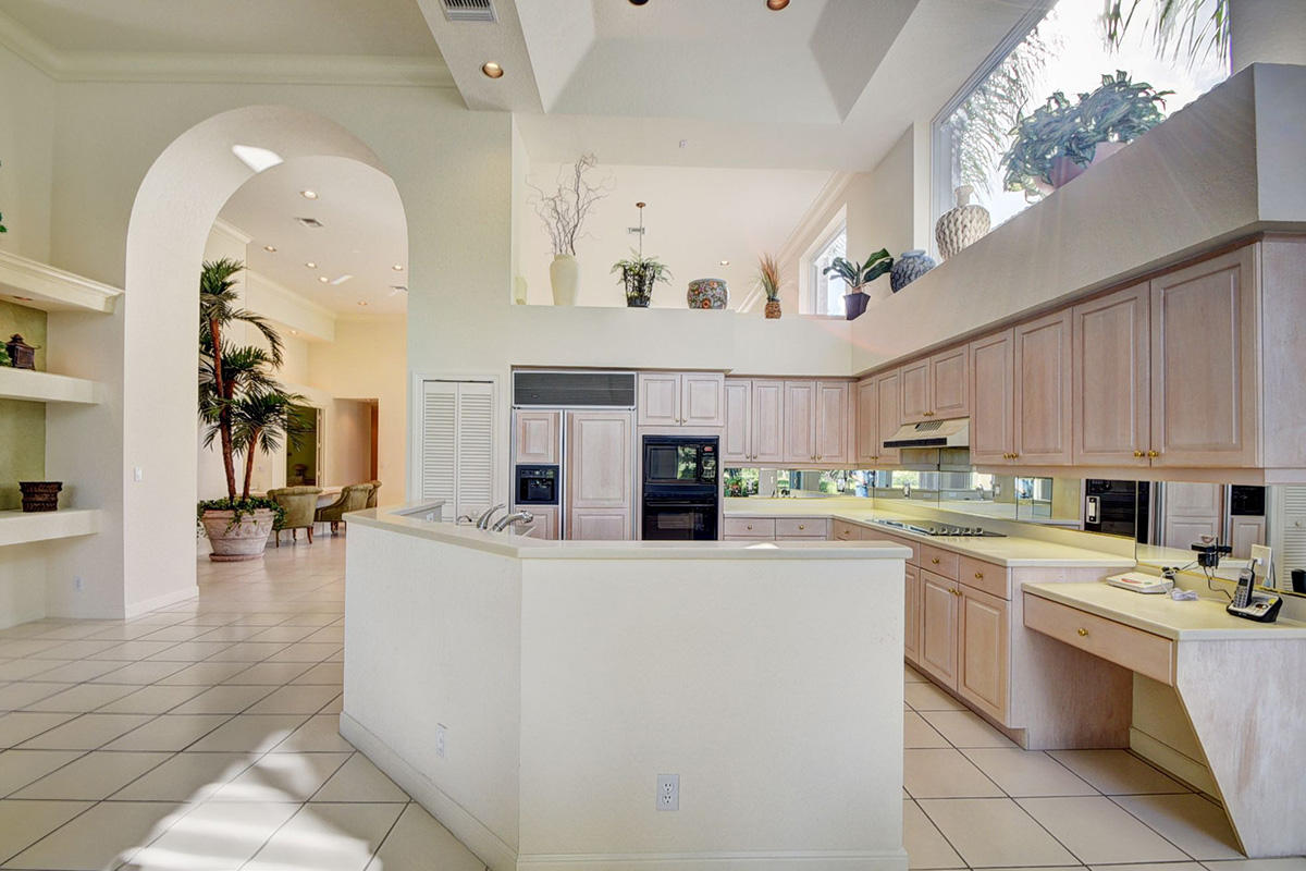 Priced to sell. Enter this beautiful home and be amazed at the open and spacious living areas accentuated by volume ceilings and large, high windows that create a light and bright interior. The island kitchen is open to both an informal dining area and gracious family room - all overlooking the covered patio, pool, spa and gorgeous golf course view. A private, spacious master bedroom also opens to the rear yard. It has two walk-in closets that are custom fit with shelves, drawers and other convenient storage. The master bath with double sinks and separate vanities has marble floors and both a whirlpool style tub and separate shower. An additional bath off the master can easily serve as a cabana bath. The second bedroom is complete with an en-suite bath. A third bedroom faces a picturesque