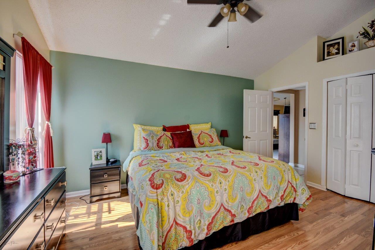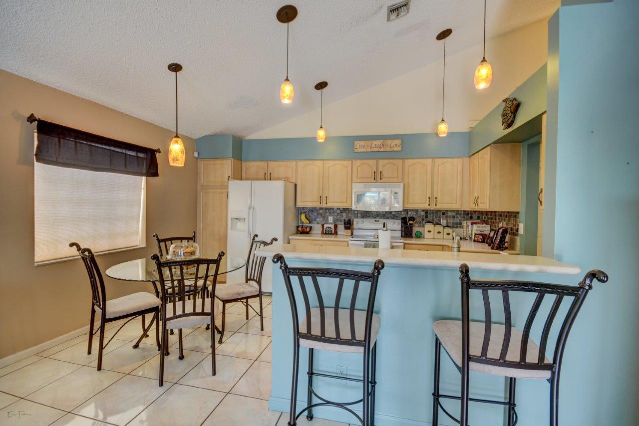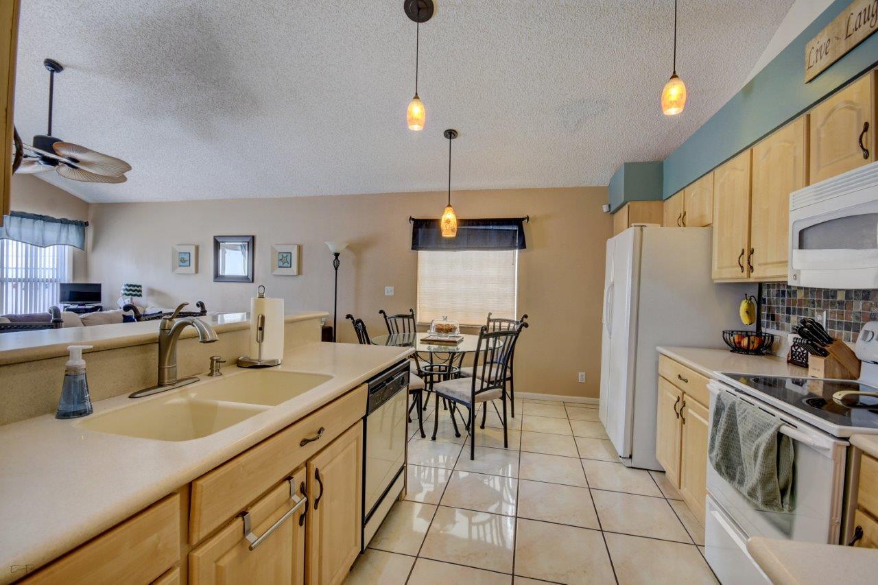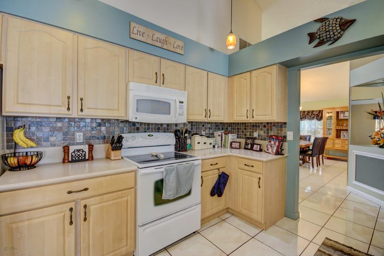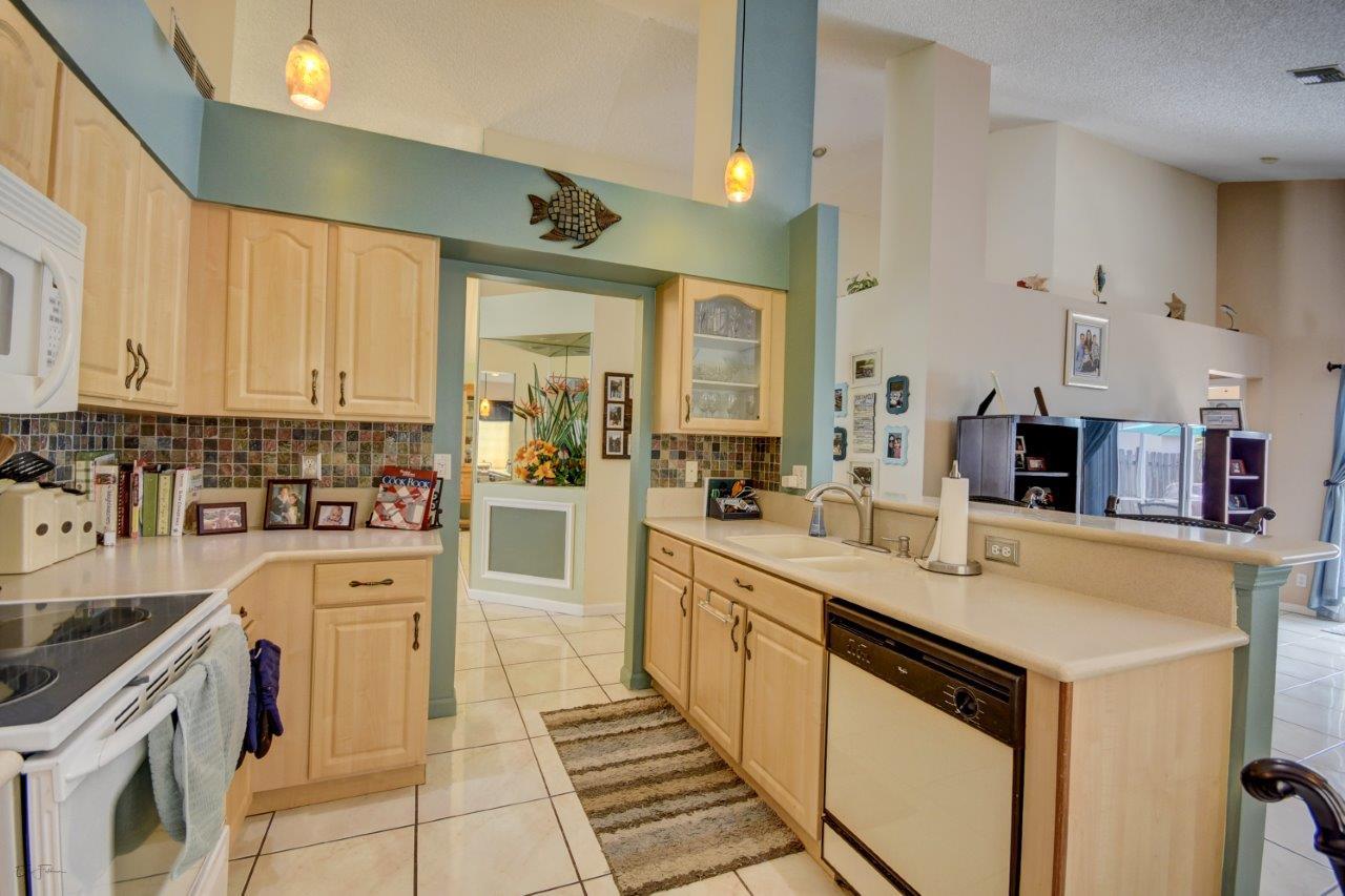 Open bright and spacious 3 bedroom 2 bath move-in ready cul-de-sac home. Beautiful wood cabinets and corian countertops in updated eat-in kitchen. Kitchen has breakfast bar and is open to large family room with vaulted ceilings; 18'' ceramic tile flooring; decorative ceiling fan and walk-out to screened patio that is tiled and partially covered. Entertain in open formal dining/living room. Large master bedroom with updated master bath - granite counters; separate shower and roman tub. 2nd bath also updated with granite and recent skylight. 2nd and 3rd bedrooms are good size and split from master. All bedrooms have quality laminate flooring. Fully fenced back yard with lush landscaping; concrete grilling patio and separate private deck. Accordian hurricane shutters.