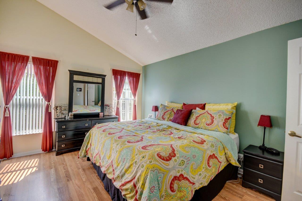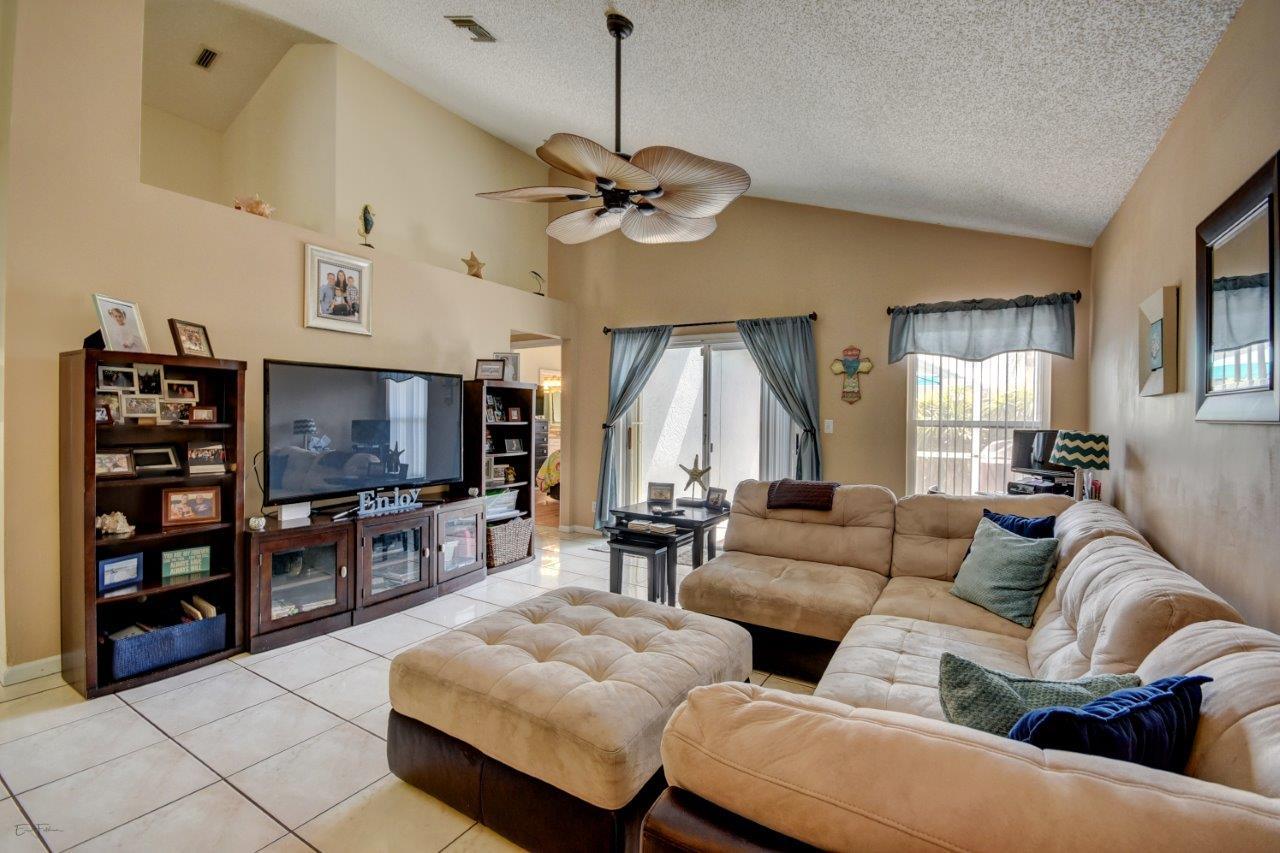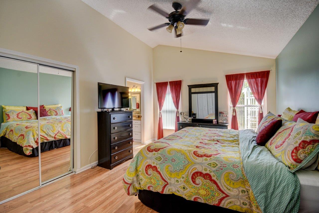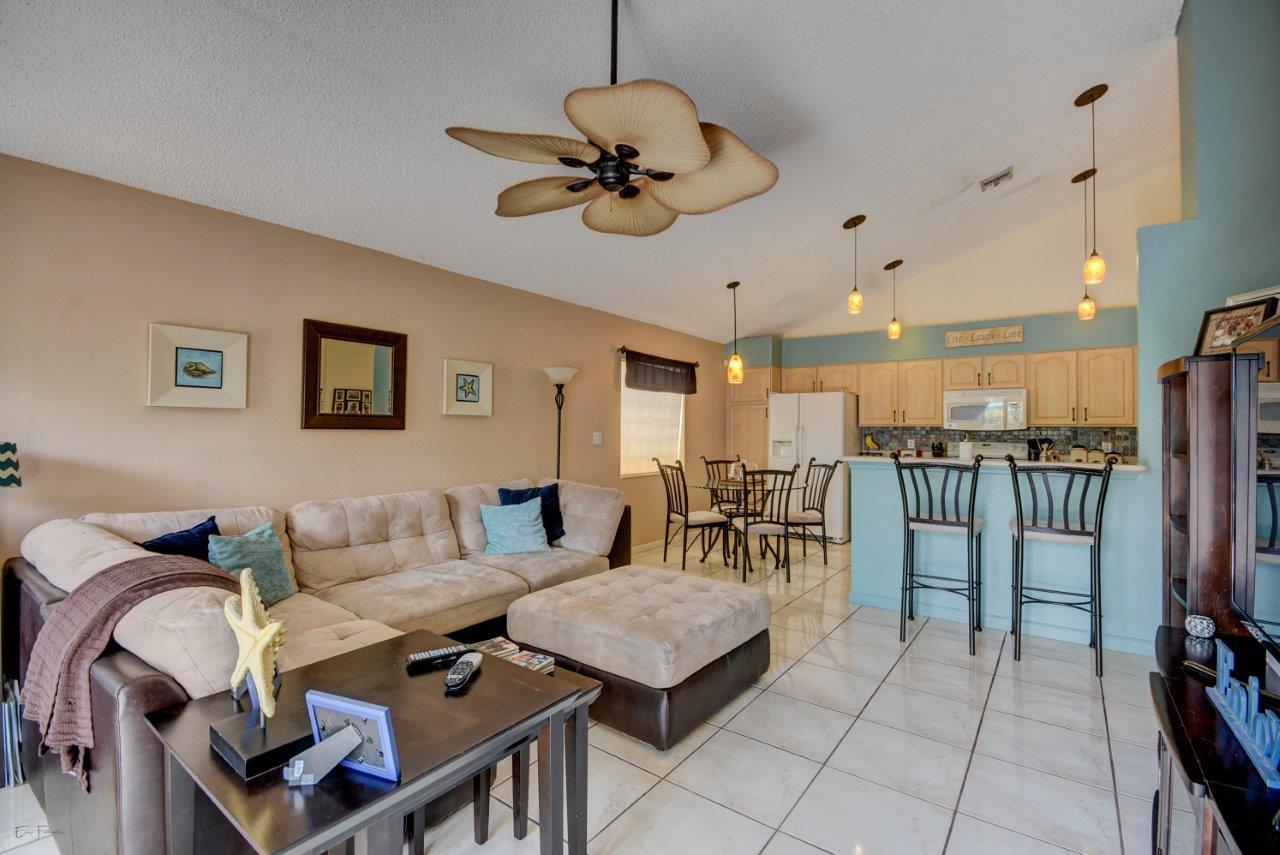 Open bright and spacious 3 bedroom 2 bath move-in ready cul-de-sac home. Beautiful wood cabinets and corian countertops in updated eat-in kitchen. Kitchen has breakfast bar and is open to large family room with vaulted ceilings; 18'' ceramic tile flooring; decorative ceiling fan and walk-out to screened patio that is tiled and partially covered. Entertain in open formal dining/living room. Large master bedroom with updated master bath - granite counters; separate shower and roman tub. 2nd bath also updated with granite and recent skylight. 2nd and 3rd bedrooms are good size and split from master. All bedrooms have quality laminate flooring. Fully fenced back yard with lush landscaping; concrete grilling patio and separate private deck. Accordian hurricane shutters.